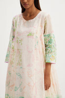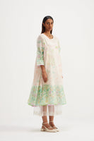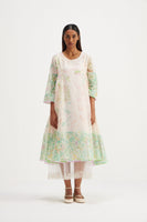 Panelled midi dress in all over hand block floral print with contrast border print detail. Comes with an attached printed text lining.