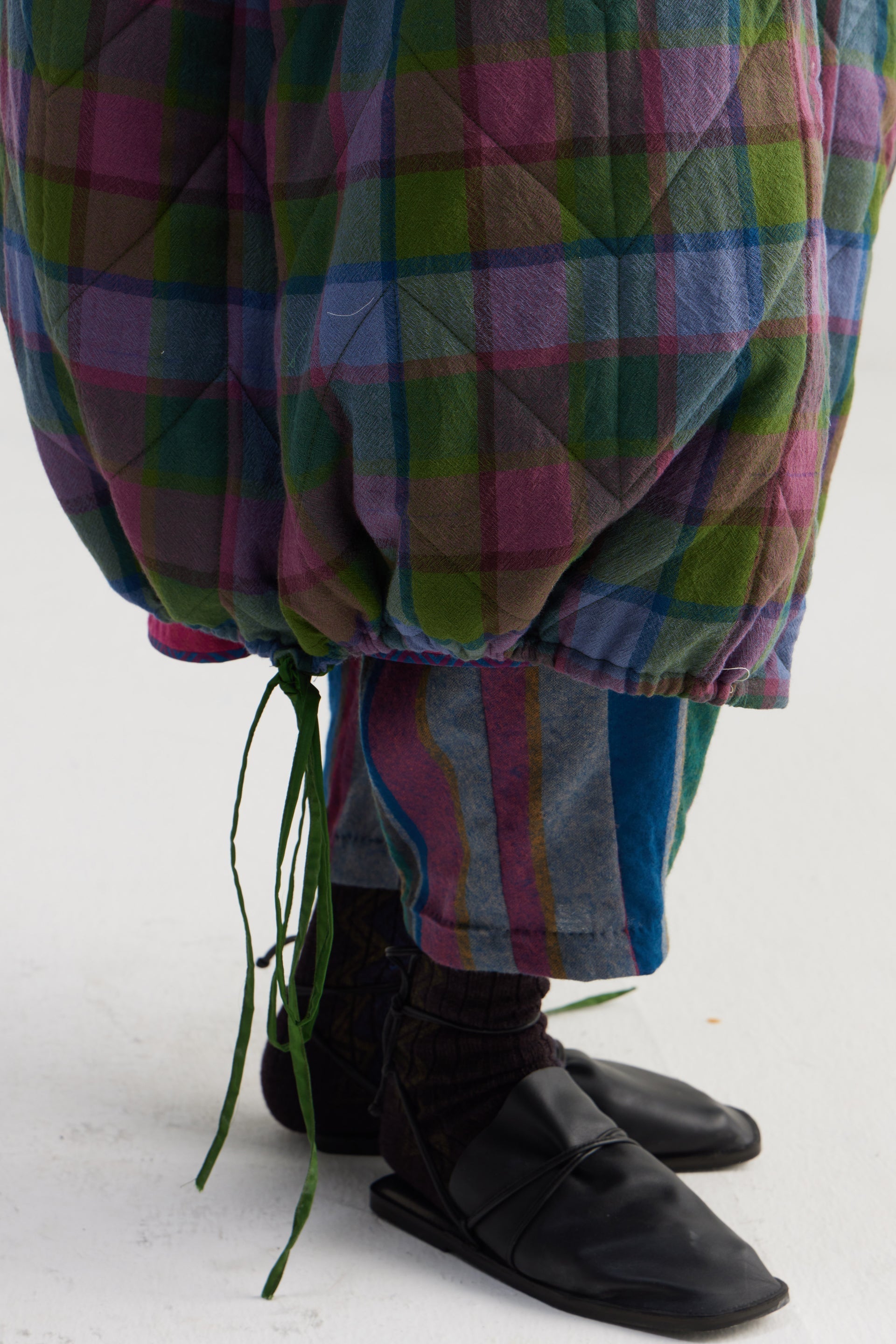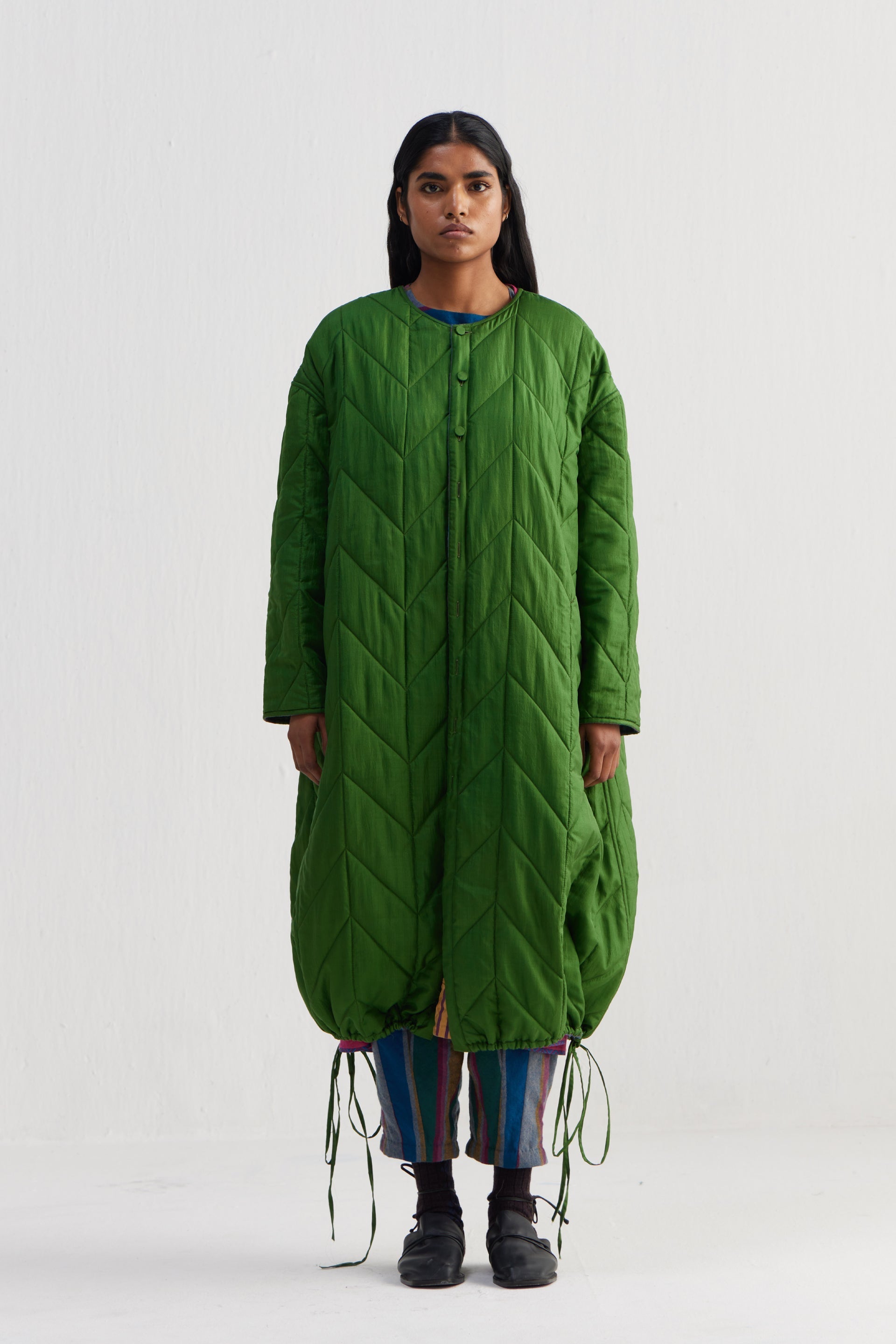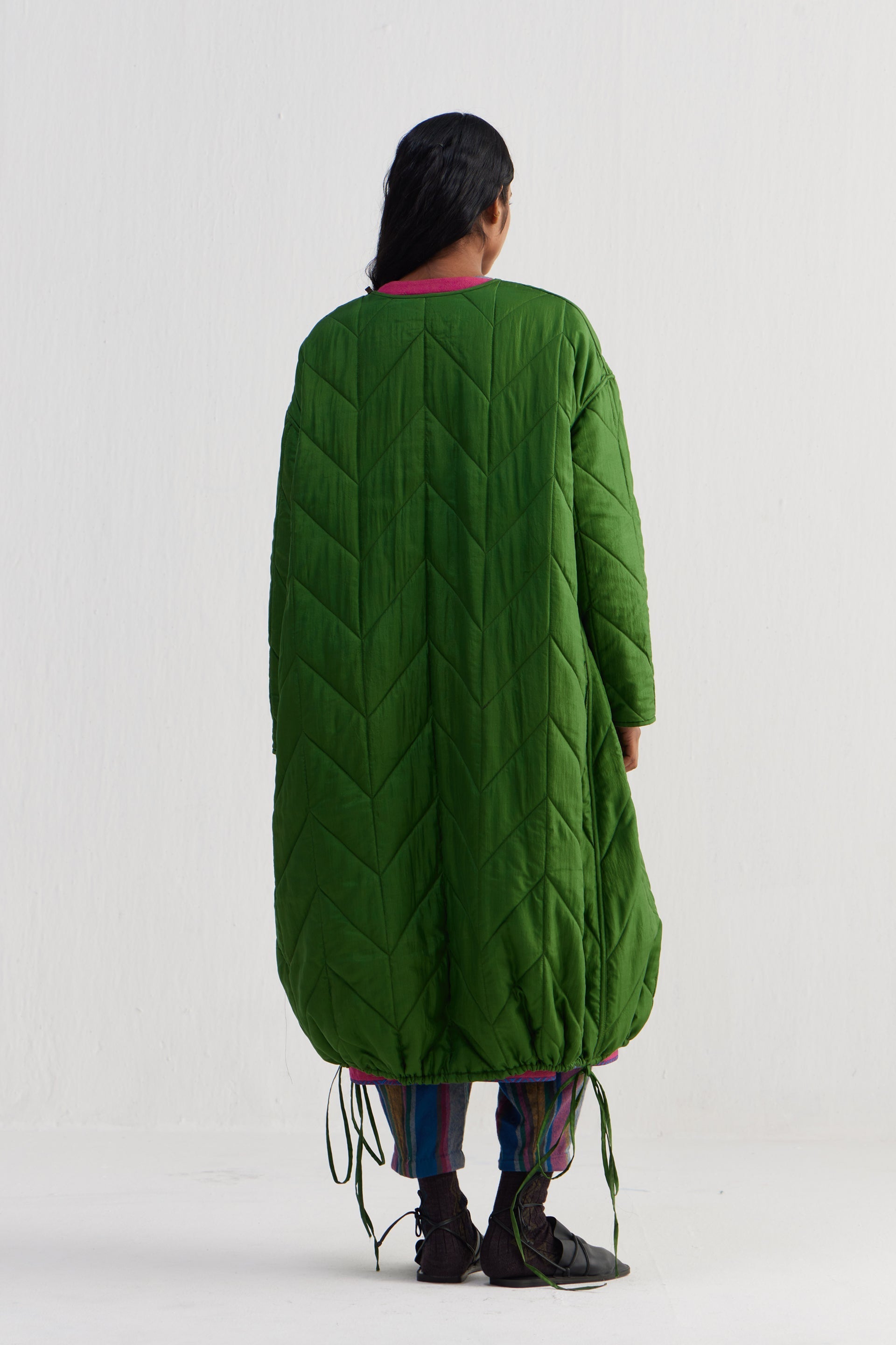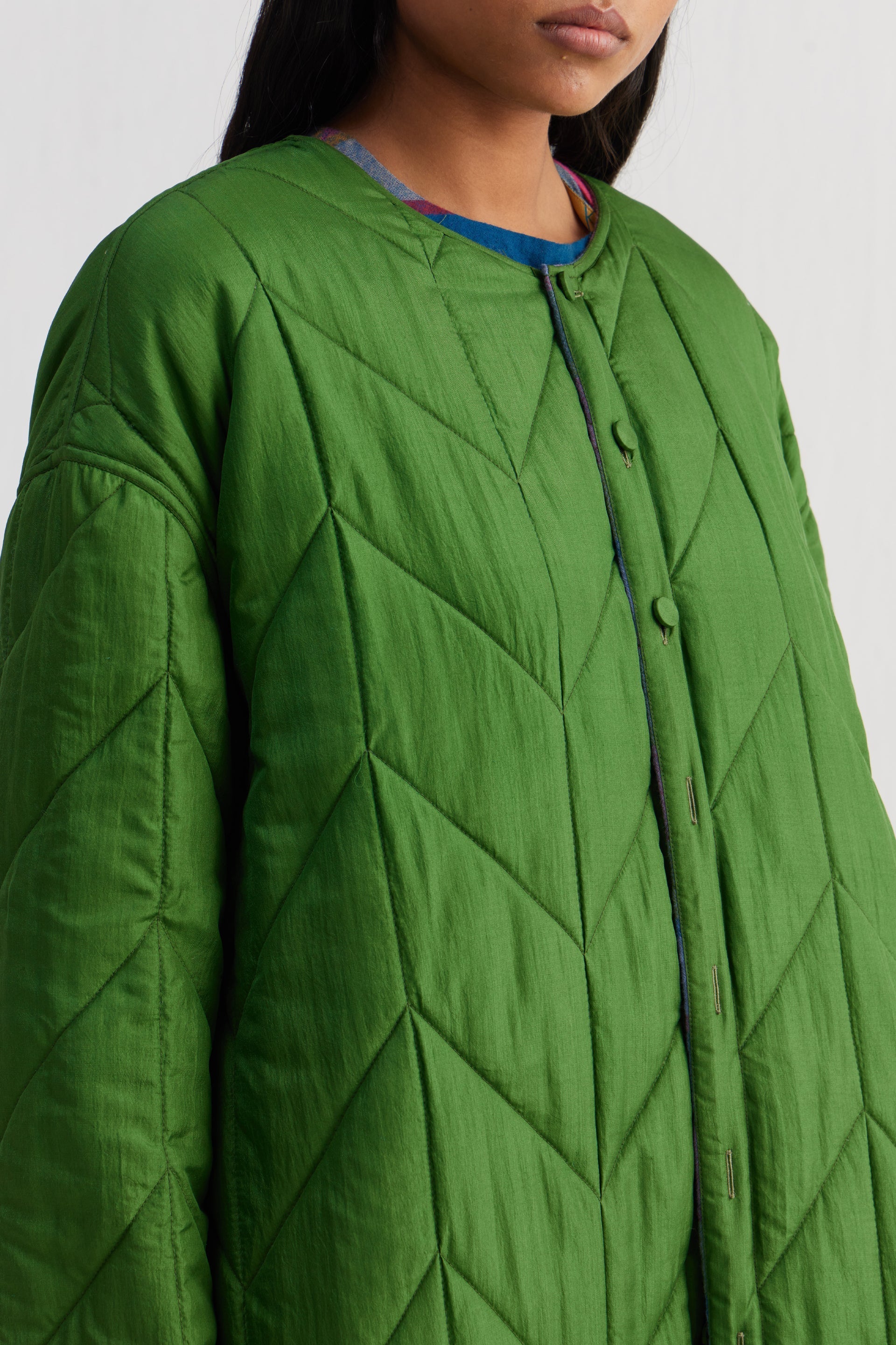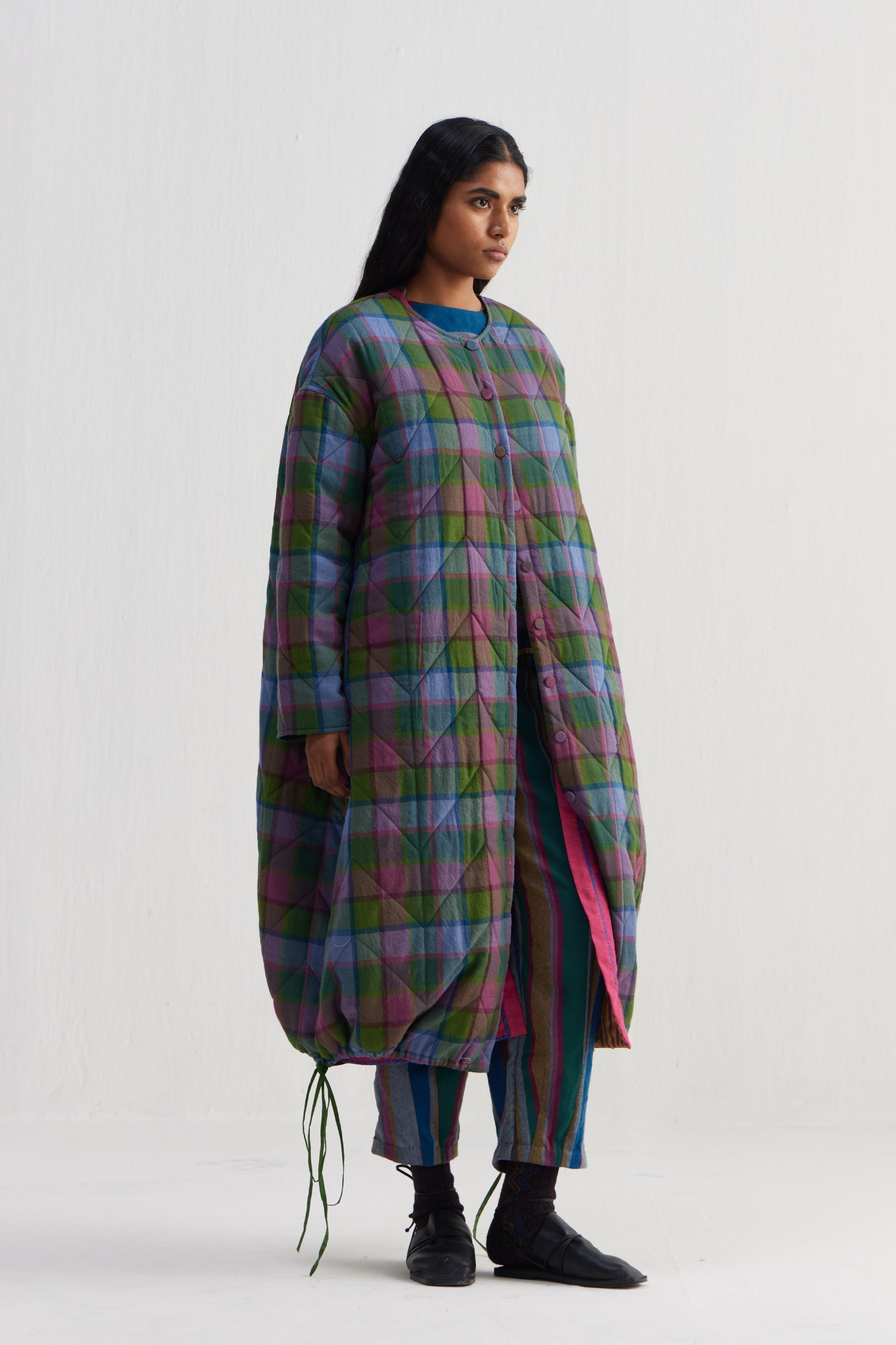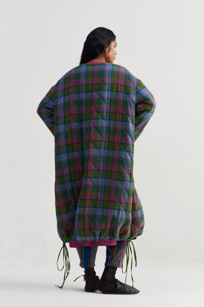 Reversible round neckline front open button down full sleeves jacket with all over quilting, with front welt pocket and drawstring detail on hem. Constructed in multicolor checkered 100% merino wool and solid 100% silk fabric.