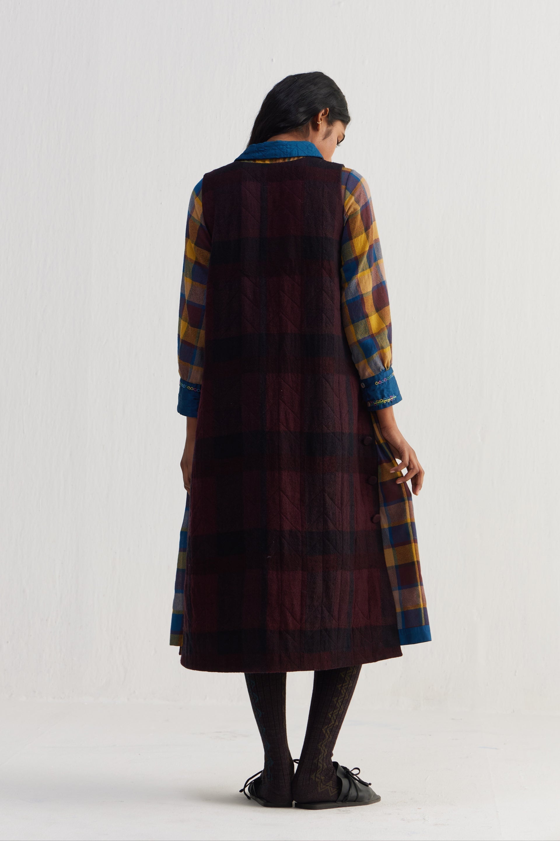 Round neckline sleeveless quilted dress with button-down side seam placket. Constructed in checkered 100% merino wool. Finished with collage handblock print 100% silk fabric facing detail.