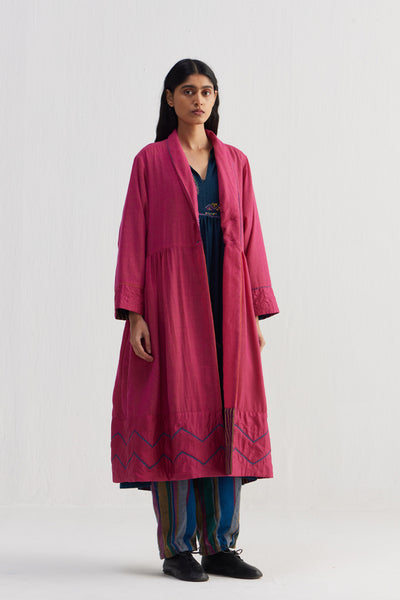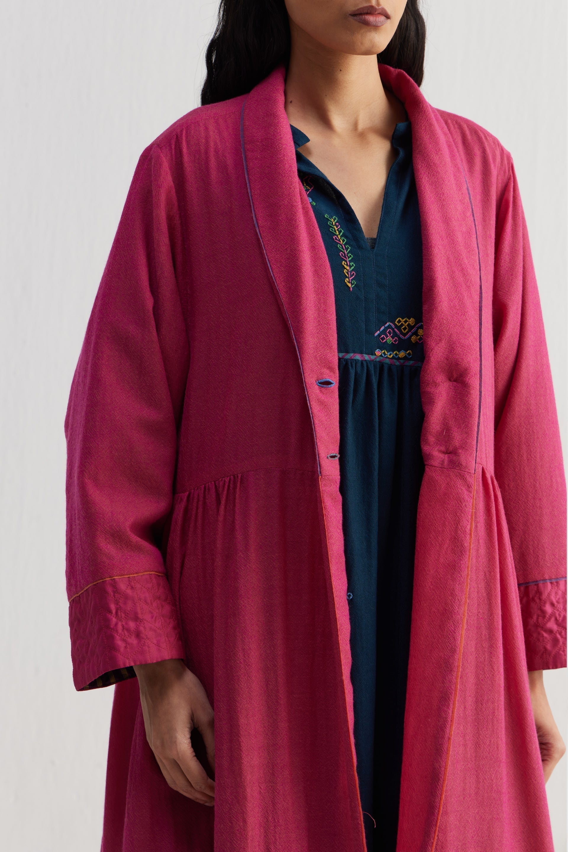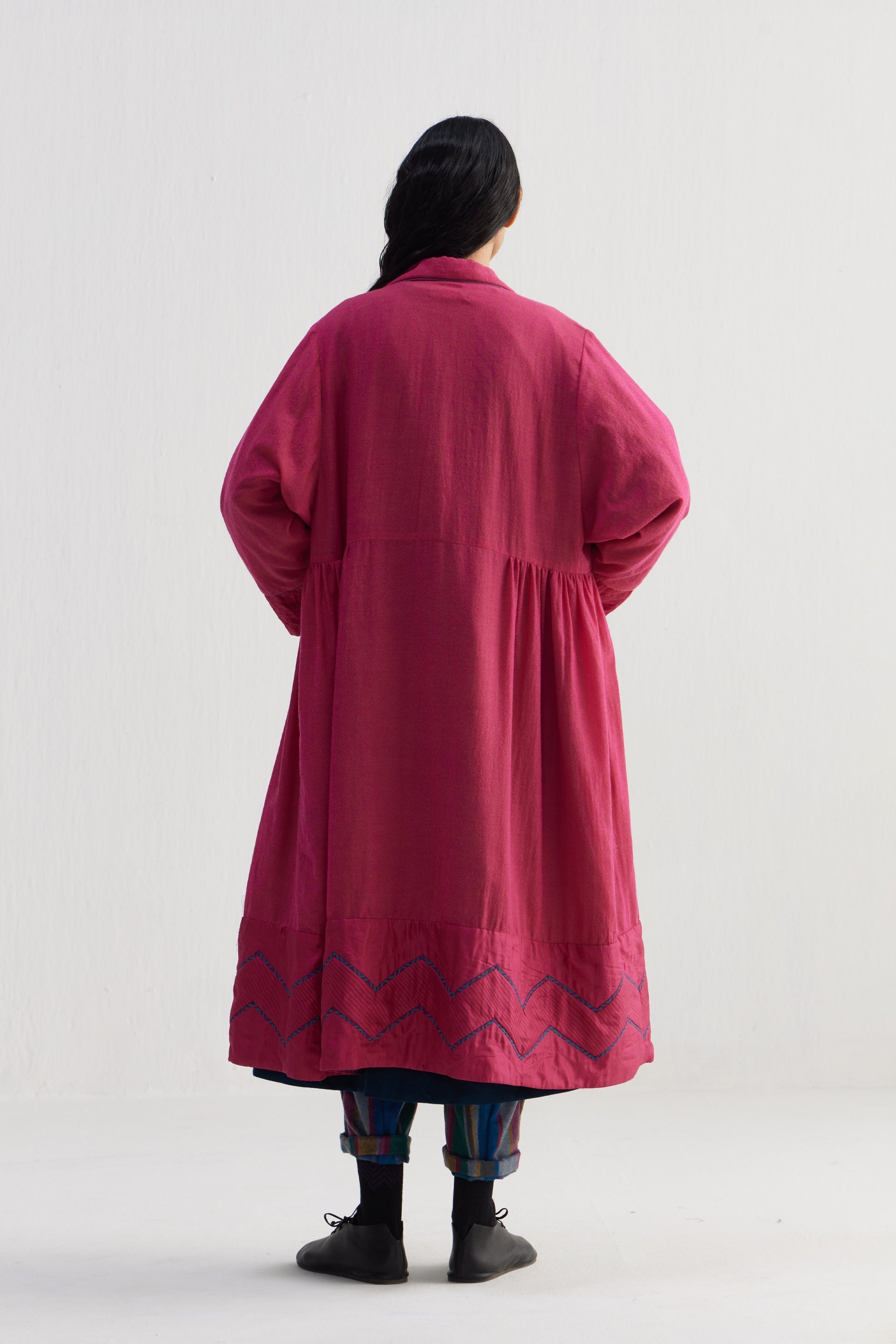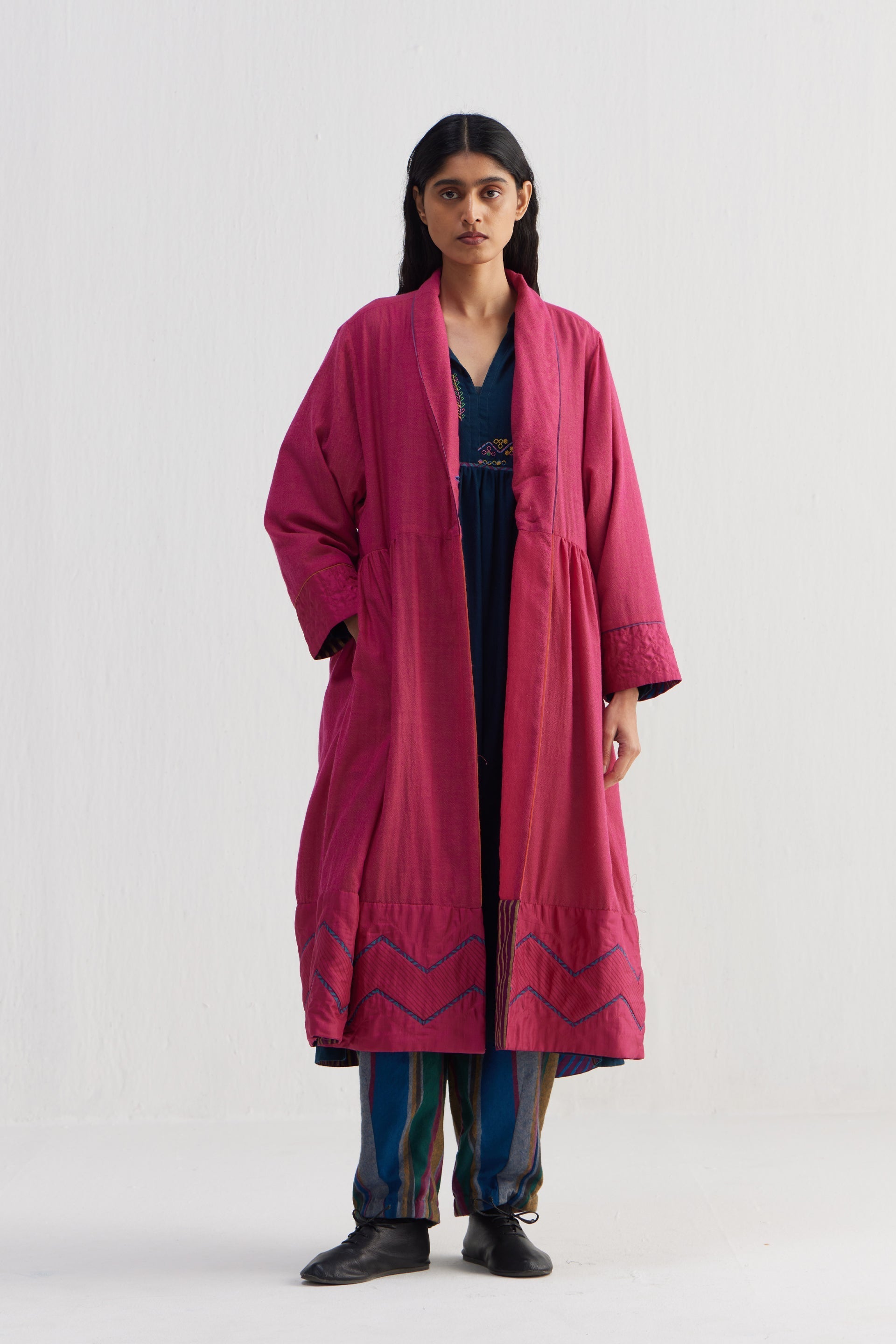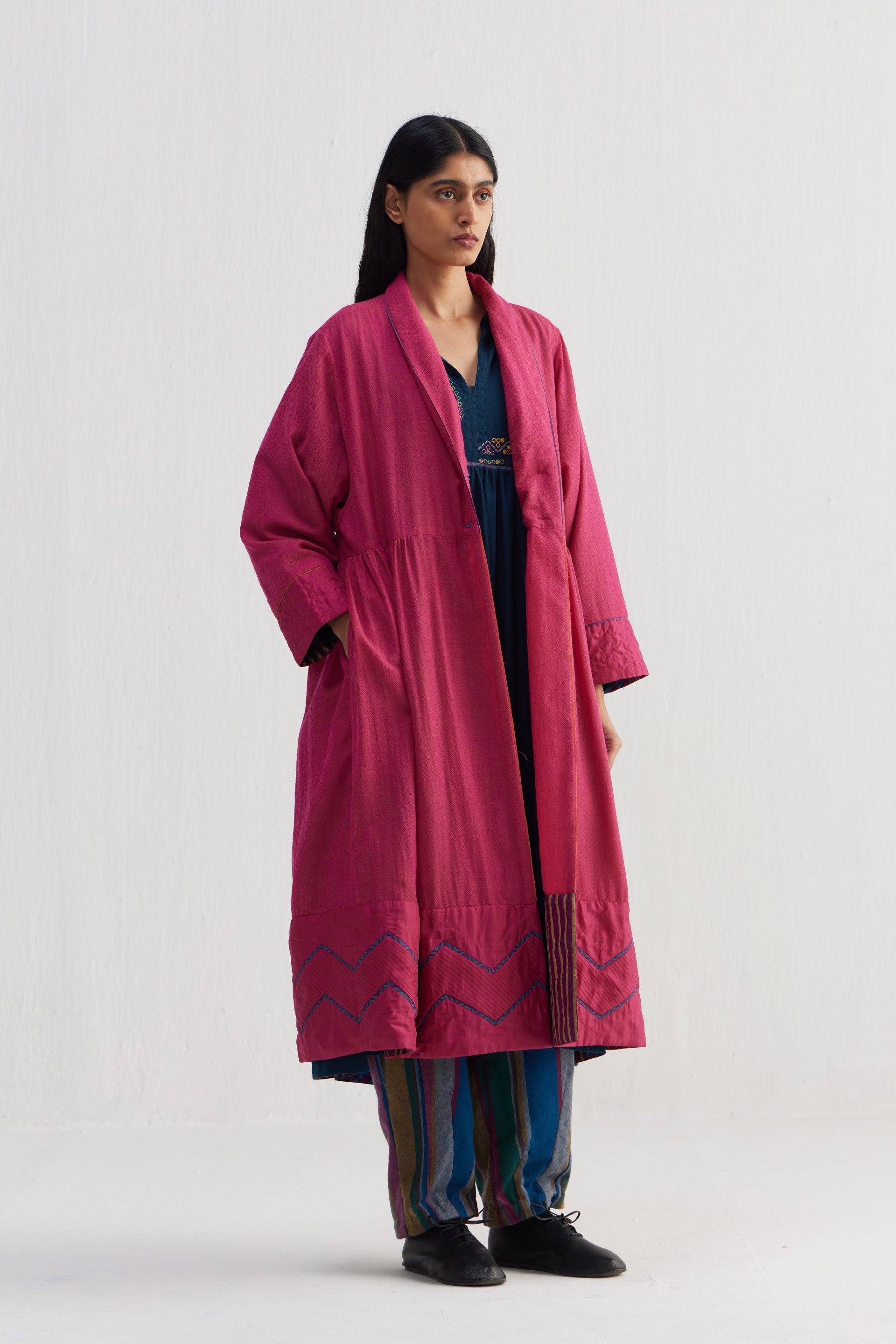 Patchwork relaxed fit shawl collar long jacket. Constructed in solid 100% wool and solid quilted 100% silk fabric. Finished with contrast collage handblock print 100% silk lining and contrast chevron 100% silk piping insert on the seams.