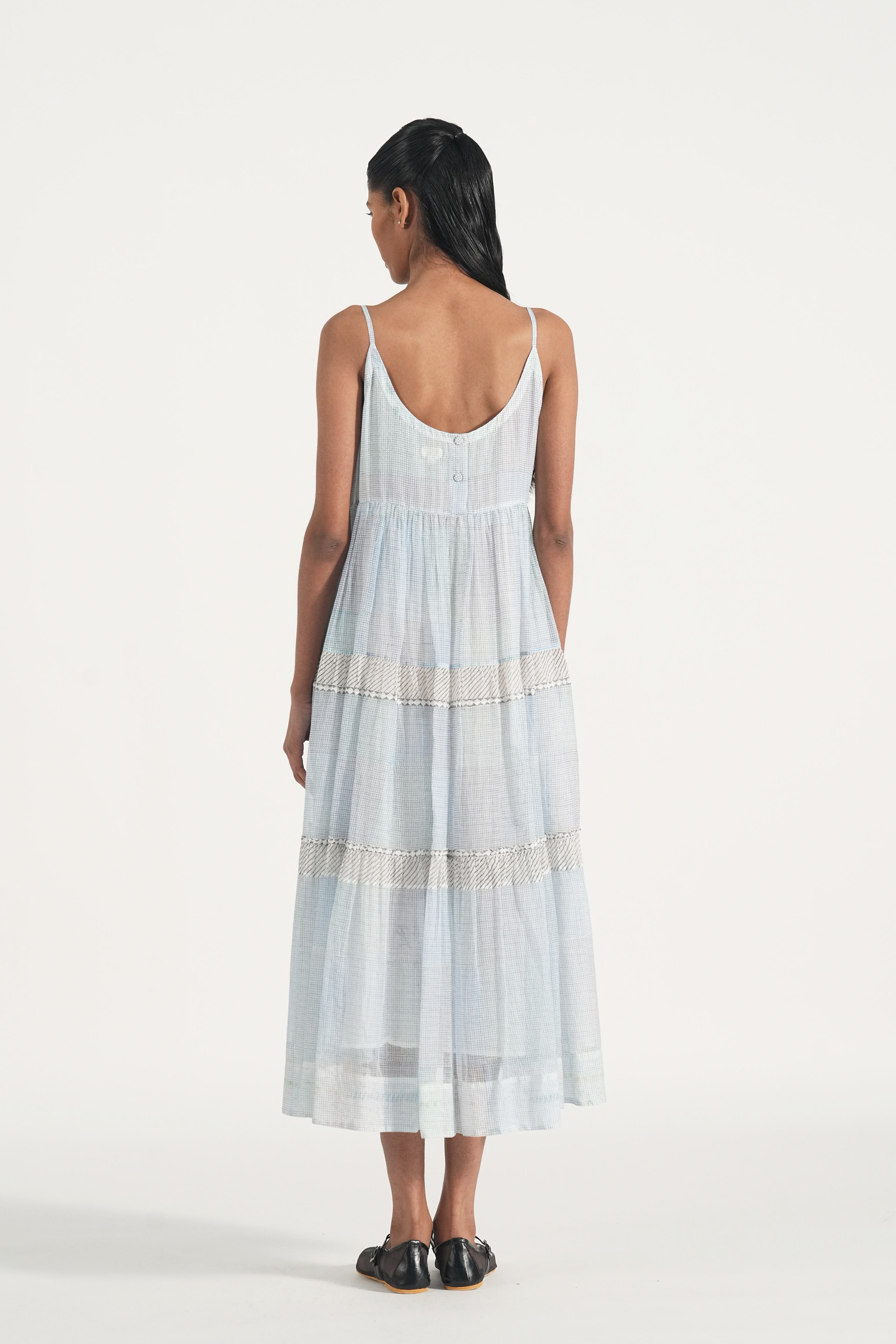 Spaghetti strap summer dress, intricate hand block printed multi-check pattern lined in co-silk.