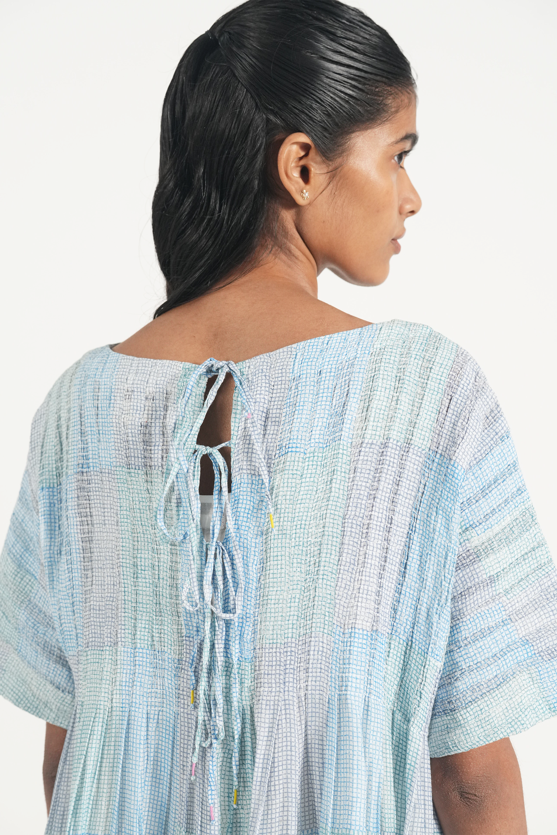 Smocked and panelled maxi dress in multi color hand block printed graph checks and diagonal. Comes with a complimentary lining.