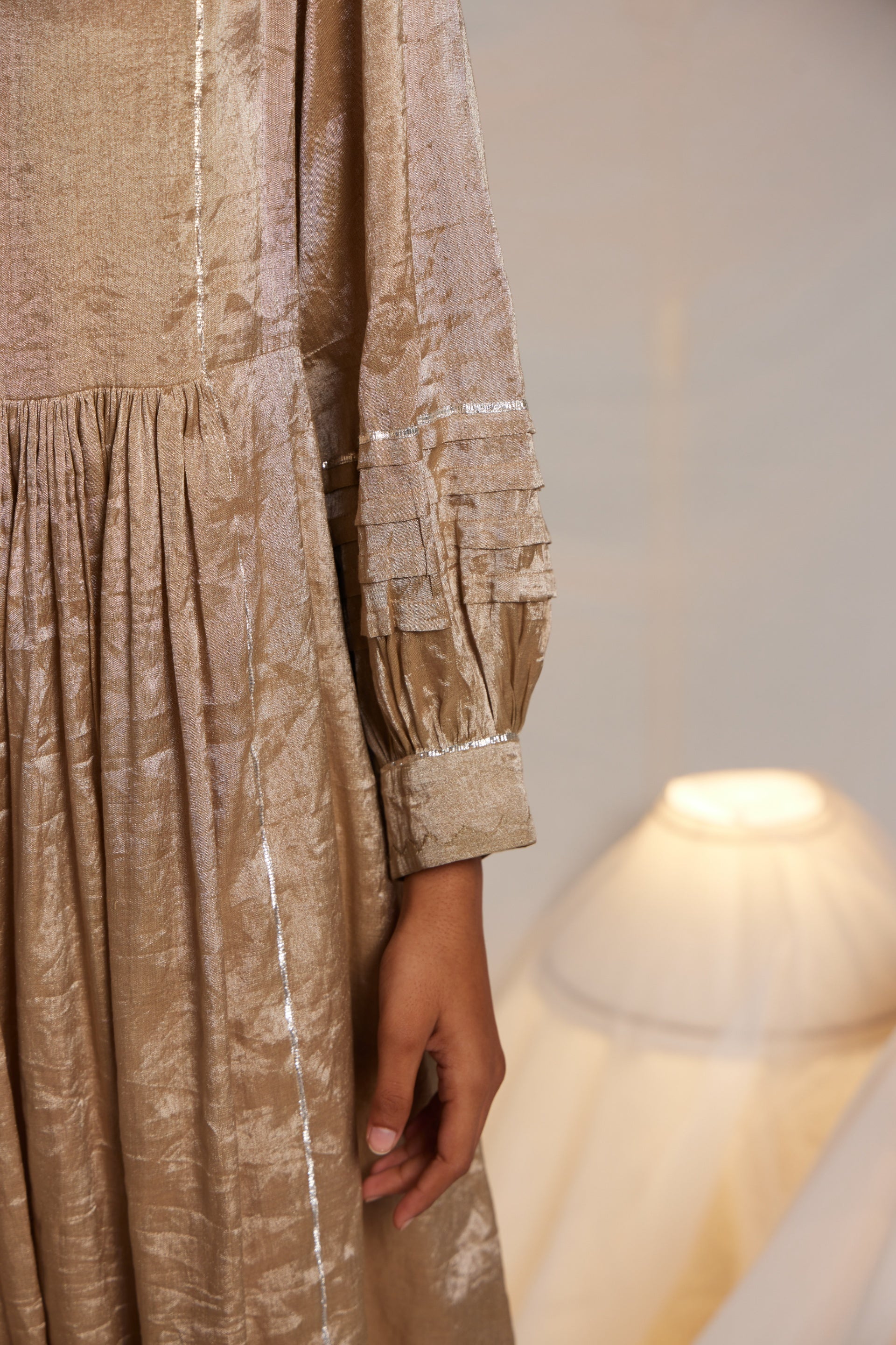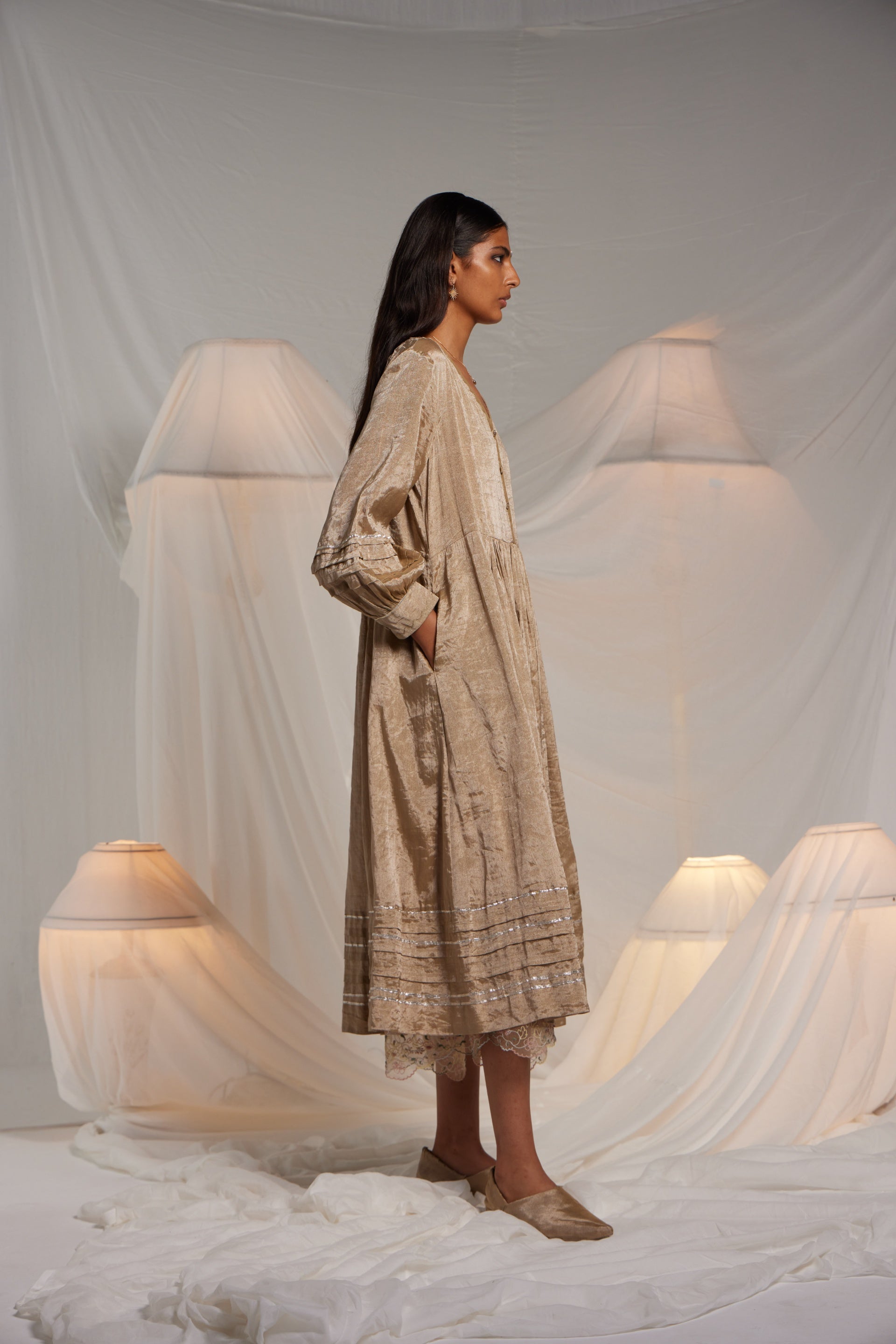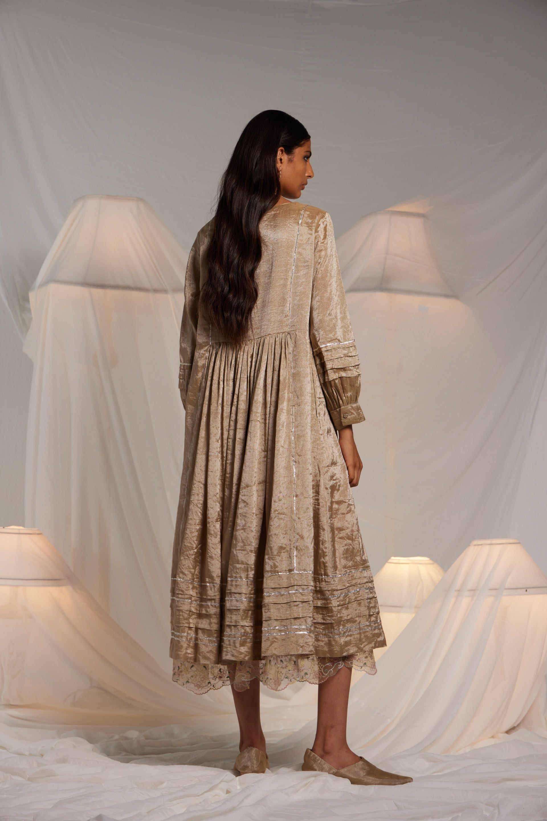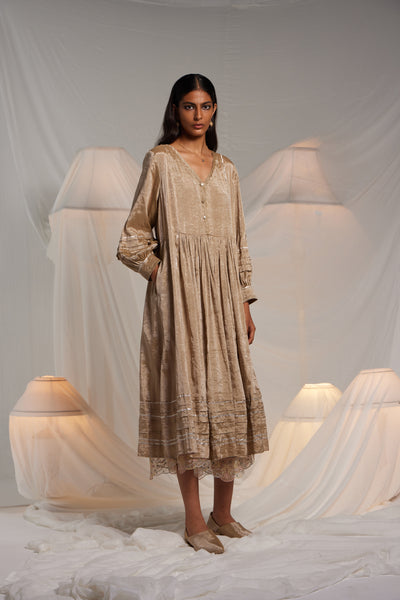Midi length waist gathered dress with an exquisite chevron hand applique on the front neckline and cuff edges. Metallic gota finish the piece through out in seams, sleeves and hem. Semi fitted flare midi length dress. Comes along with a pair of straight fit pants with gota details in the side seam