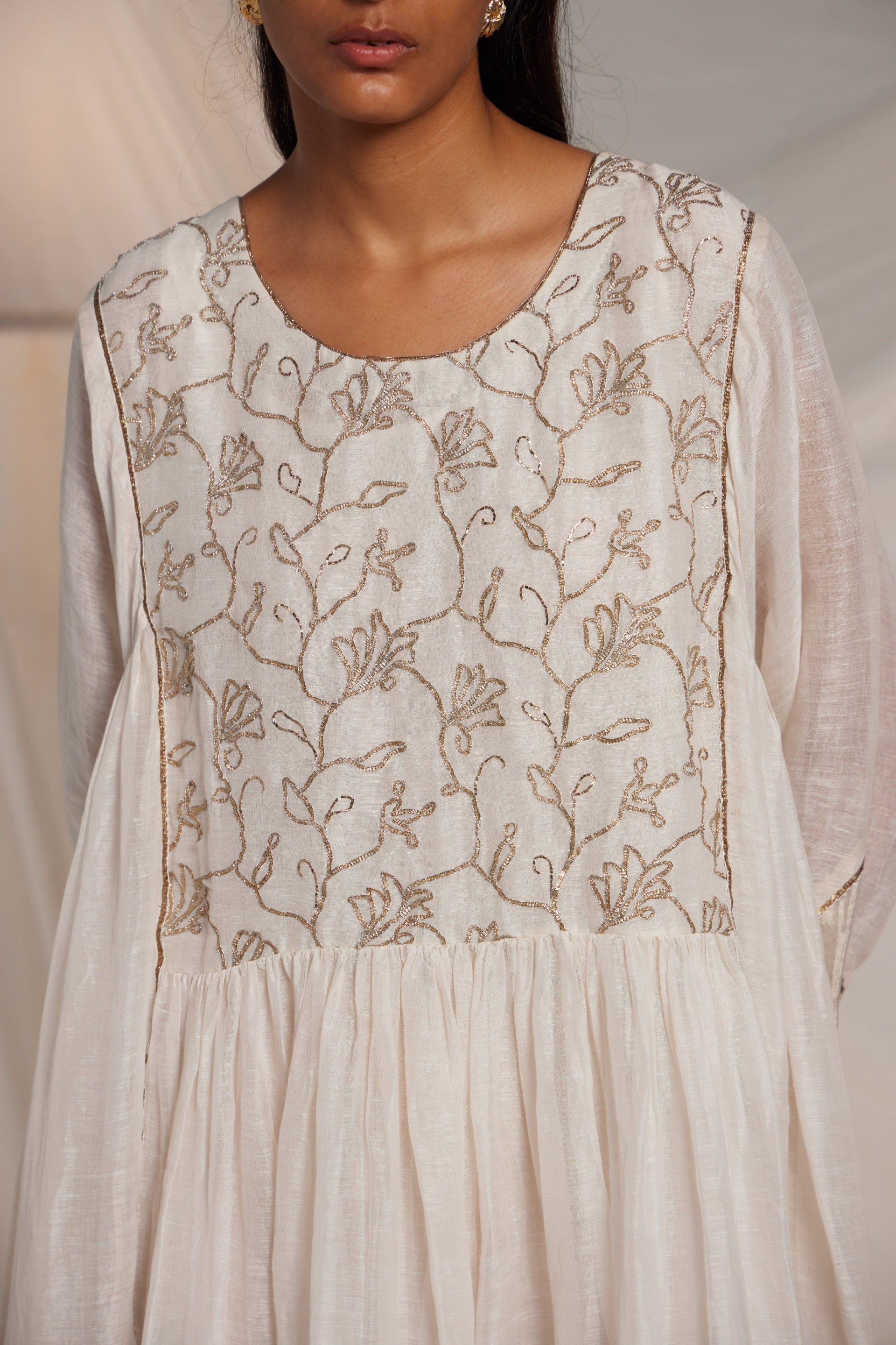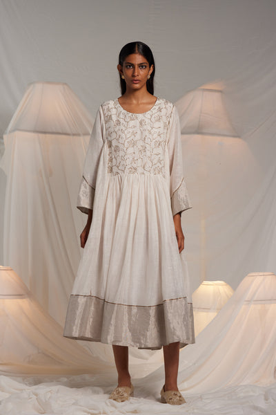 A silk linen gathered kurta dress fits away from the body flare midi length dress. With intricate gota embroidered motifs on the yoke. silver linen zari tissue finishes the hem and sleeves with metallic gota joineries. Comes along with a separate cotton silk lining.
