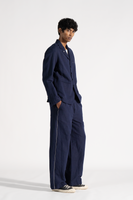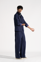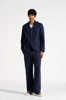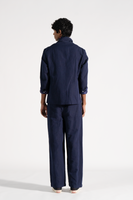 Notch collar button down full sleeve round hem straight fit jacket with flap pockets in 100% linen, comes with an attached handblock print silk lining.