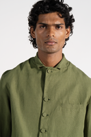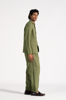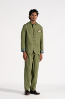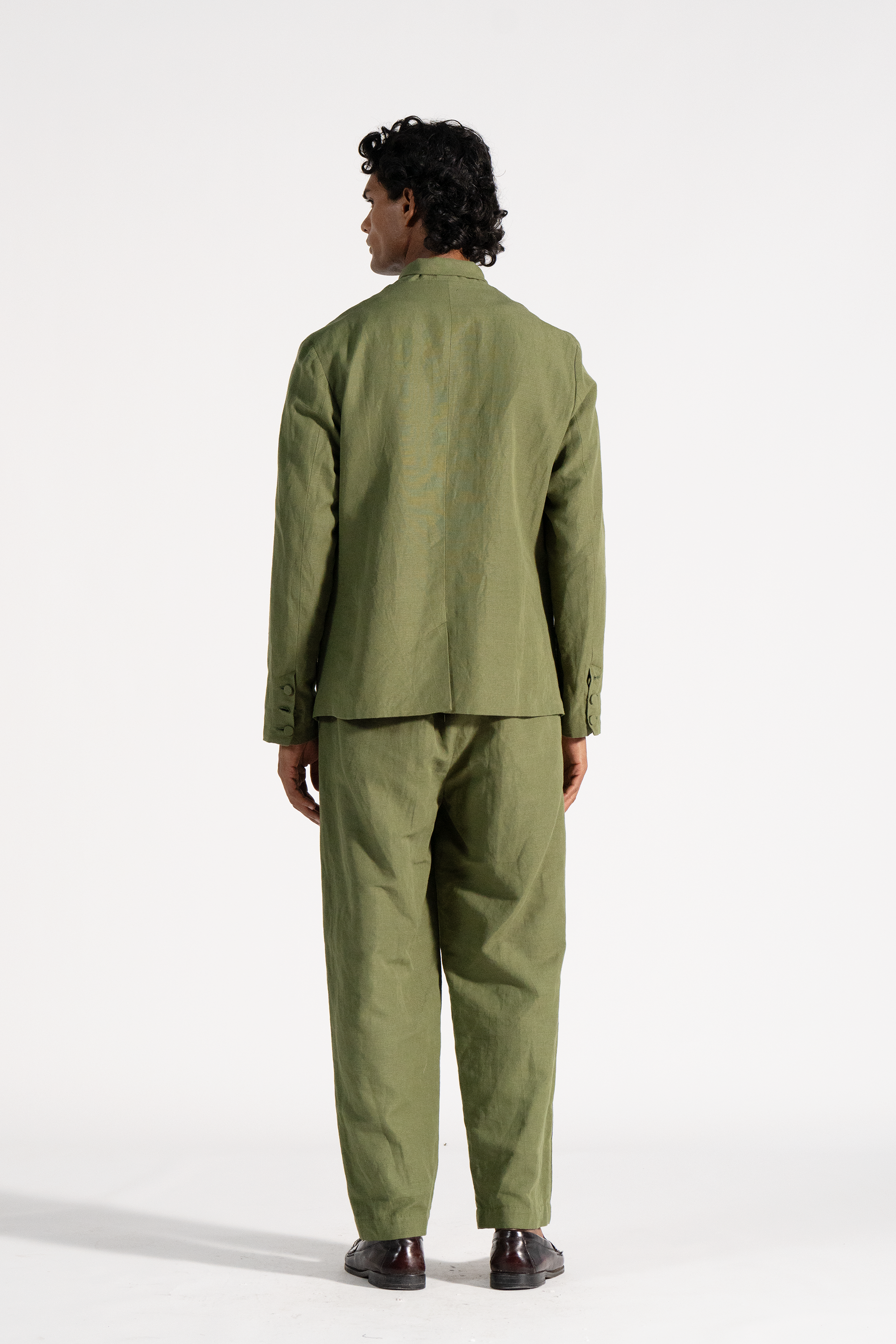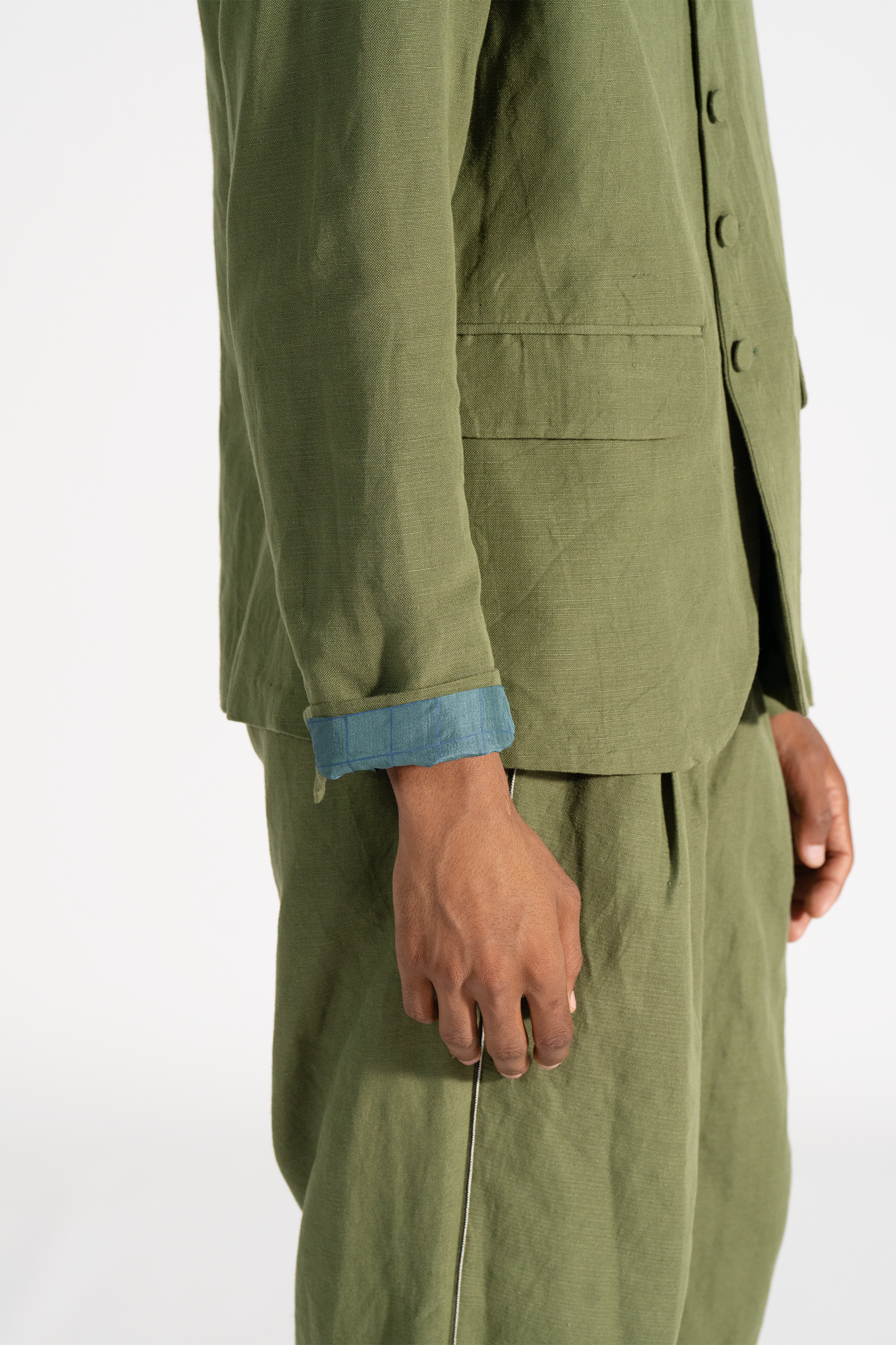 Notch collar button down full sleeve round hem straight fit jacket with flap pockets in 100% linen, comes with an attached handblock print silk lining.