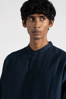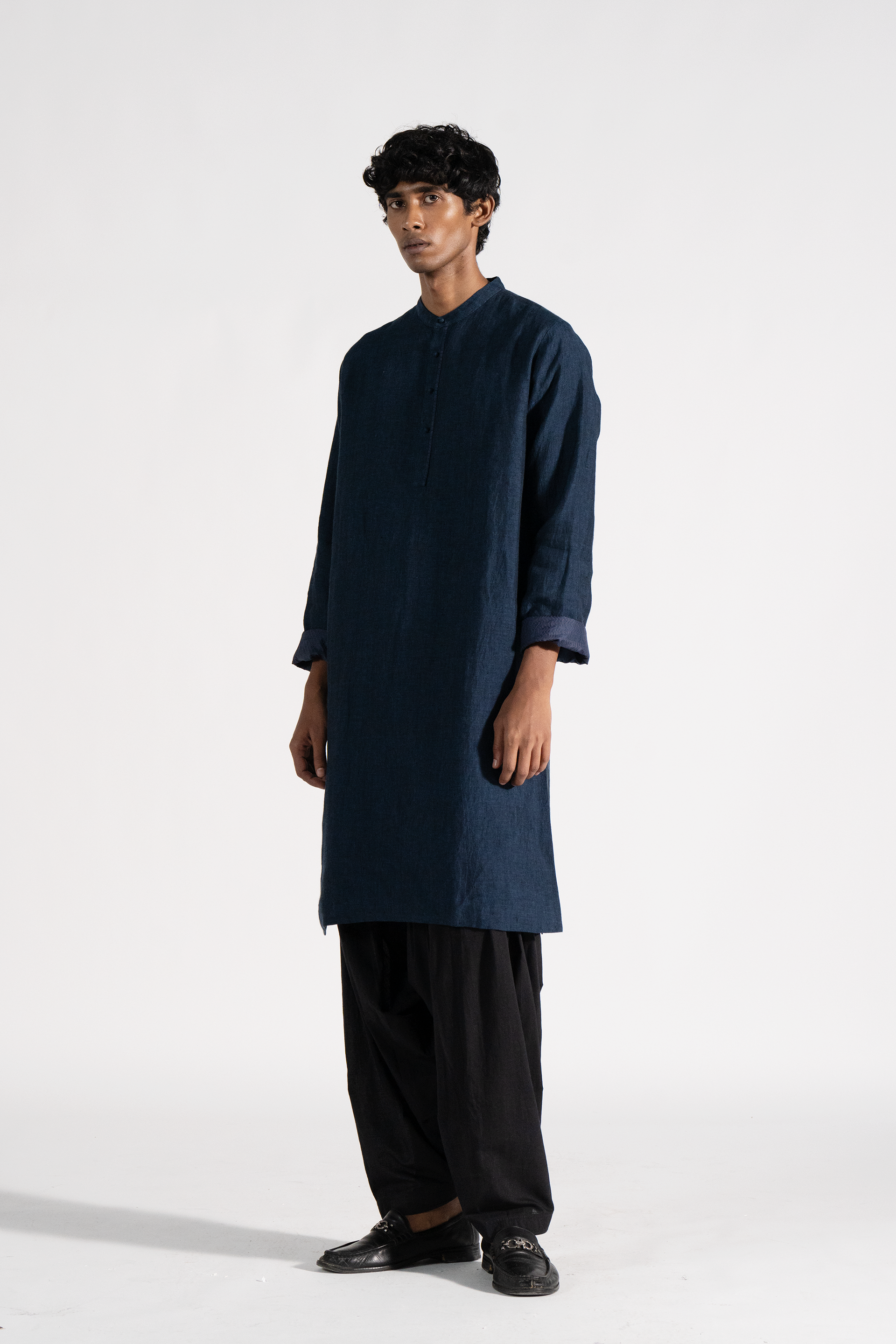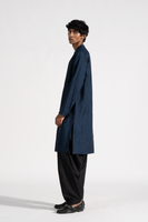 Mandarin collar front placket full sleeve long kurta with attached printed silk lining .