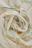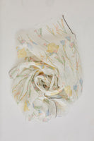 White handwoven linen gauze stole, hand block printed with over 5 different colours to create delicate floral motifs, with edges finished by hand stitch