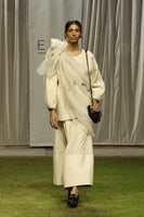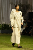 Ola top paired with clio skirt, styled with an organza smocked stole with a black sling bag featuring chamba embroidery.