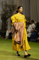 Dress with ruffle detailing and contrasting handblock-printed binding, styled with a chunky checks coat.