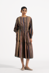 Gathered waist hand block-printed striped dress with a separate organza ruffle lining in cotton silk.