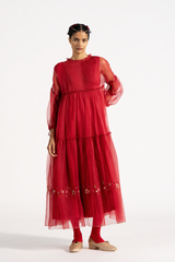 Pin-tucked tiered dress with embroidery detail, paired with a chunky check woolen skirt and styled with organza scarf and bag featuring placement embroidery.