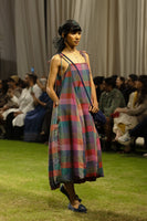 A strappy balloon dress in handwoven checks, styled with a delicate organza potli bag featur ing intricate placement hand embroidery.