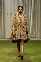 Handwoven printed wool dress featuring attached organza detail.