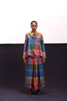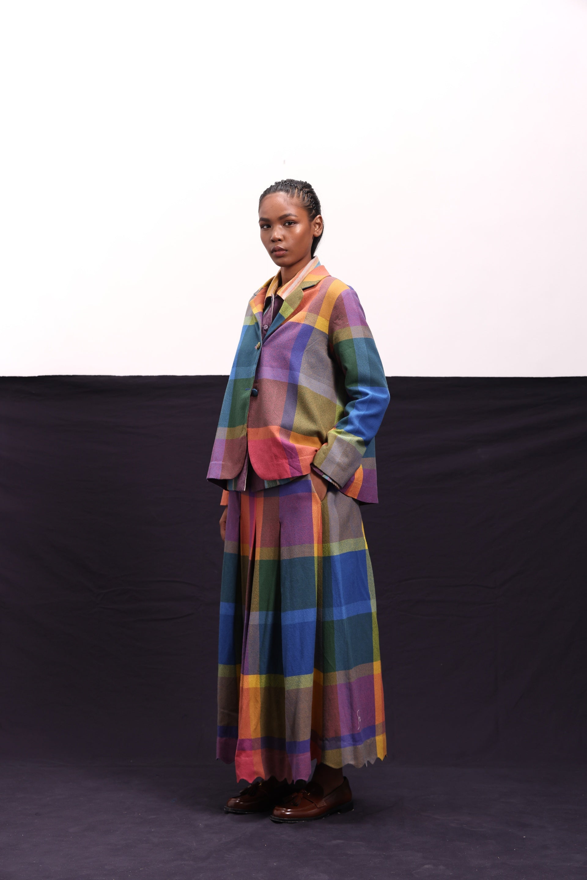 Pleated skirt constructed in chunky checkered wool with scallop detail. Comes with an attached hand block printed silk lining.