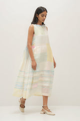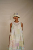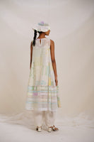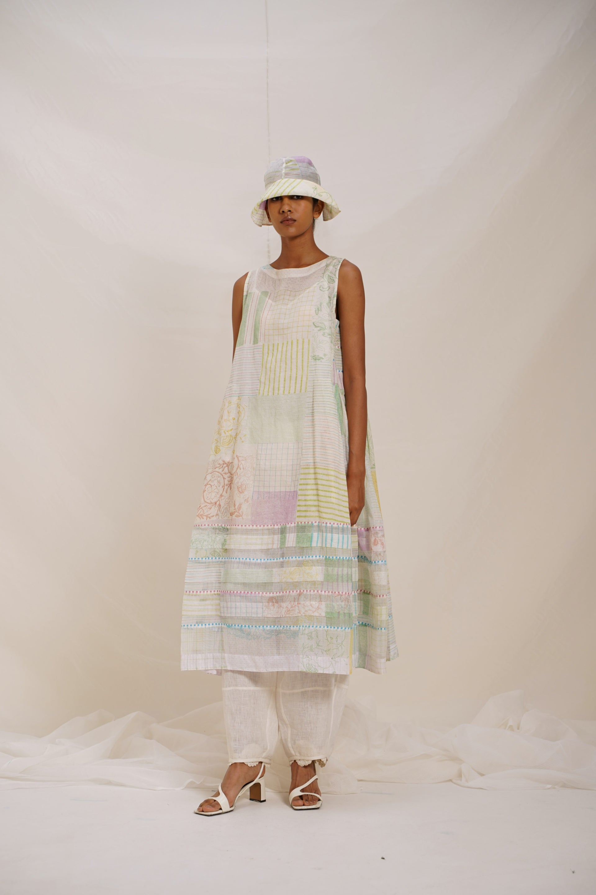 Sleeveless dress adorned with an intricate all-over hand block print mix collage, exuding a fusion of patterns and colours for a captivating look. The addition of striped printed piping adds a stylish contrast, enhancing the overall appeal of the dress.