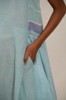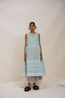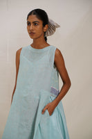 Striking contrast piping and intricate chevron appliqué detail. Adorned with a hand block printed striper print design. The gathered panel on the side seams enhances the flattering fit and adds an element of fluidity to the design.