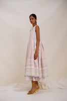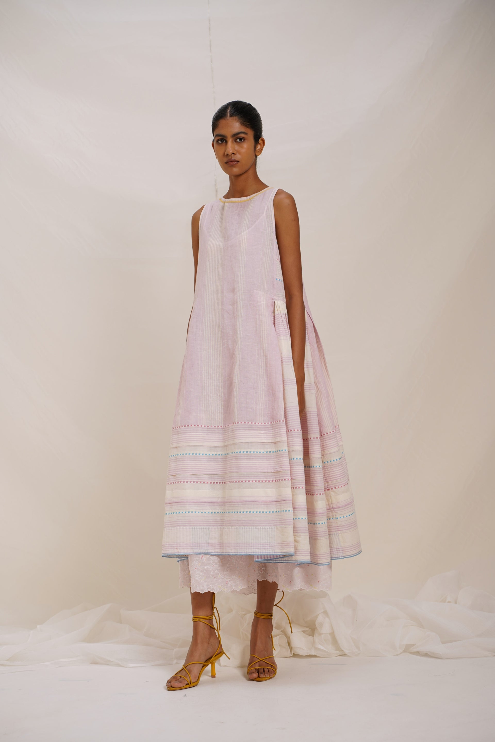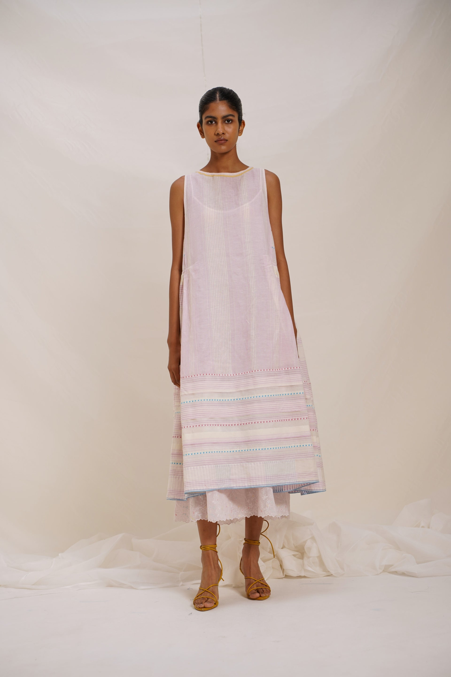 Sleeveless Striper Dress, dress features a sophisticated handblock print with contrasting striper piping. The gathered panel on the side seams adds subtle detailing and enhances the overall silhouette.