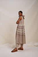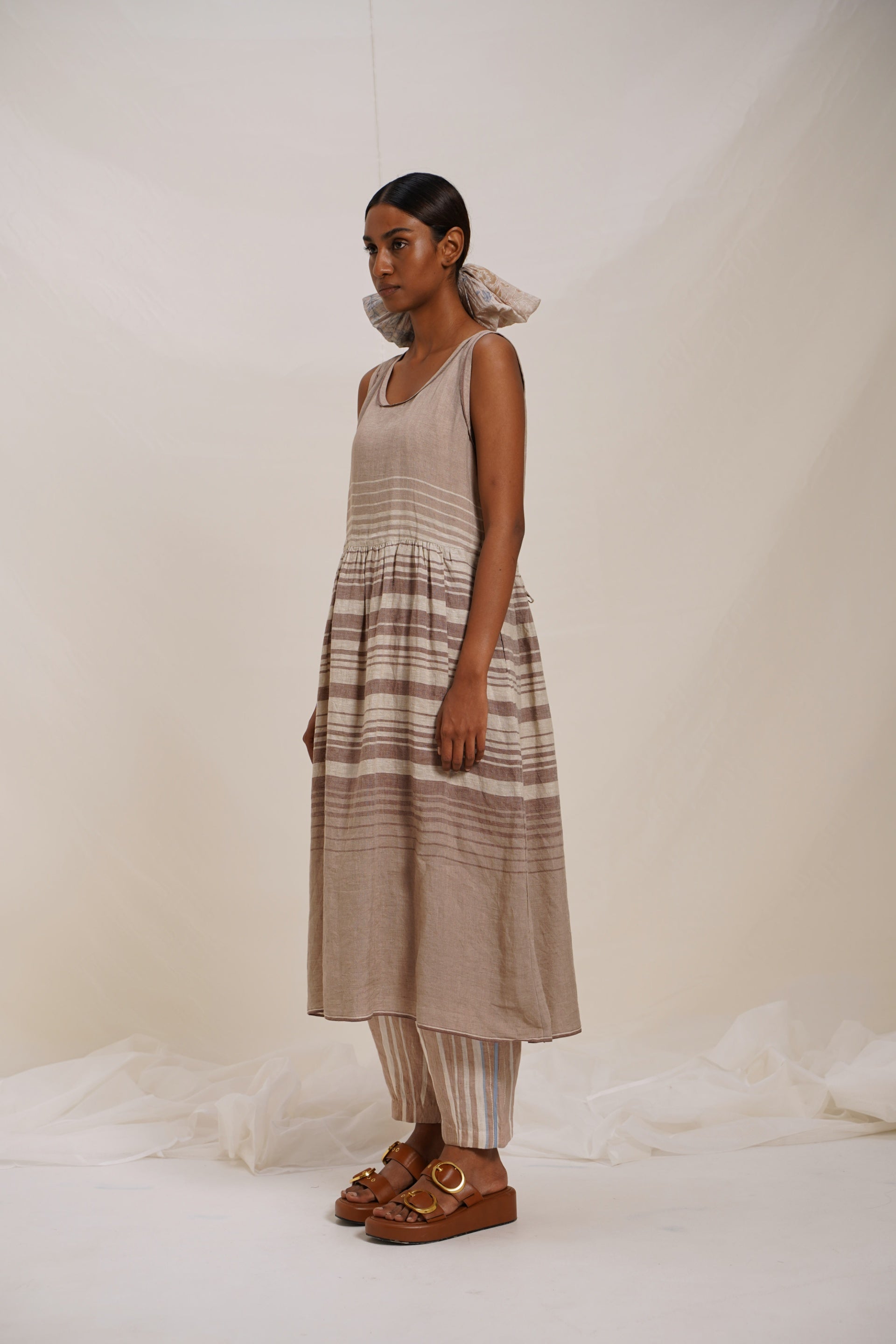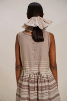 Sleeveless dress in multicolor gradation striper design showcasing an artful interplay that adds a dynamic visual appeal, elegantly crafted from handwoven yarn-dye linen. Selvedge details on the neck and hem and arm hole detail. A gathered dress for more classy and sophisticated look. A graceful tie-up detail enhances the dress's versatility and provides an adjustable fit. The dress’s selvedge accents and tie-up detail reflect a commitment to meticulous craftsmanship and refined design.