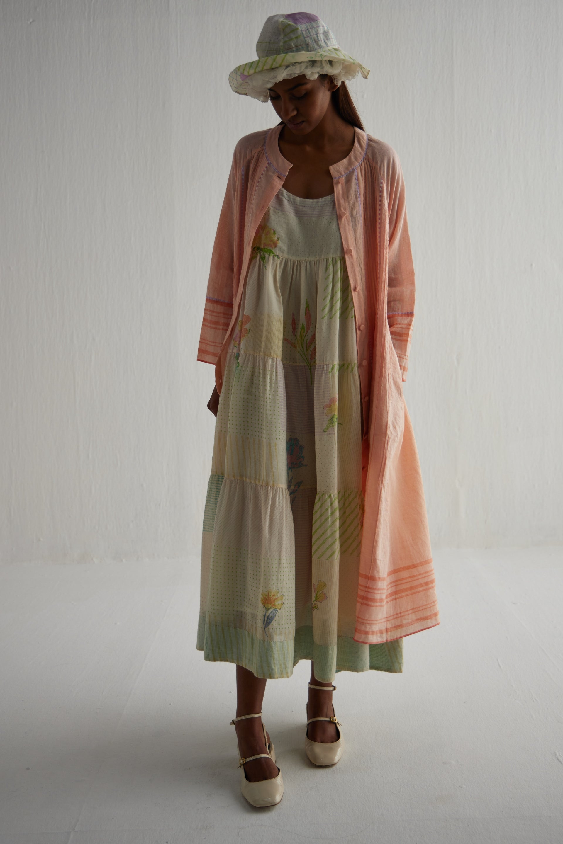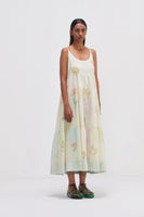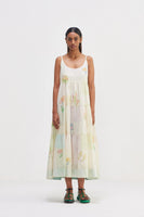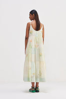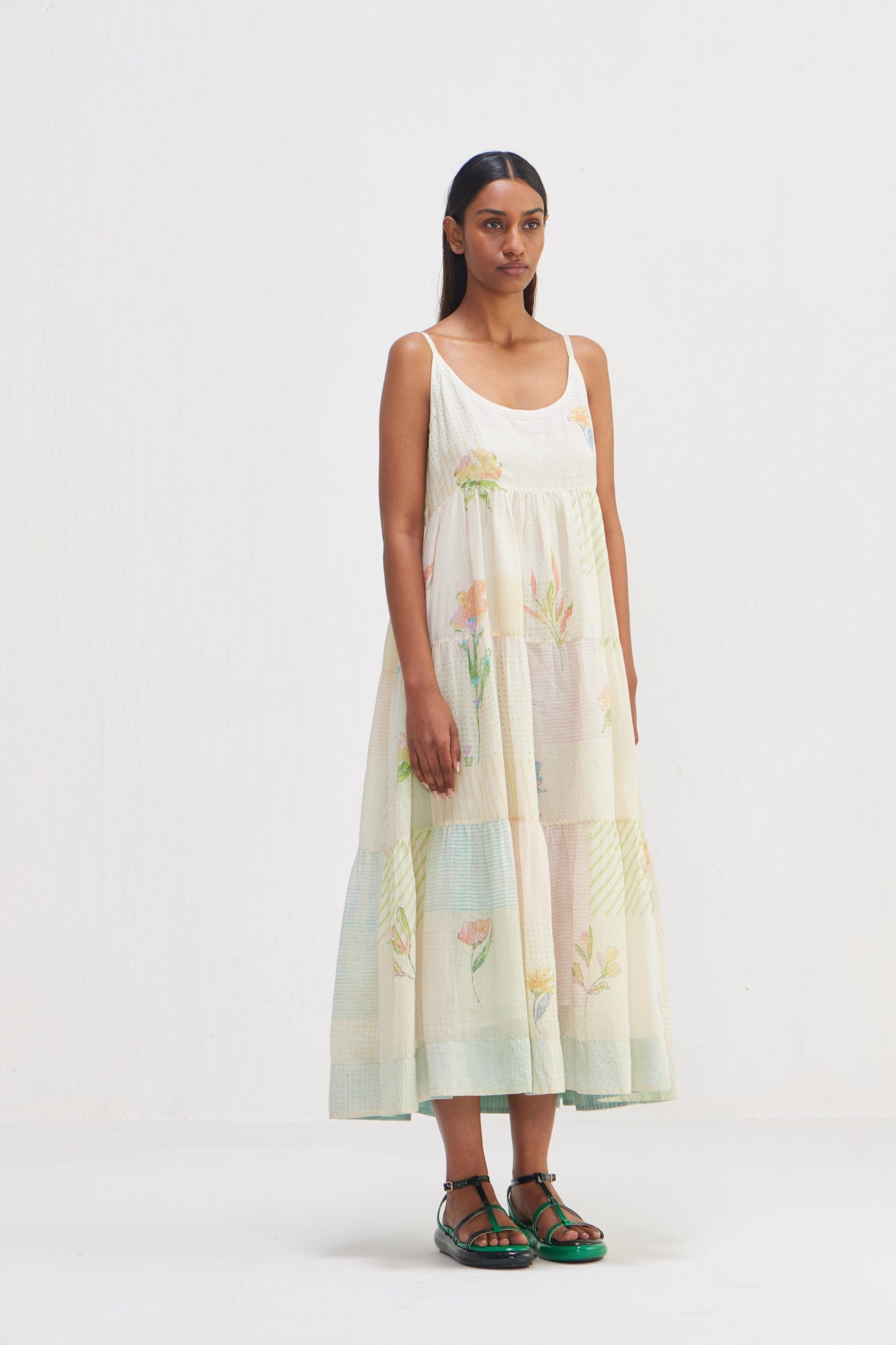 Sleeveless spaghetti strap tiered dress, boasting a deep neckline and adorned with an all-over hand block grid print, accentuated by vibrant multicolor placement floral patterns.