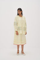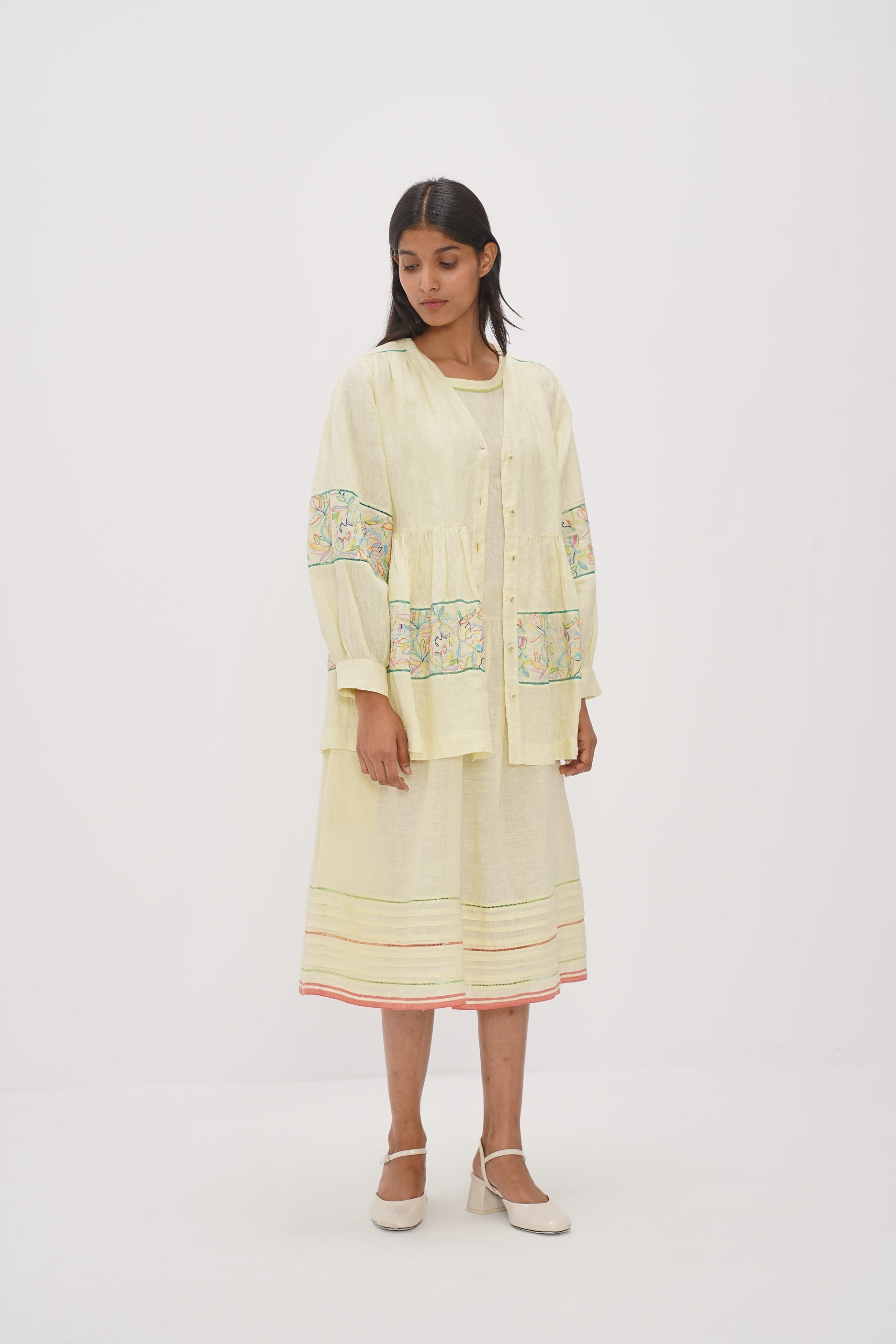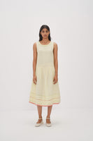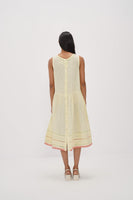 Light yellow sleeveless back open dress in 100% linen with pintuck and lace insert