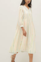 Multicolor inverted box pleated dress in handwoven cotton with abstract striper print. Comes with a separate plain white cotton silk lining