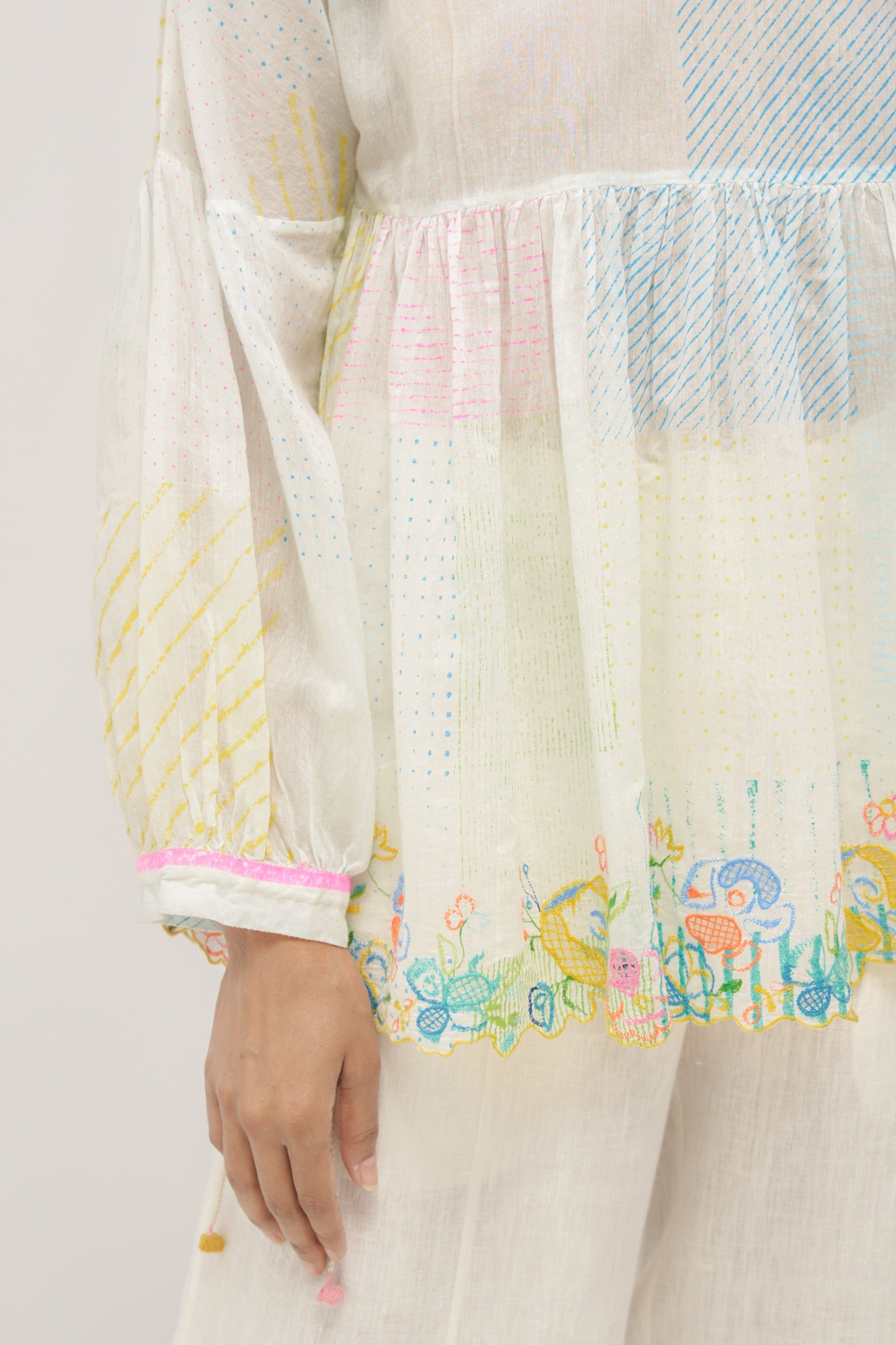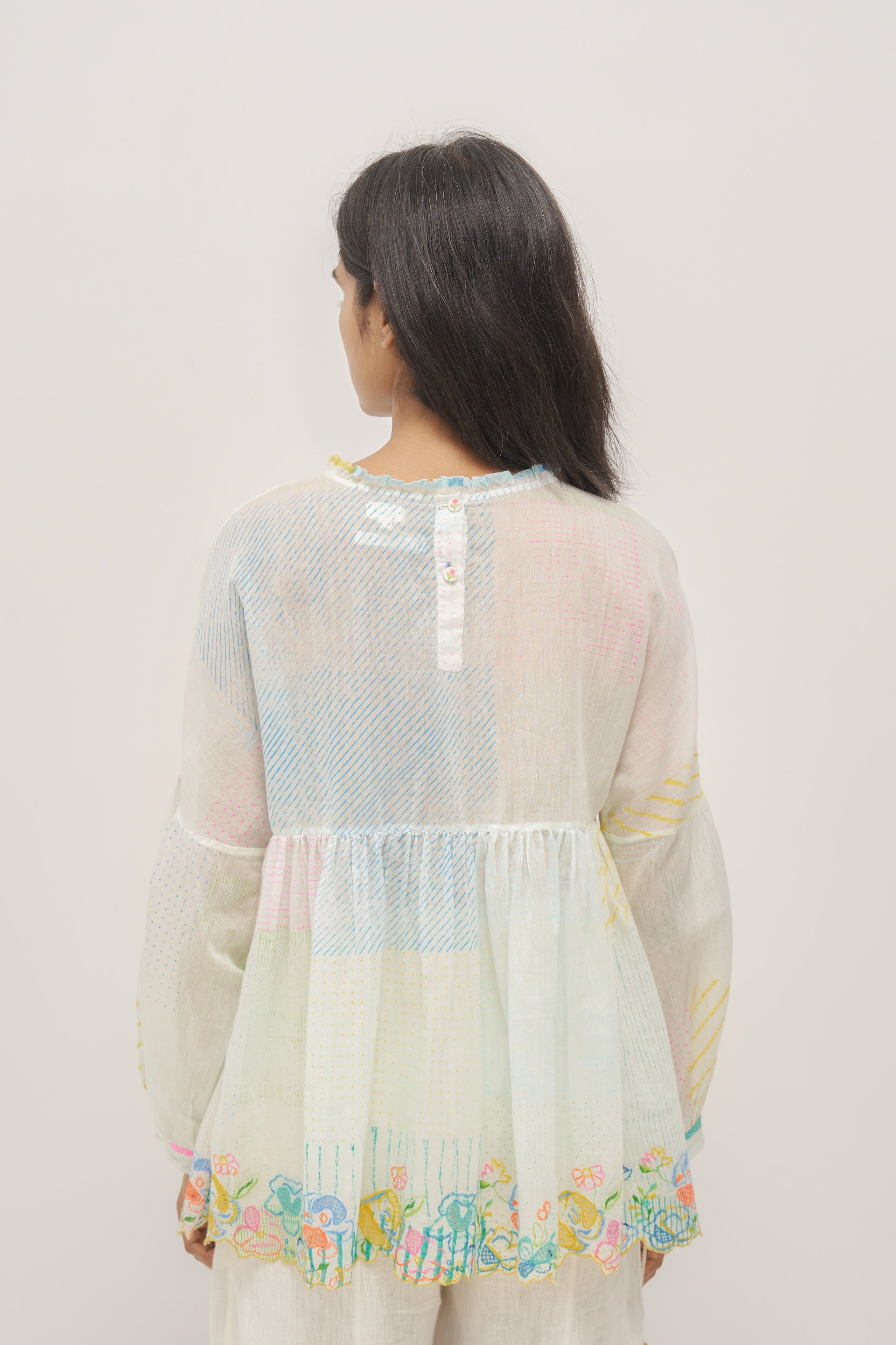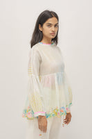 Short top with green discharged print collage in cotton silk handloom with multicolor floral embroidery and crochet trim detail. Comes with a seperate plain white cotton silk lining