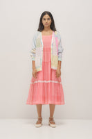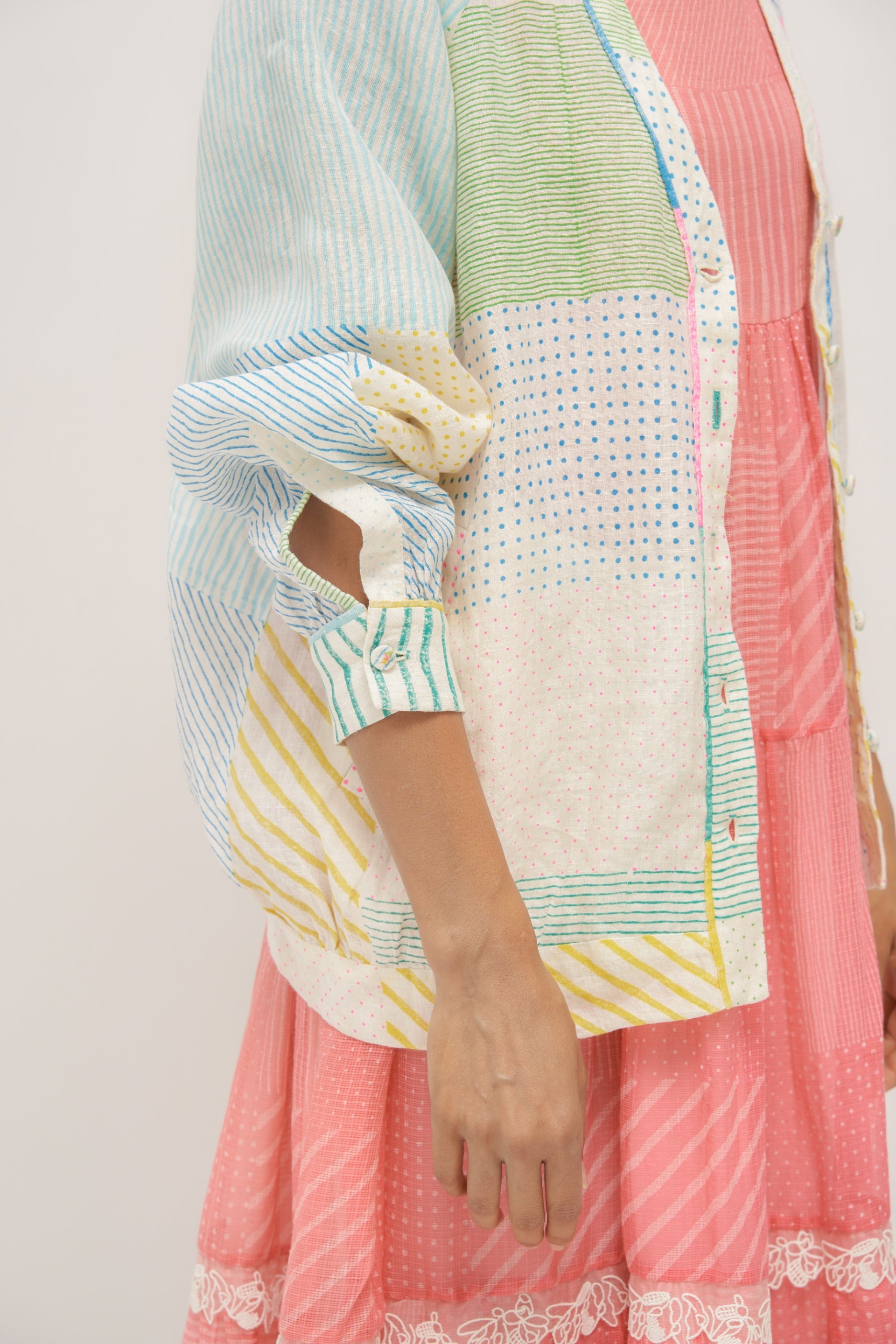Short linen jacket with multicolor print collage and multicolor printed selevedge detail