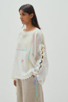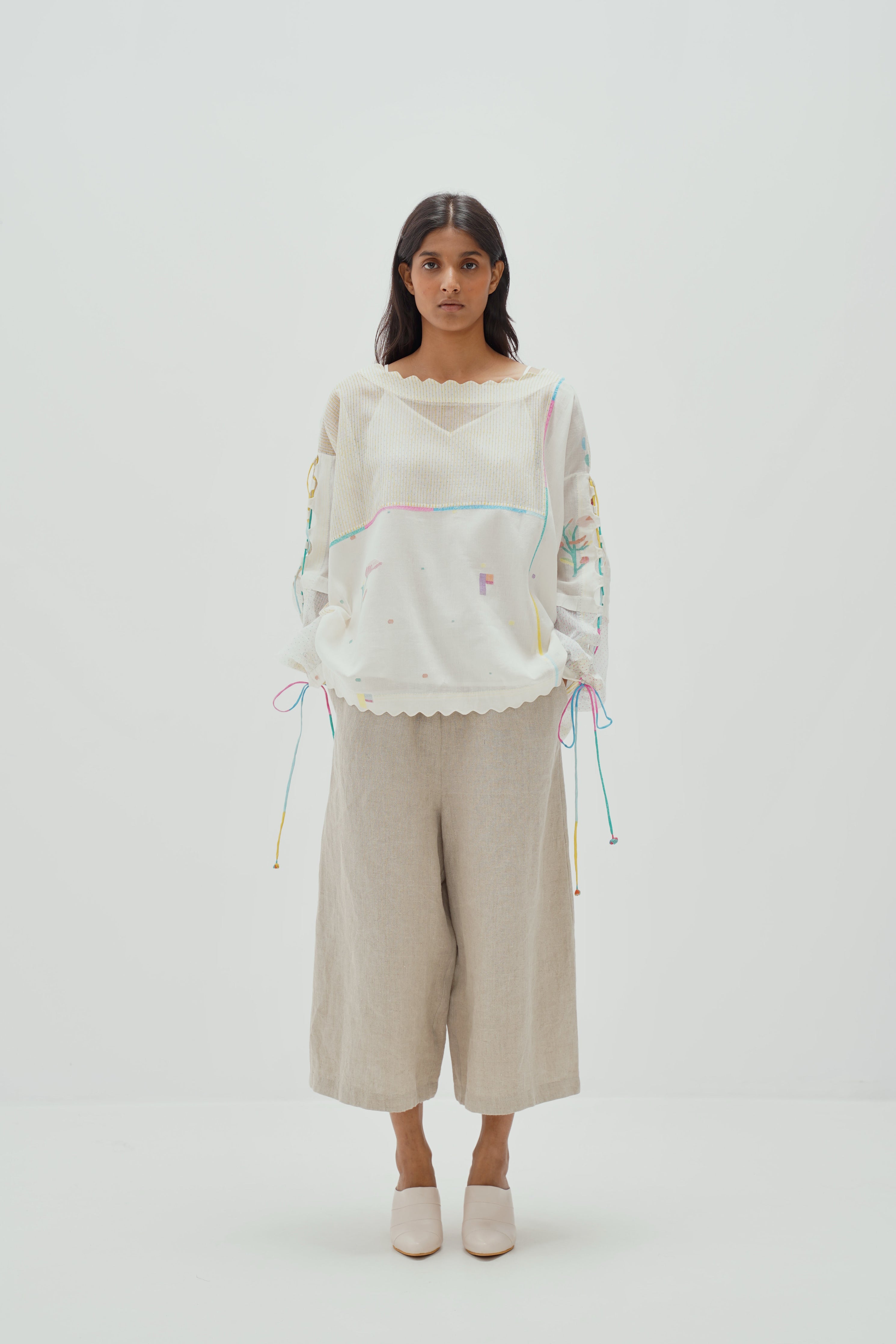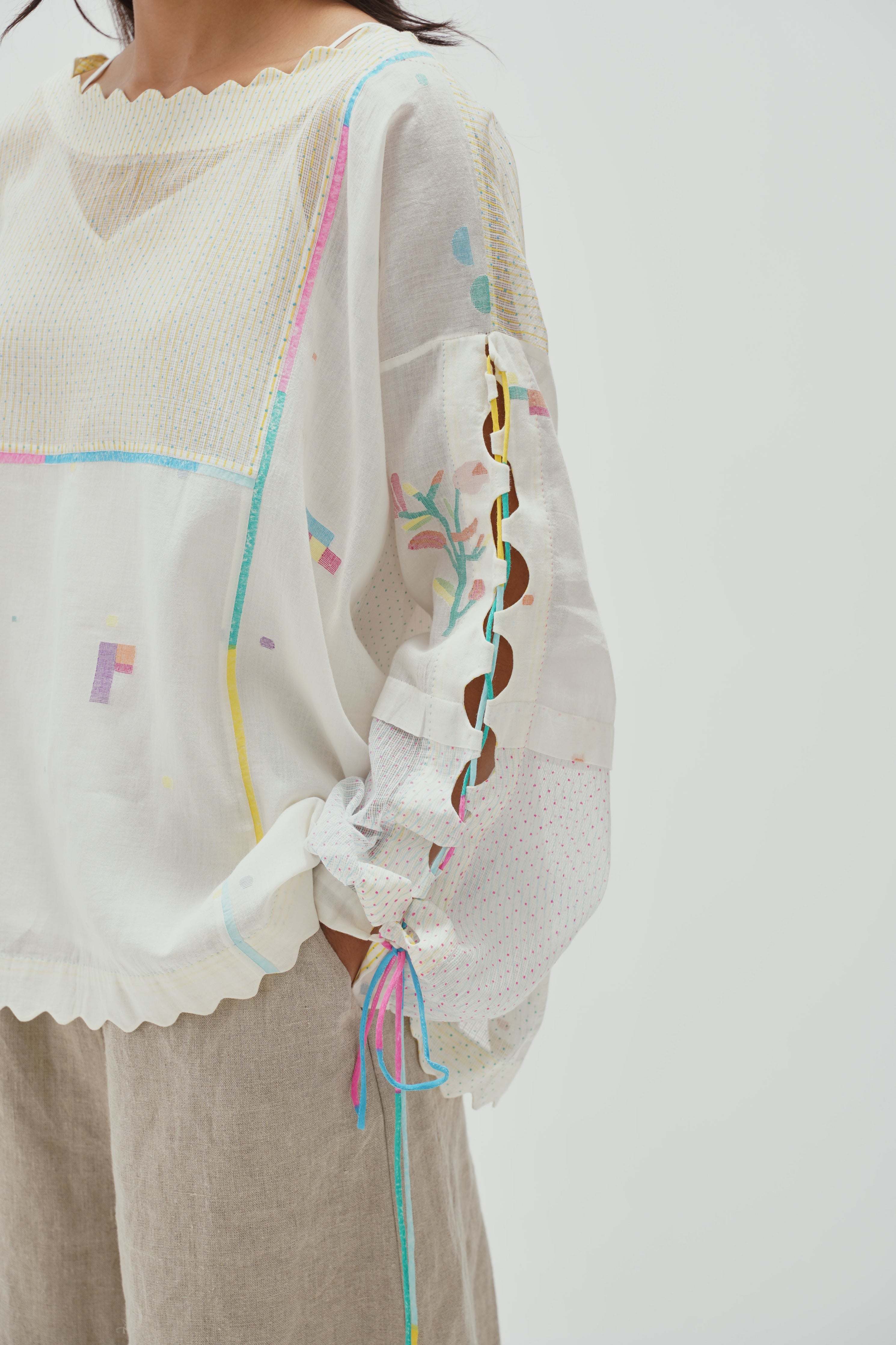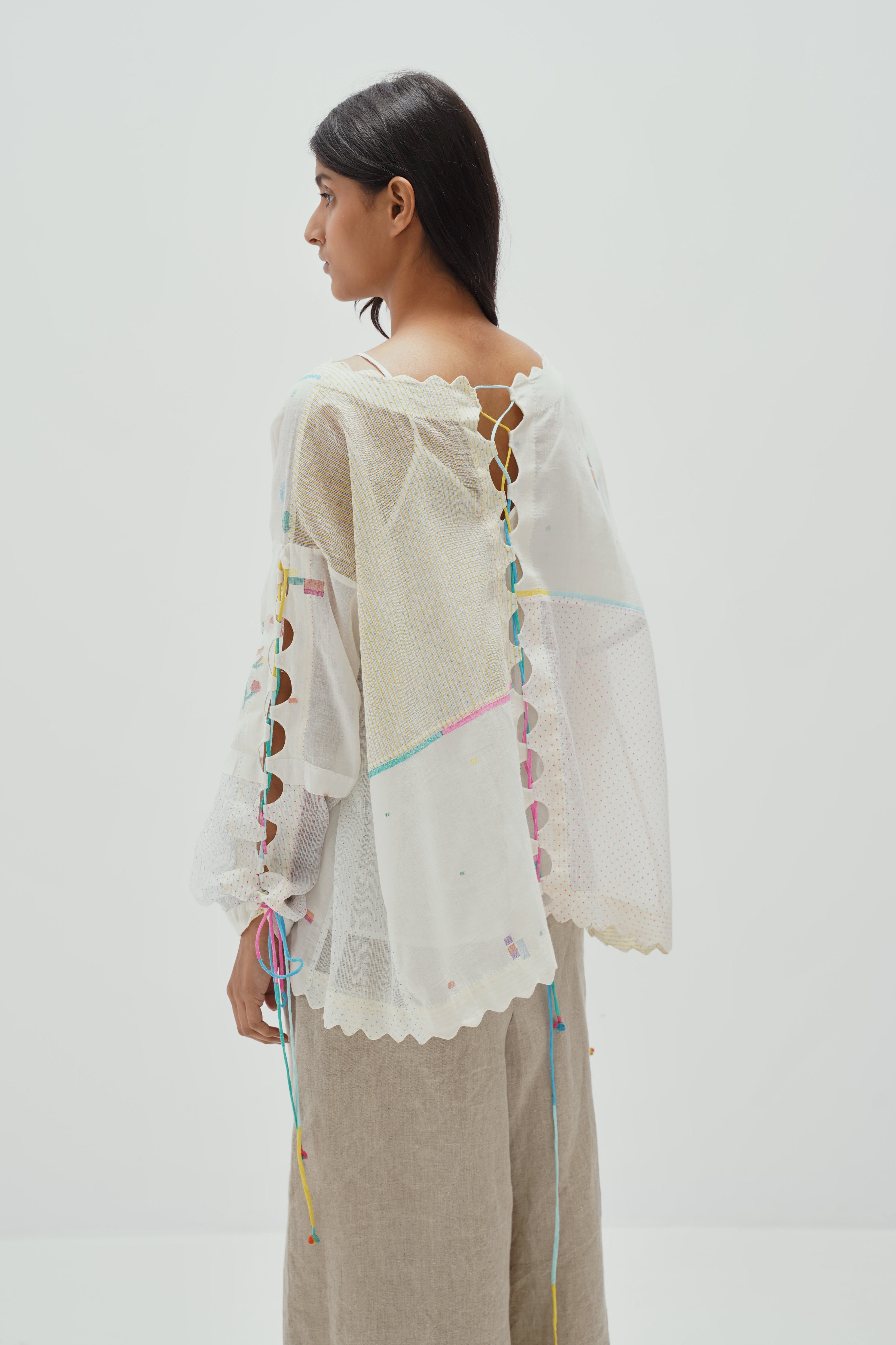 Tie up detail boxy top with scallops, multi printed striper inserts. Comes with a plain white cotton silk lining.