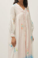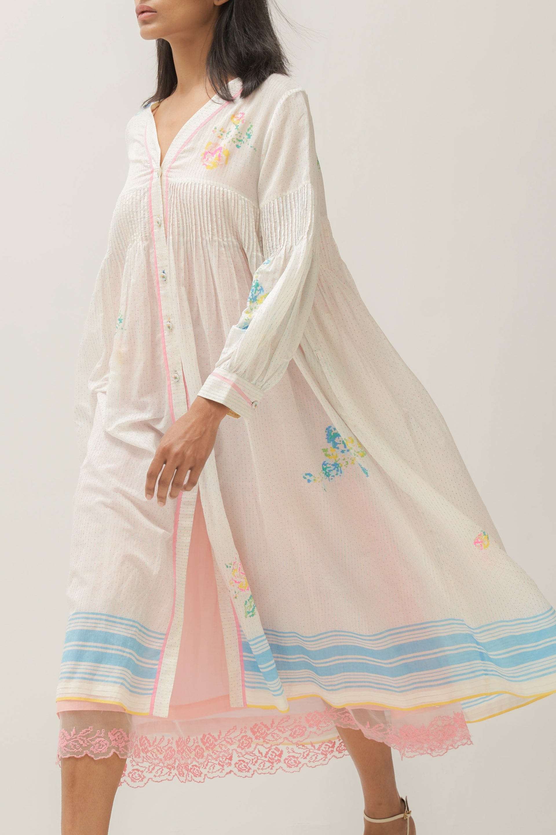 Front-open blue dress in cotton silk handloom with striper and pola print base, multicolor floral placement print and contrast piping detail.