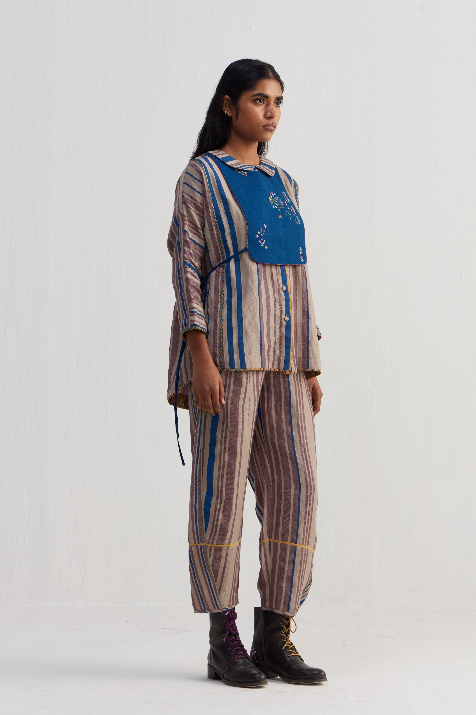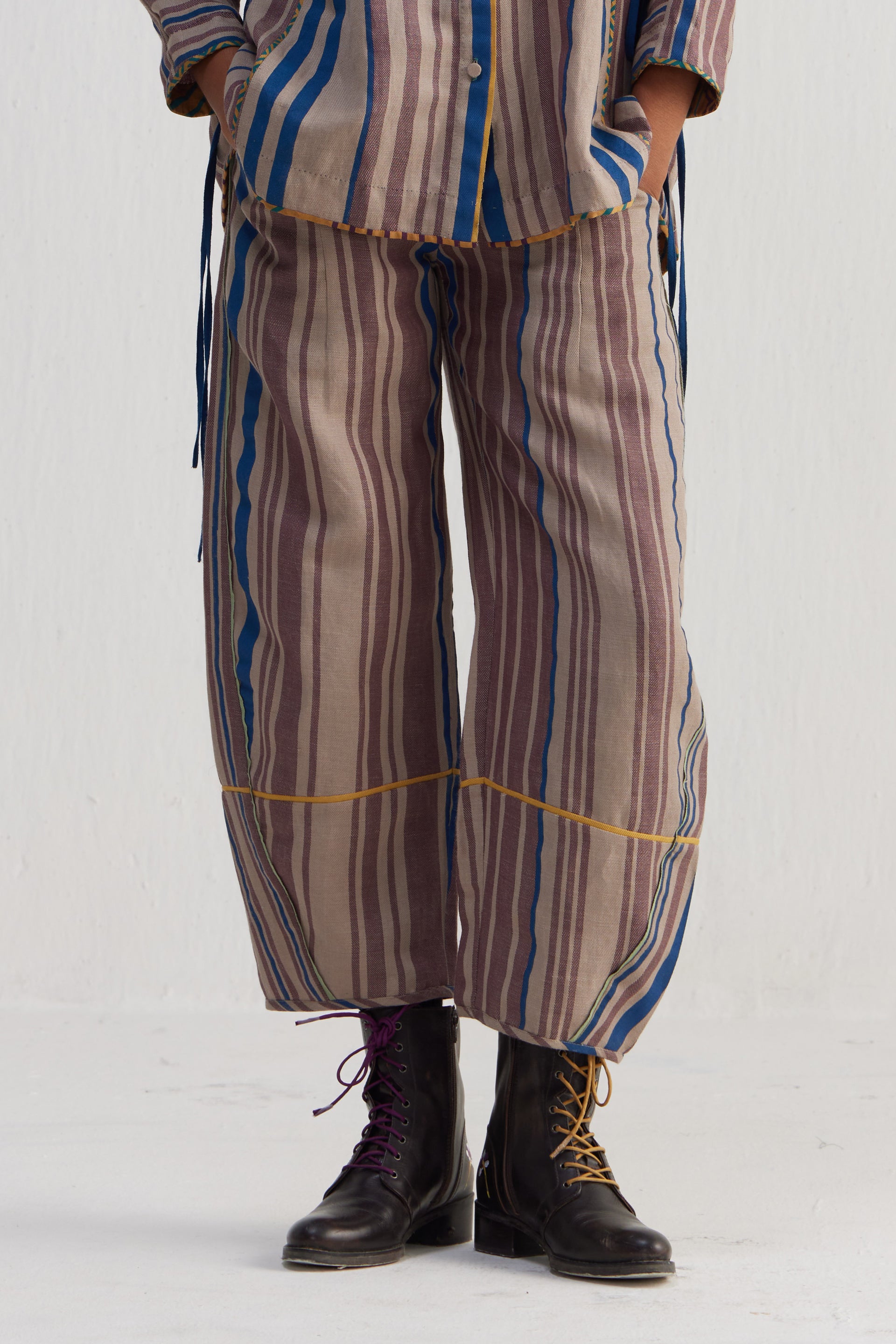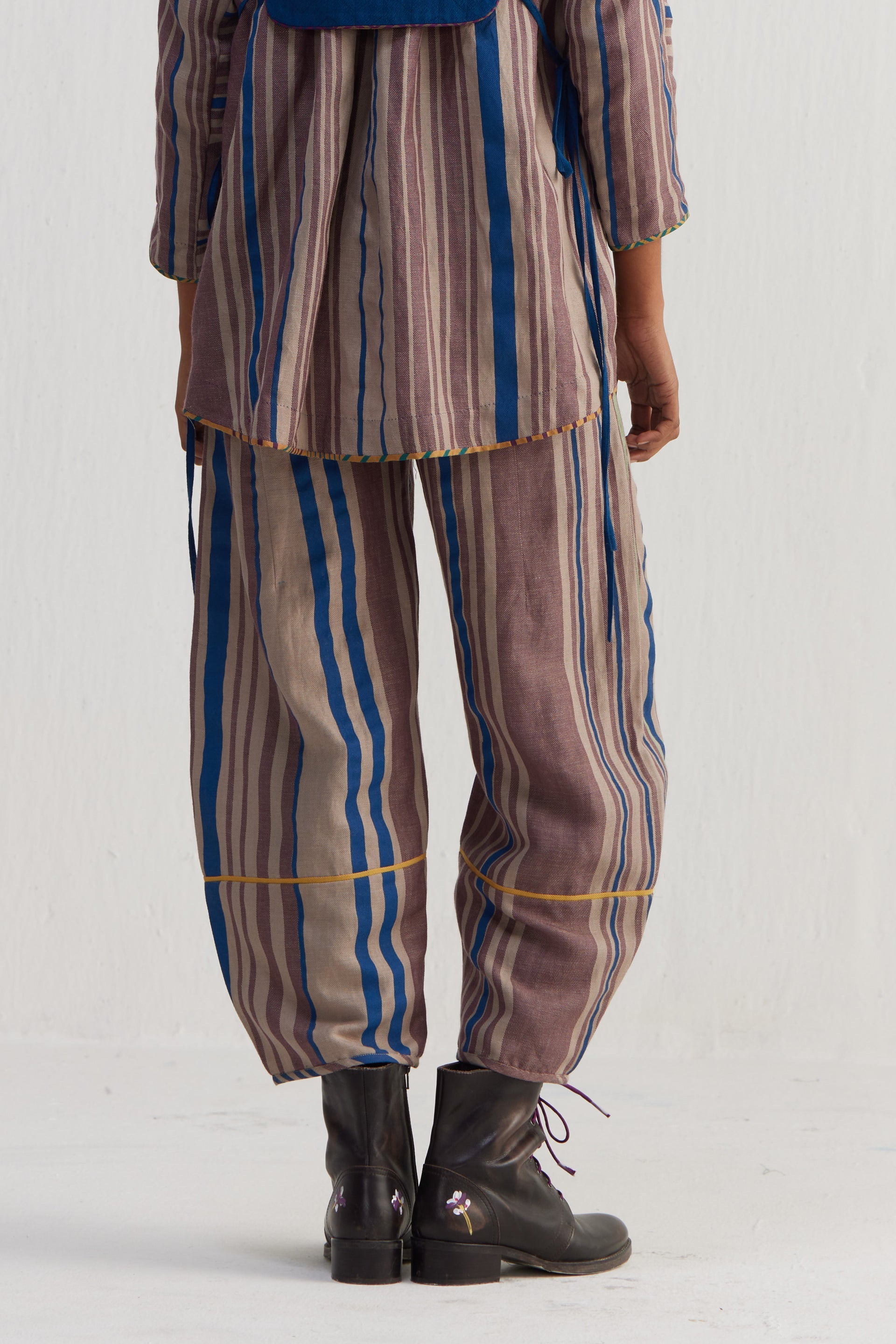 Mid raise baggy fit trouser with side pockets. Constructed in contrast handblock print over tone-on-tone thick and thin self striper fabric. Finished with solid 100% silk piping on the seam.