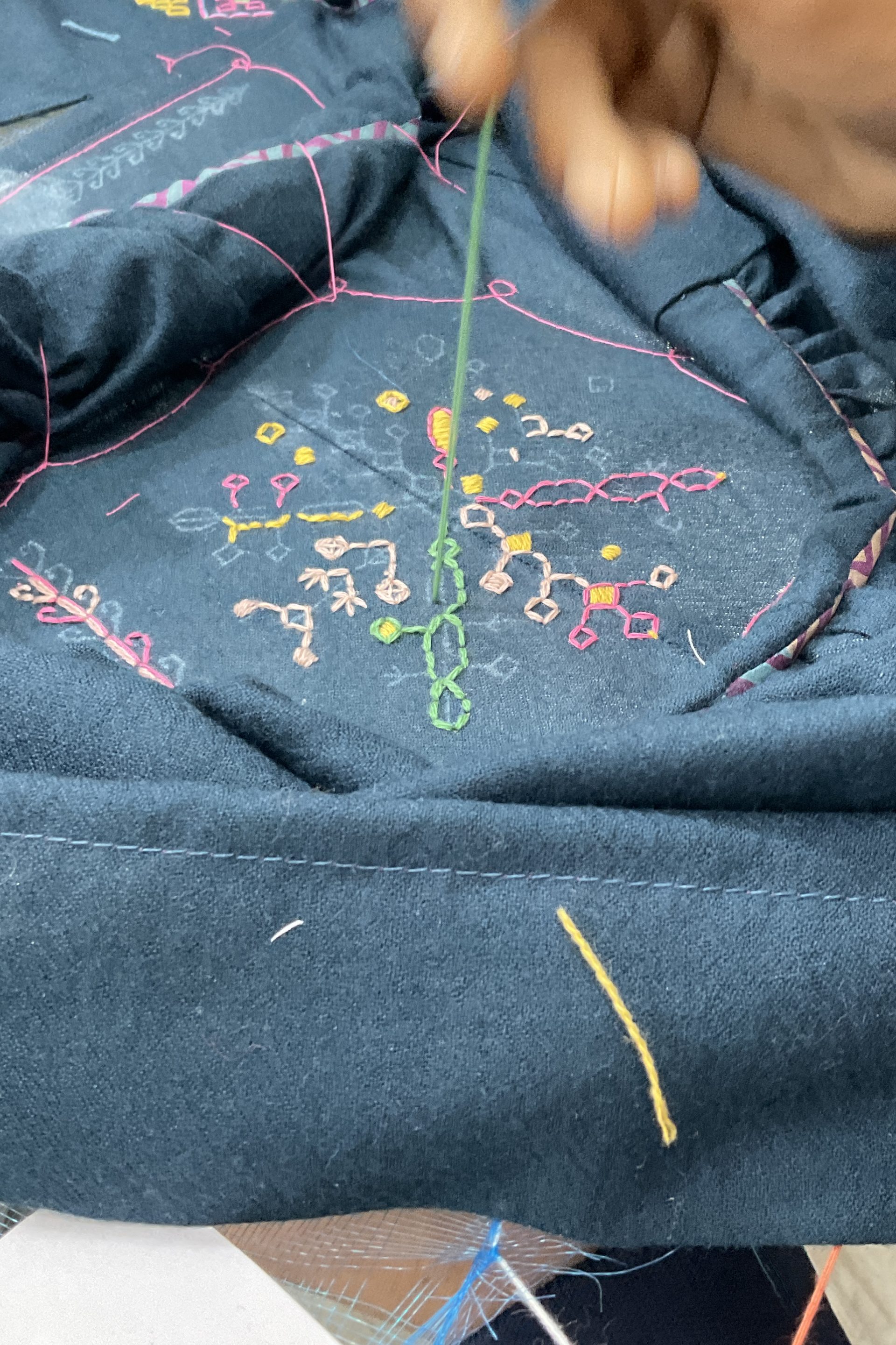 Kasuti—is a traditional folk style embroidery technique. It is known for intricate, geometric needlework. Reflecting themes from nature, temples, animals, and birds like peacocks and lotus flowers, each motif celebrates life with vibrant colors and patterns. In EKÁ, motifs are creatively broken up and reinterpreted on garments, blending diverse stitches and colors for a contemporary look that honors Kasuti’s handmade heritage.