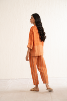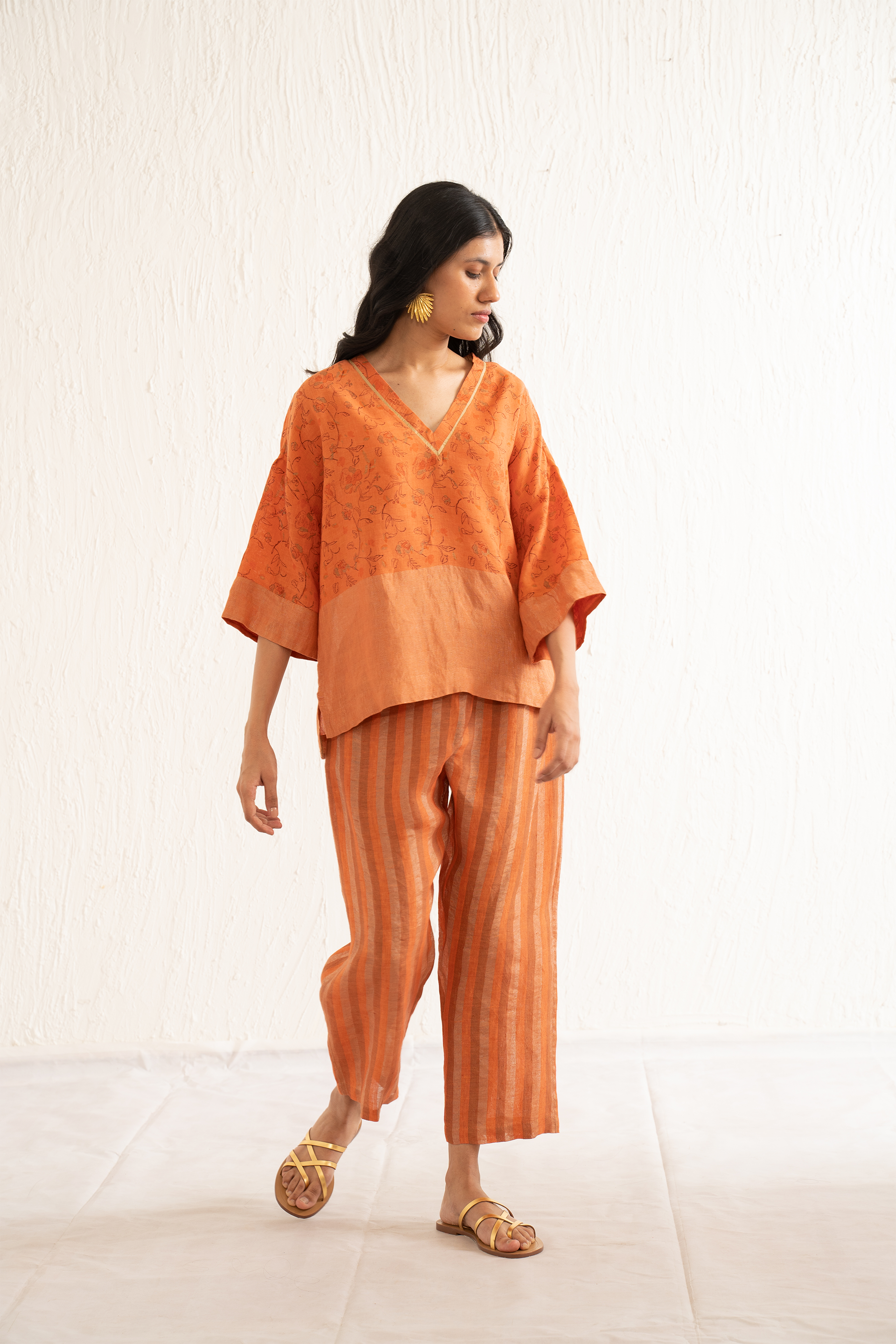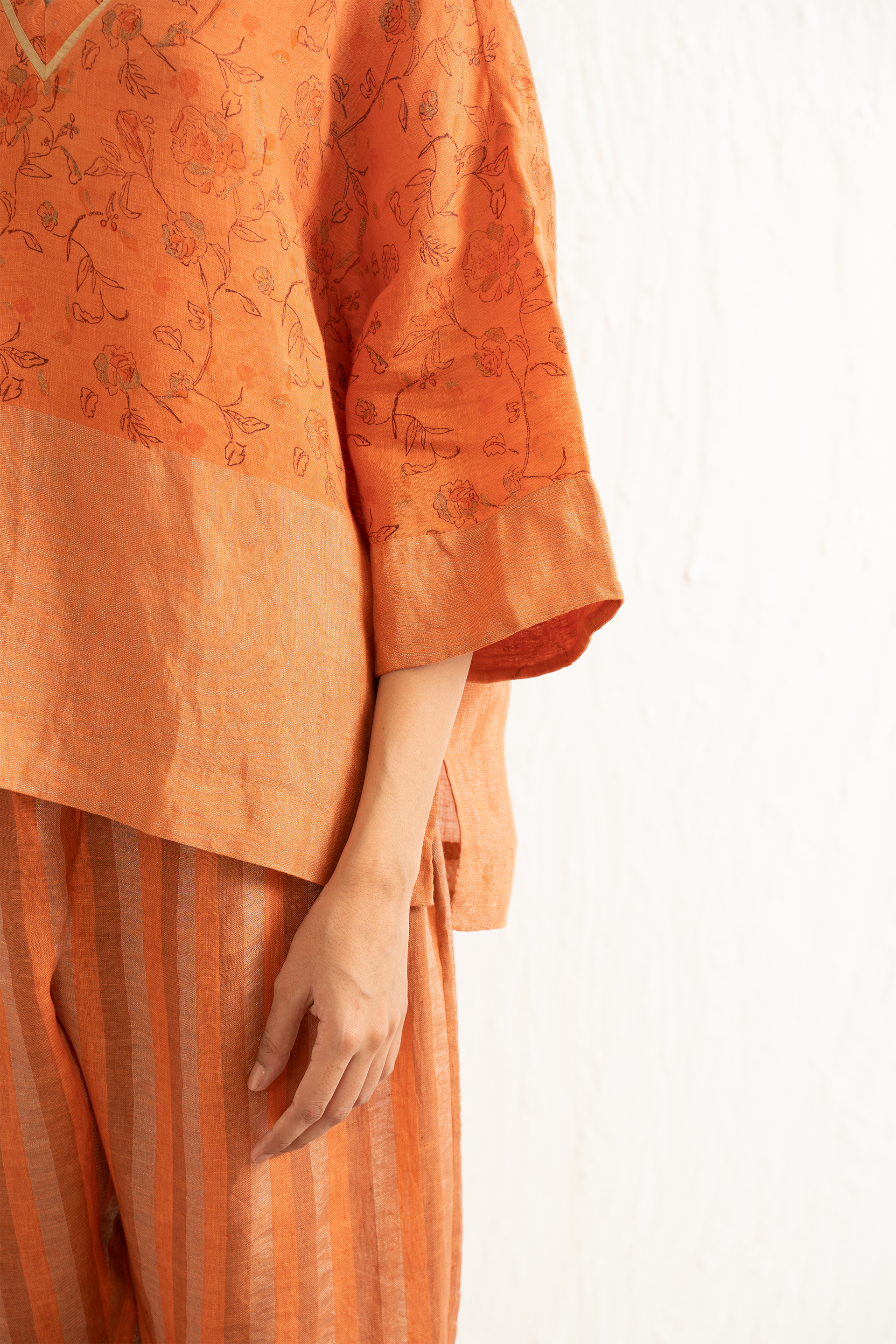Orange v-neck, half linen-half zari cropped top with all over delicate v-neck, half linen-half zari cropped top with all over delicate hand block floral print