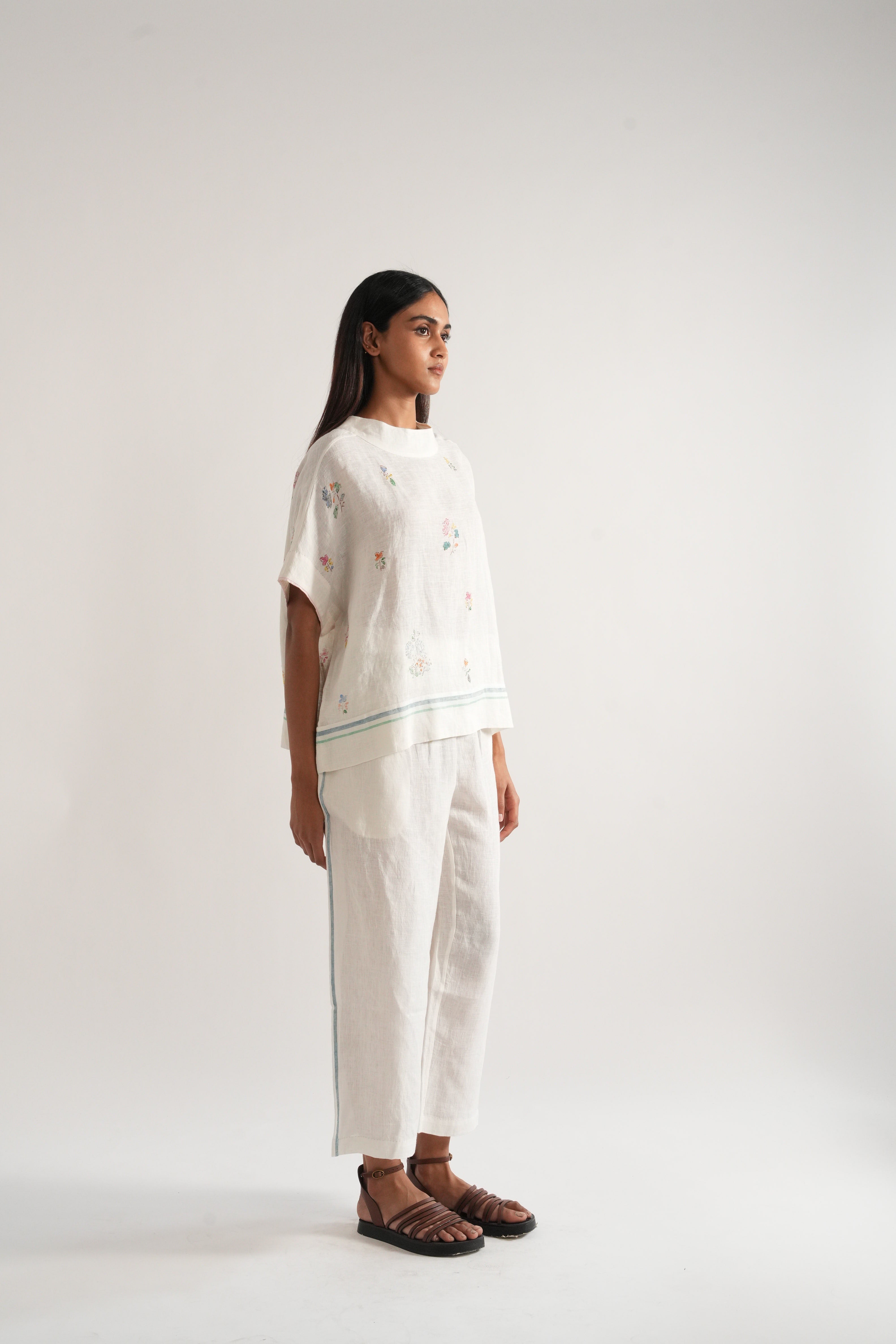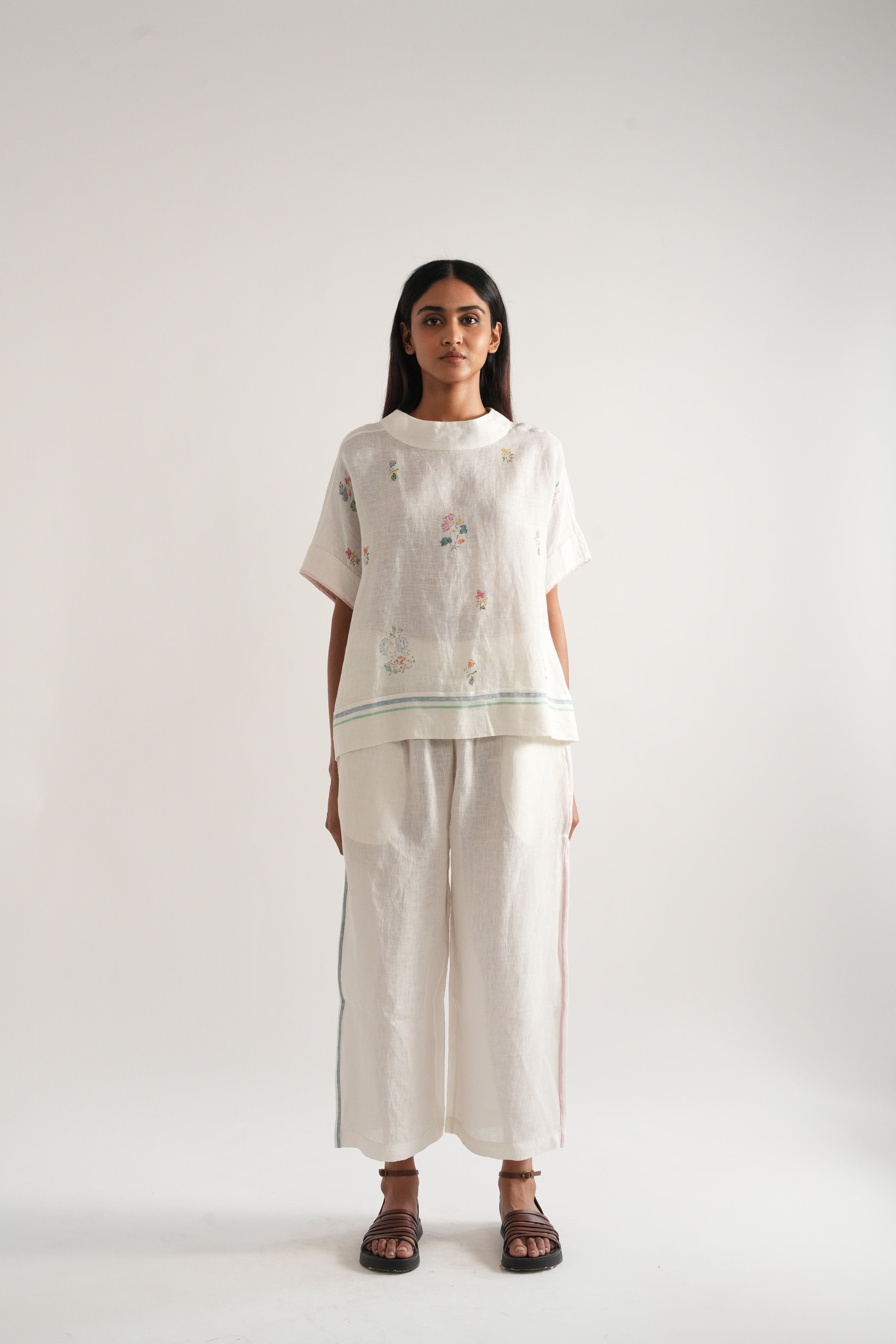 Relaxed fit short summer top in handwoven linen with placement hand block print and selvage details comes with a pair of relaxed fit culottes