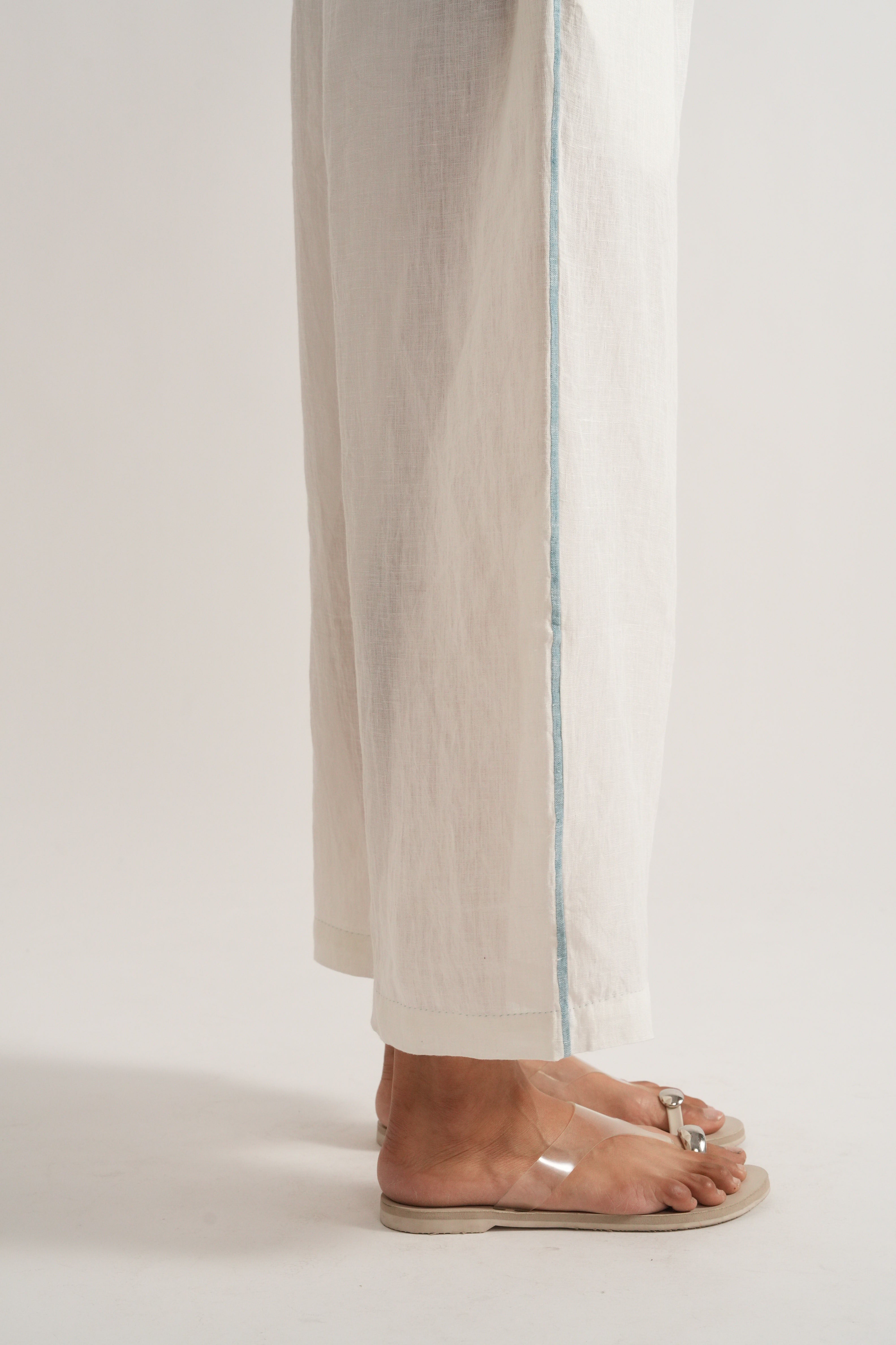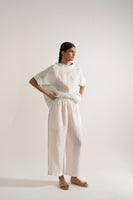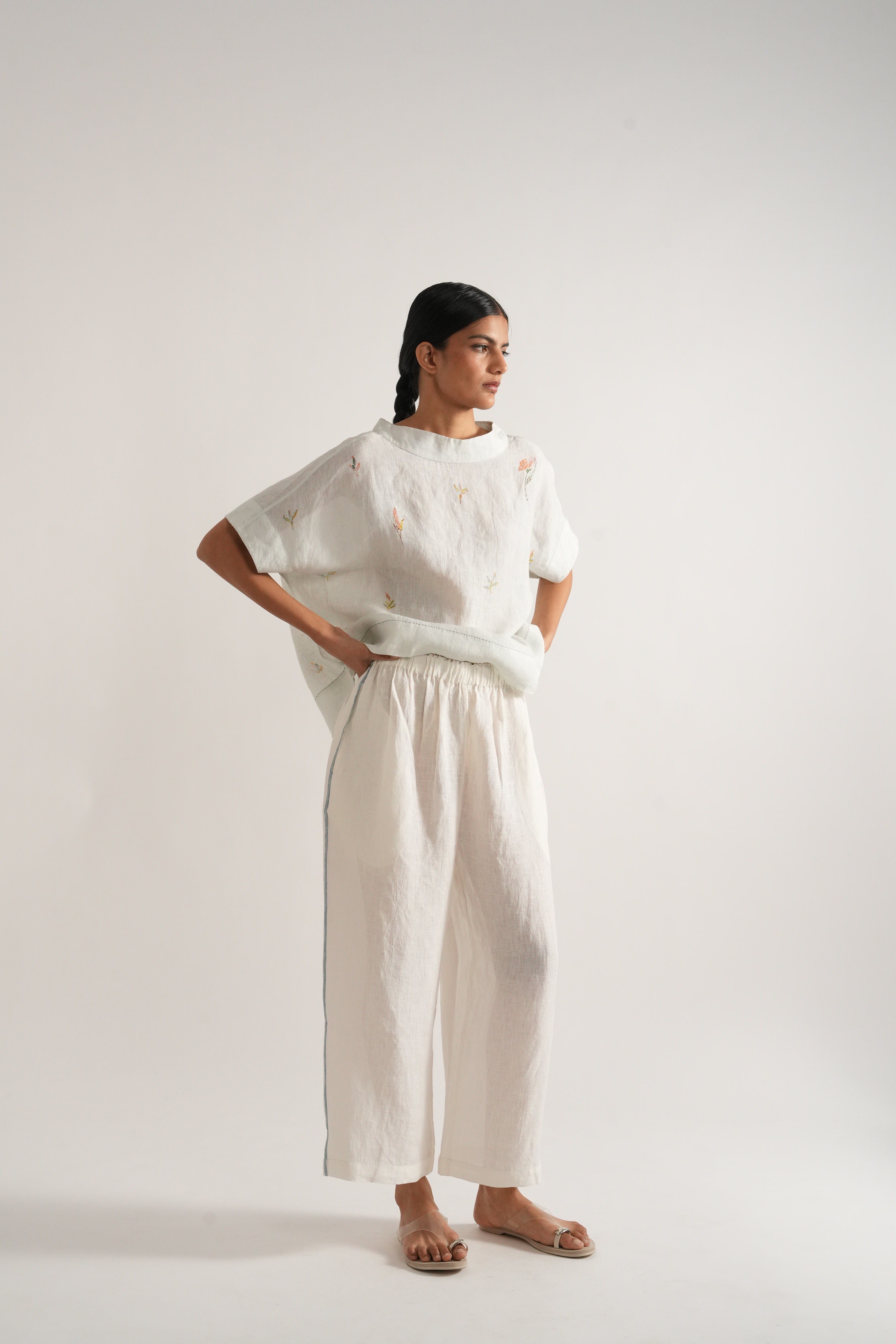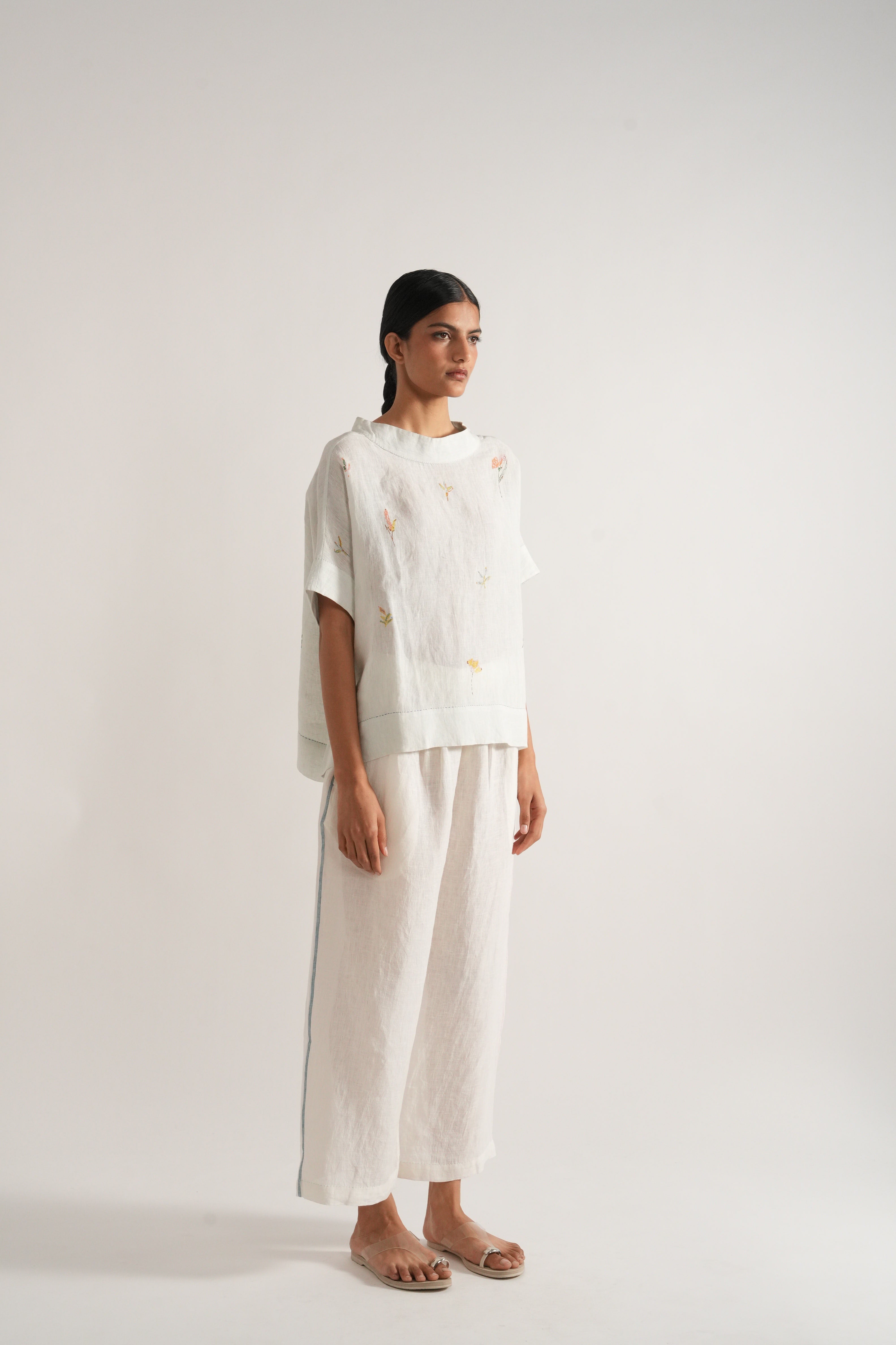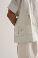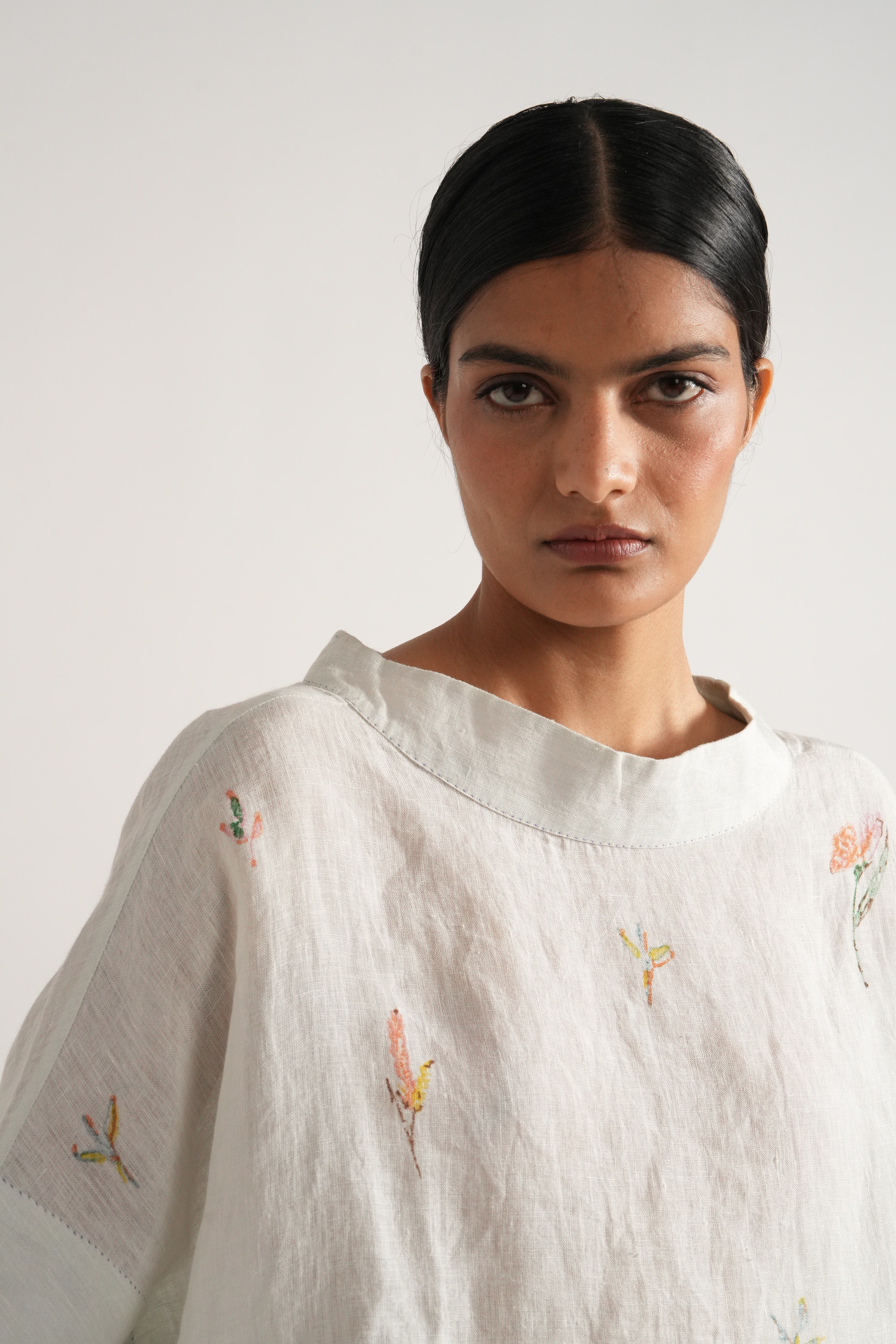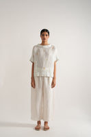 Relaxed fit short summer top in hand block placement print handwoven linen with selvage details