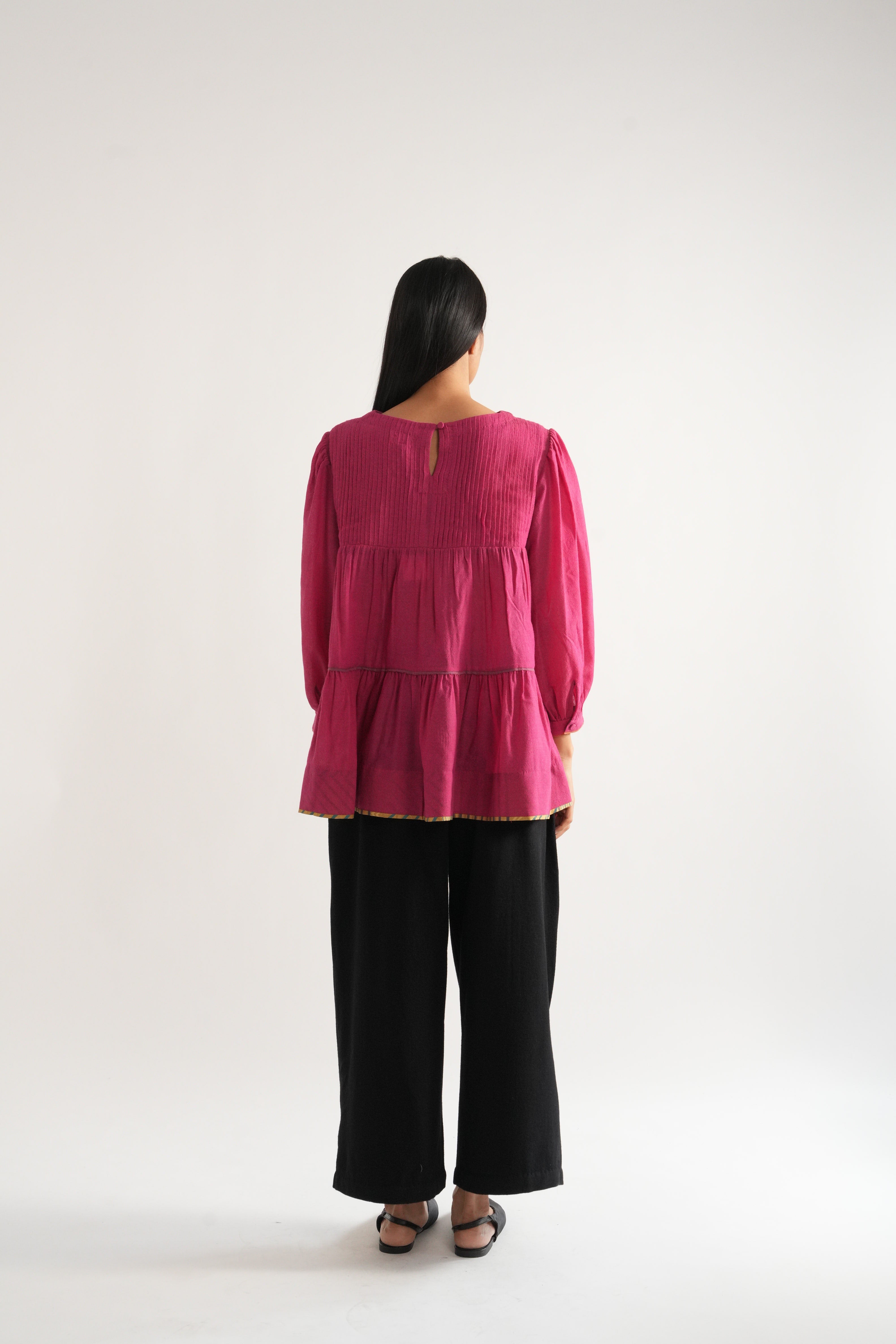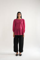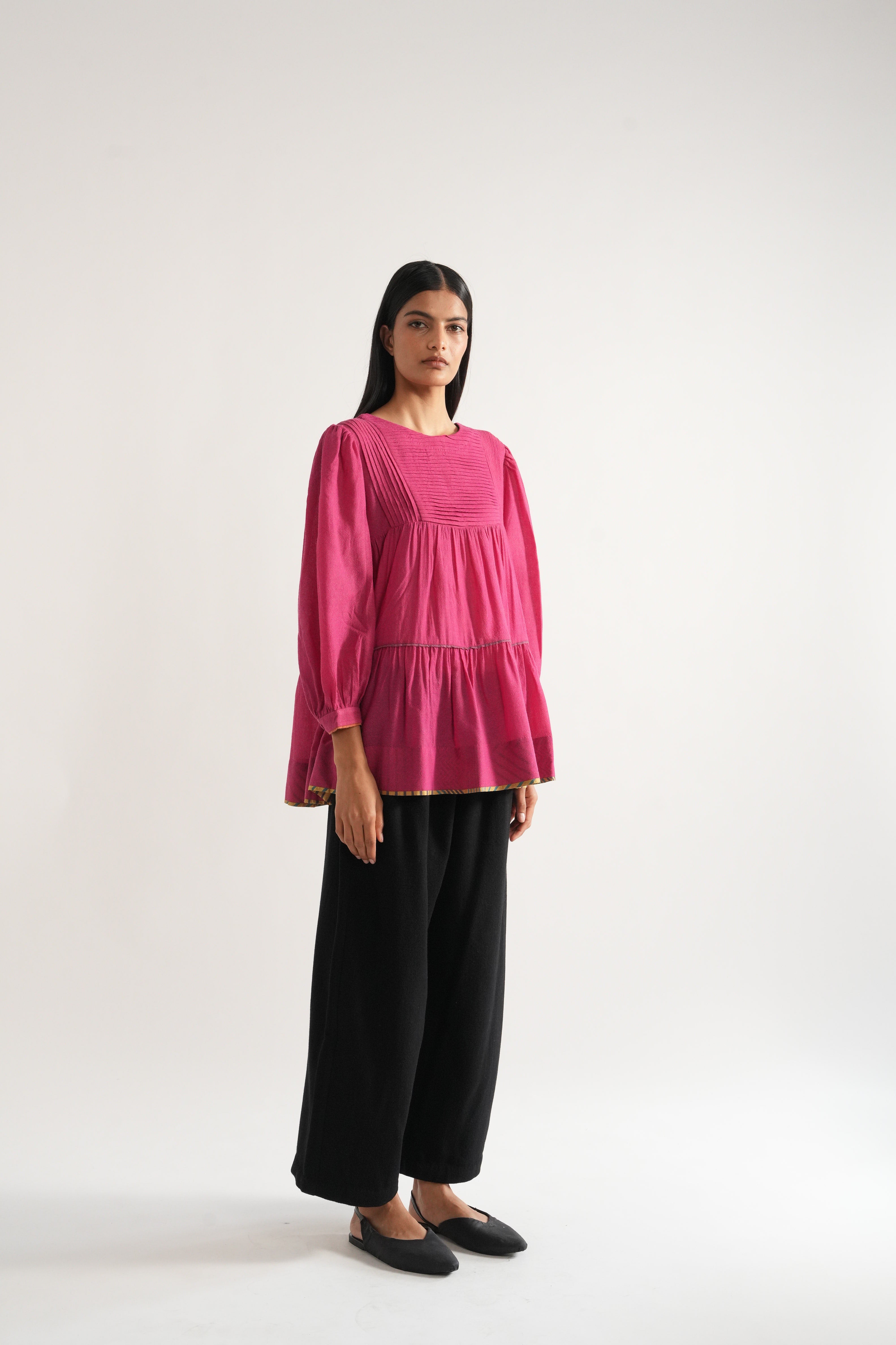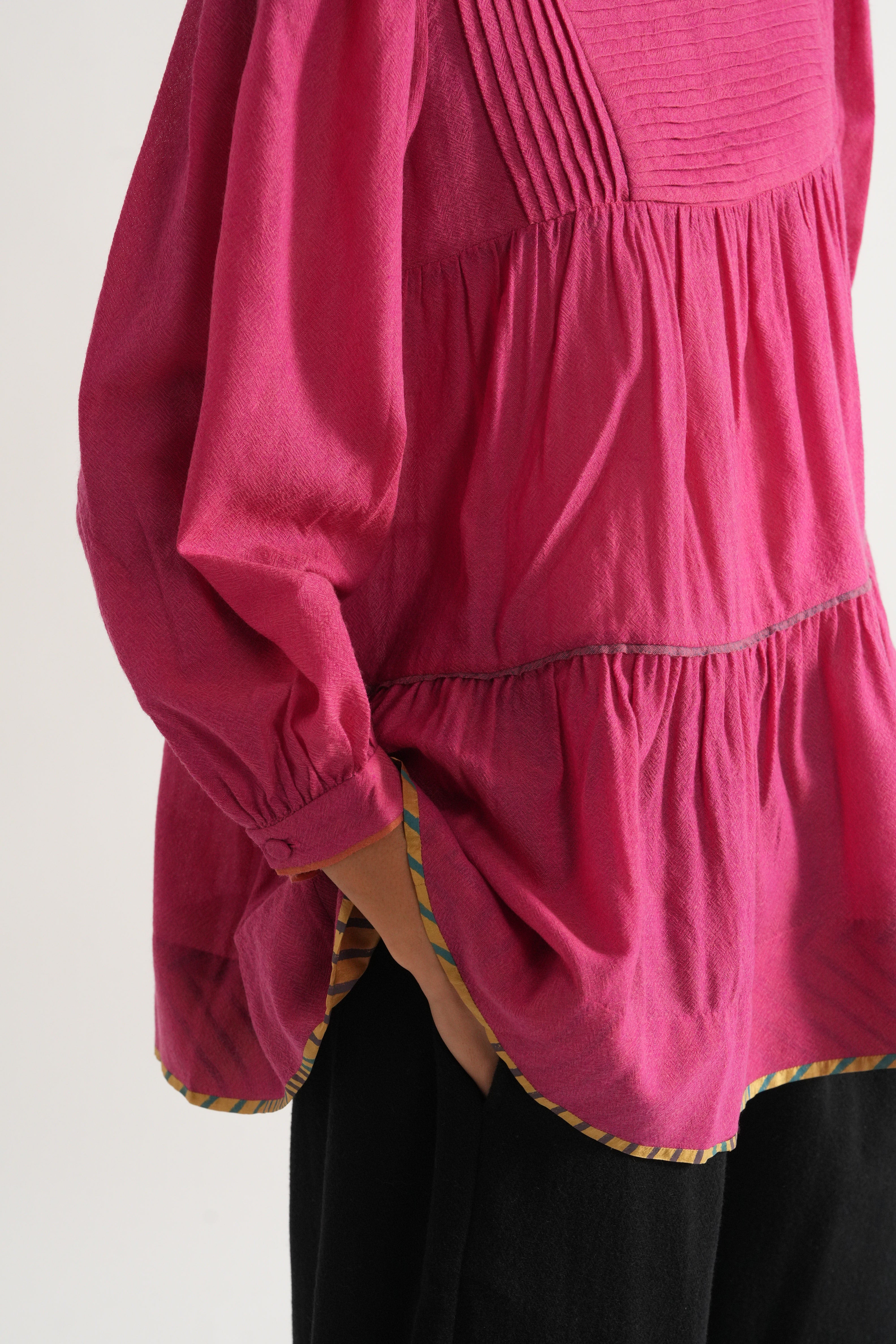 Pintuck patchwork gathered top in handwoven solid wool with contrast hand block print piping detail