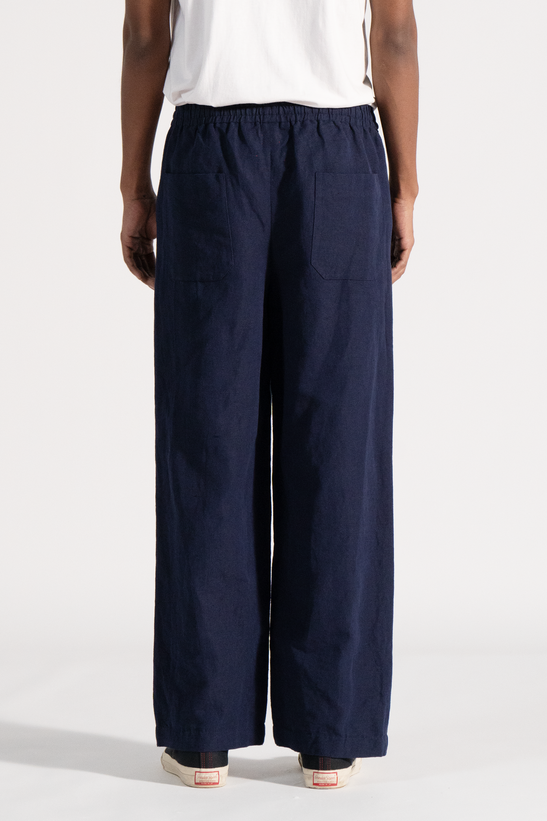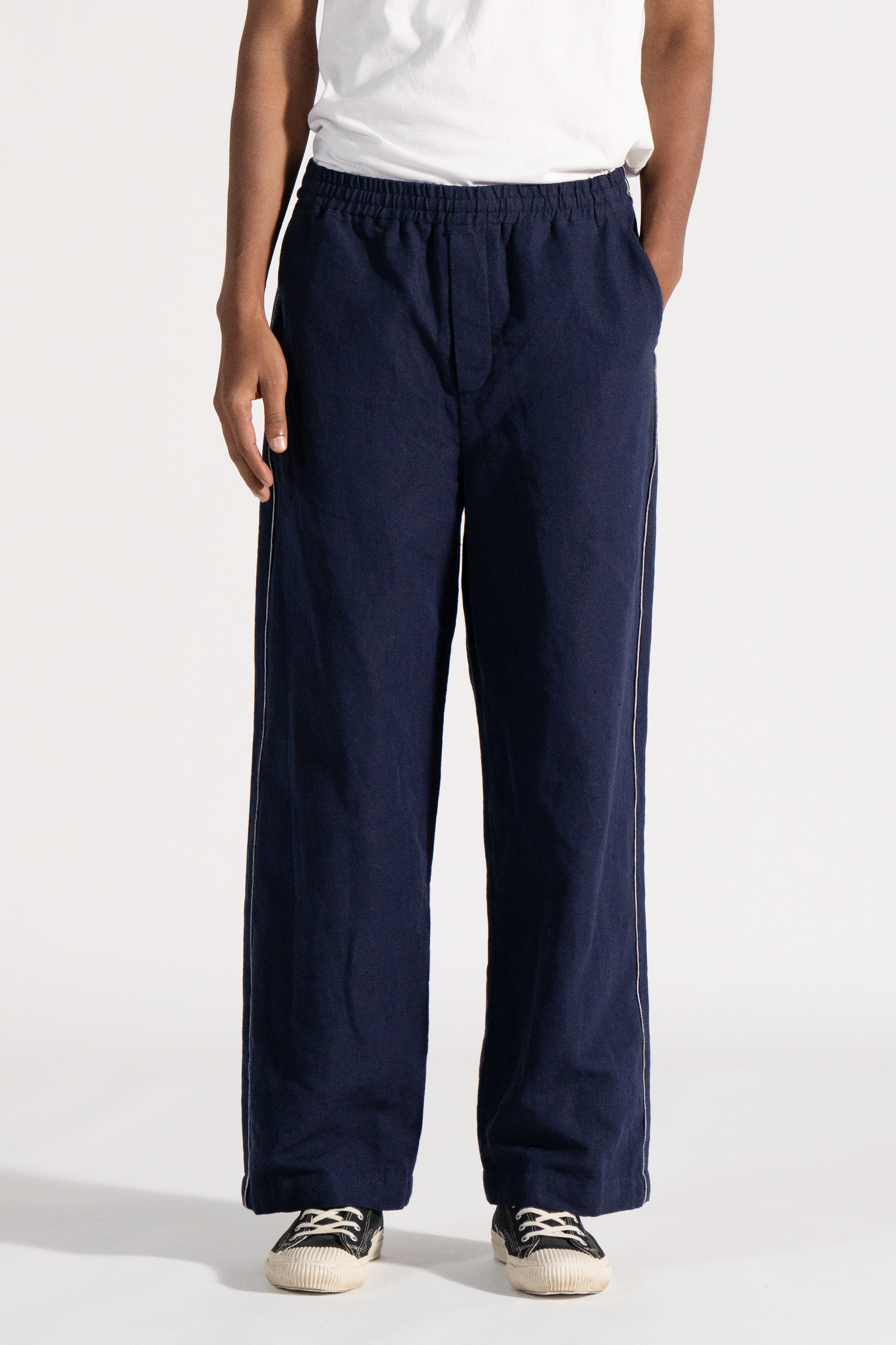 Baggy fit front pleat trouser with side pockets and contrast selvedge detail in cotton linen fabric.