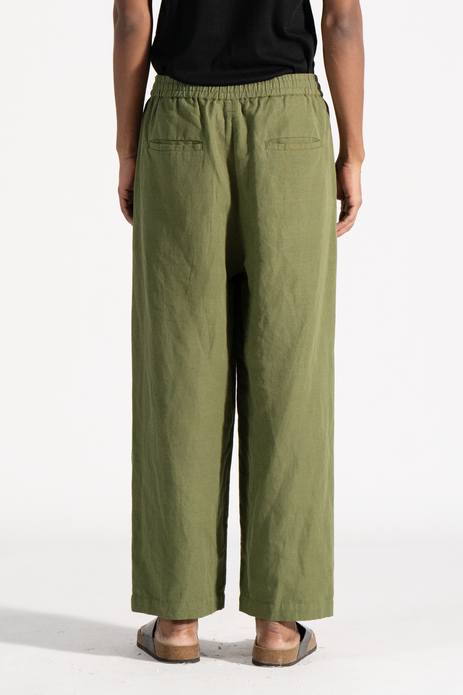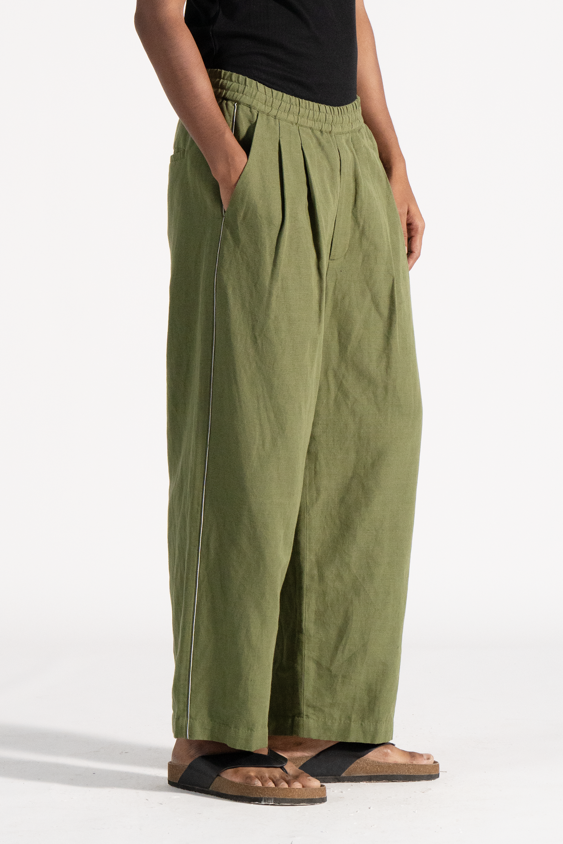 Flare trouser with front pleat and contrast selvedge detail on the side seam in cotton linen fabric.