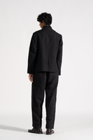 Flare trouser with contrast selvedge detail on side seam in solid cotton linen fabric.