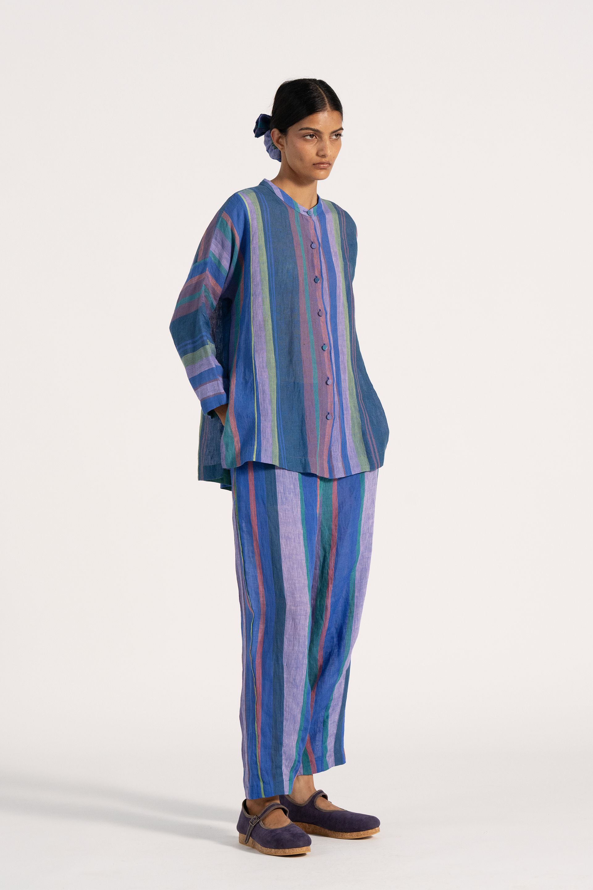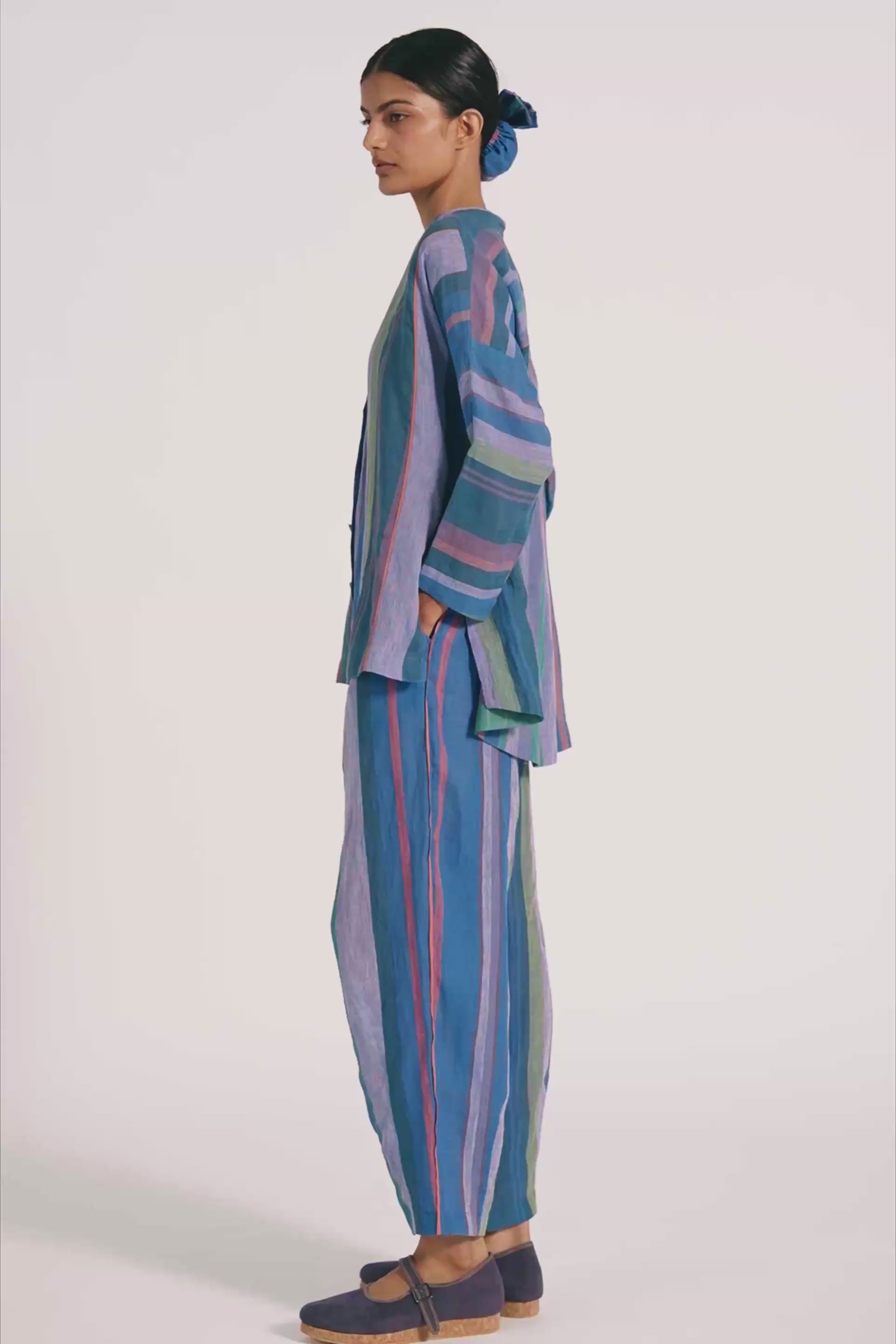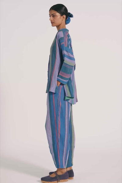 Relaxed fit tapered hem trouser with dart detail on hem. Constructed in multicolor striper cotton linen fabric.
