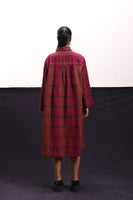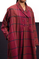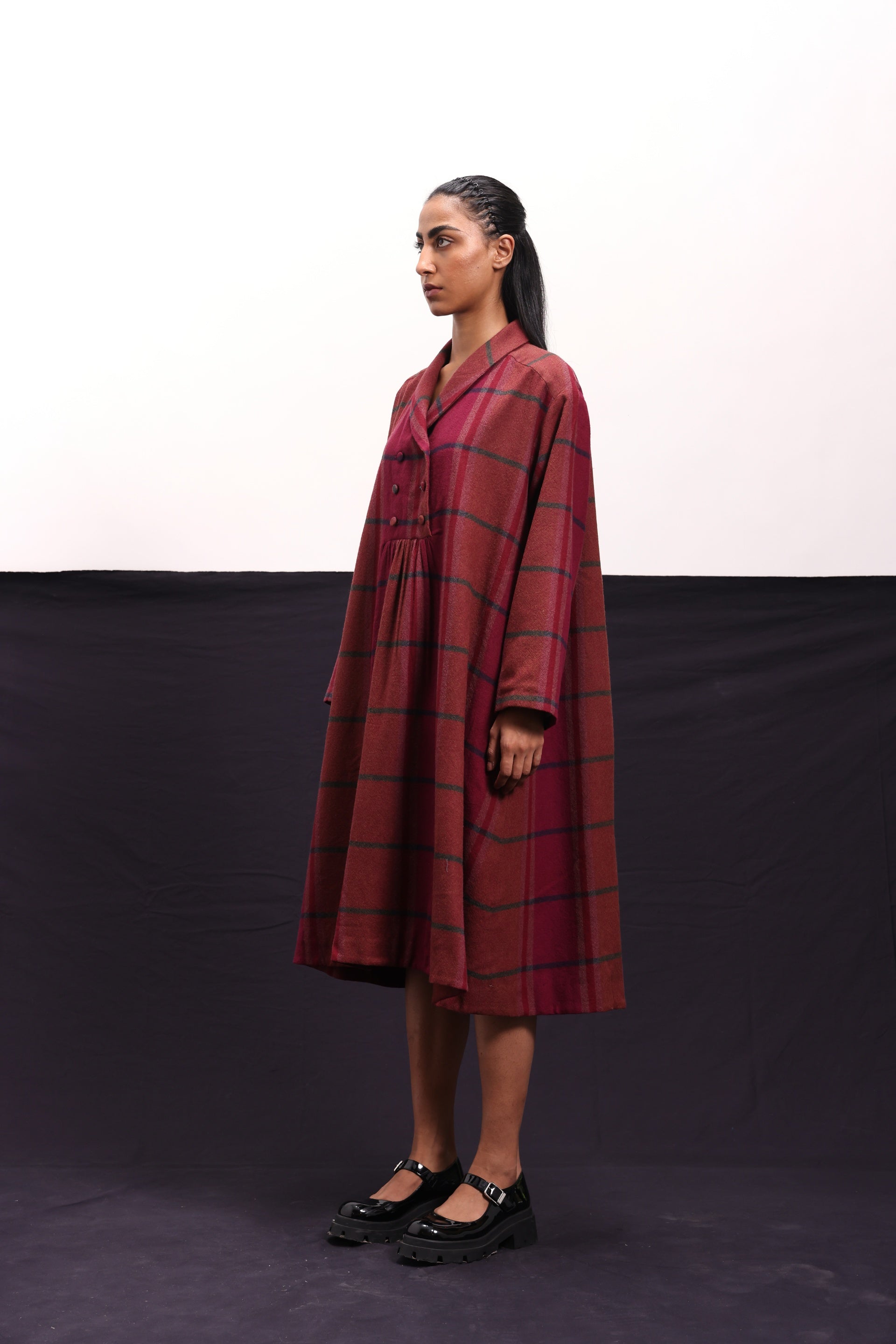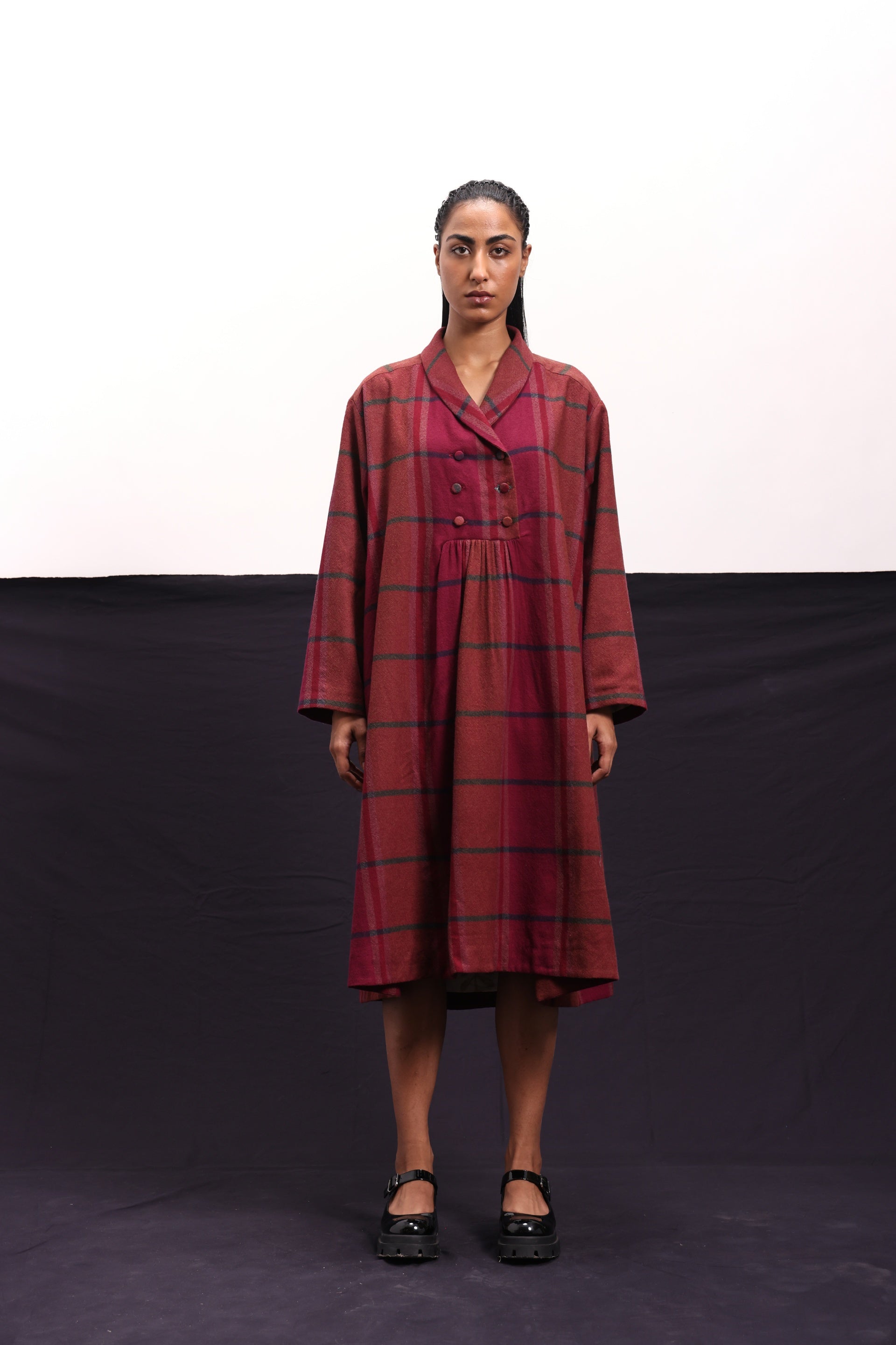 Midi length jacket - dress with shawl collar constructed in wool checks. Comes with an attached hand block printed silk lining.