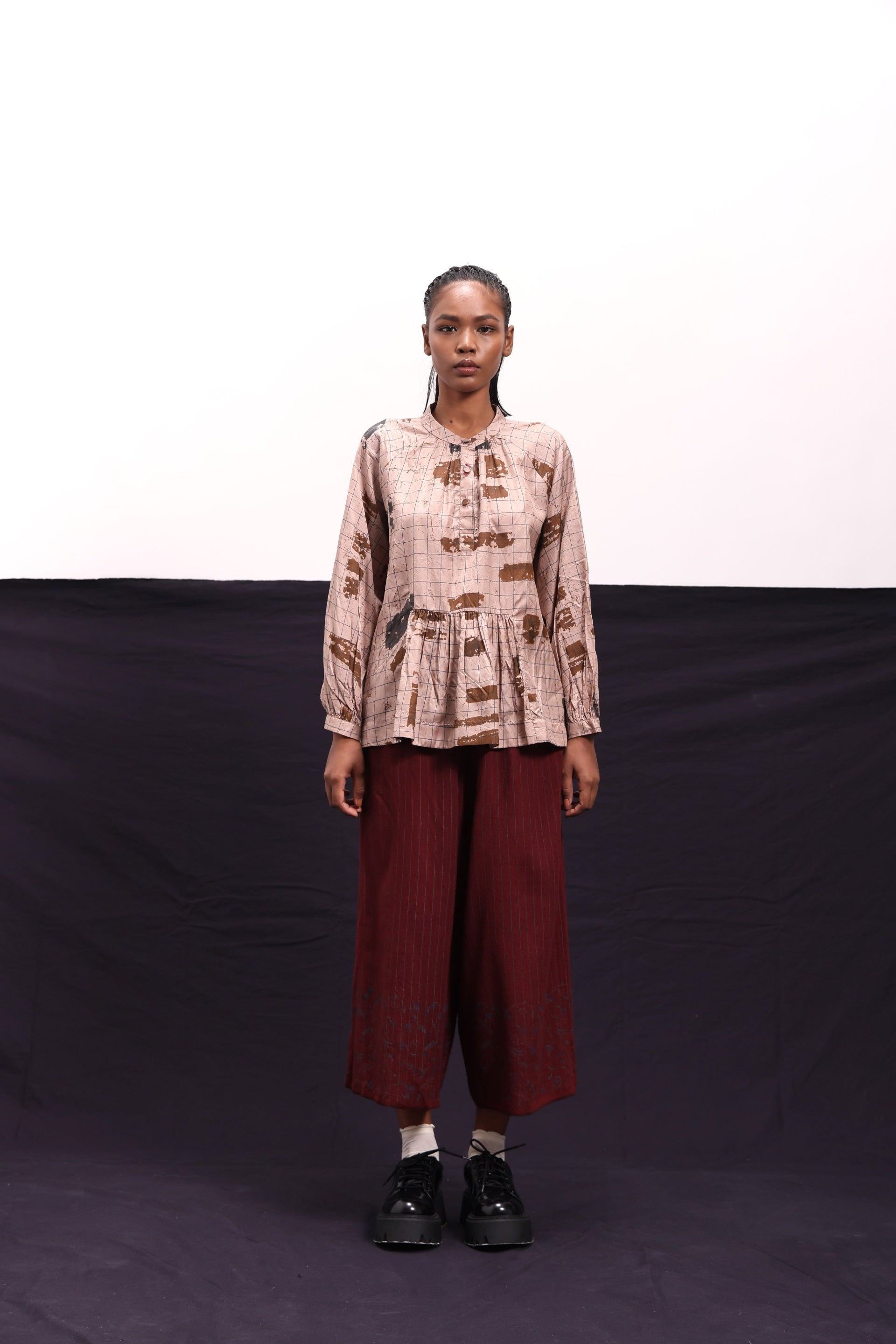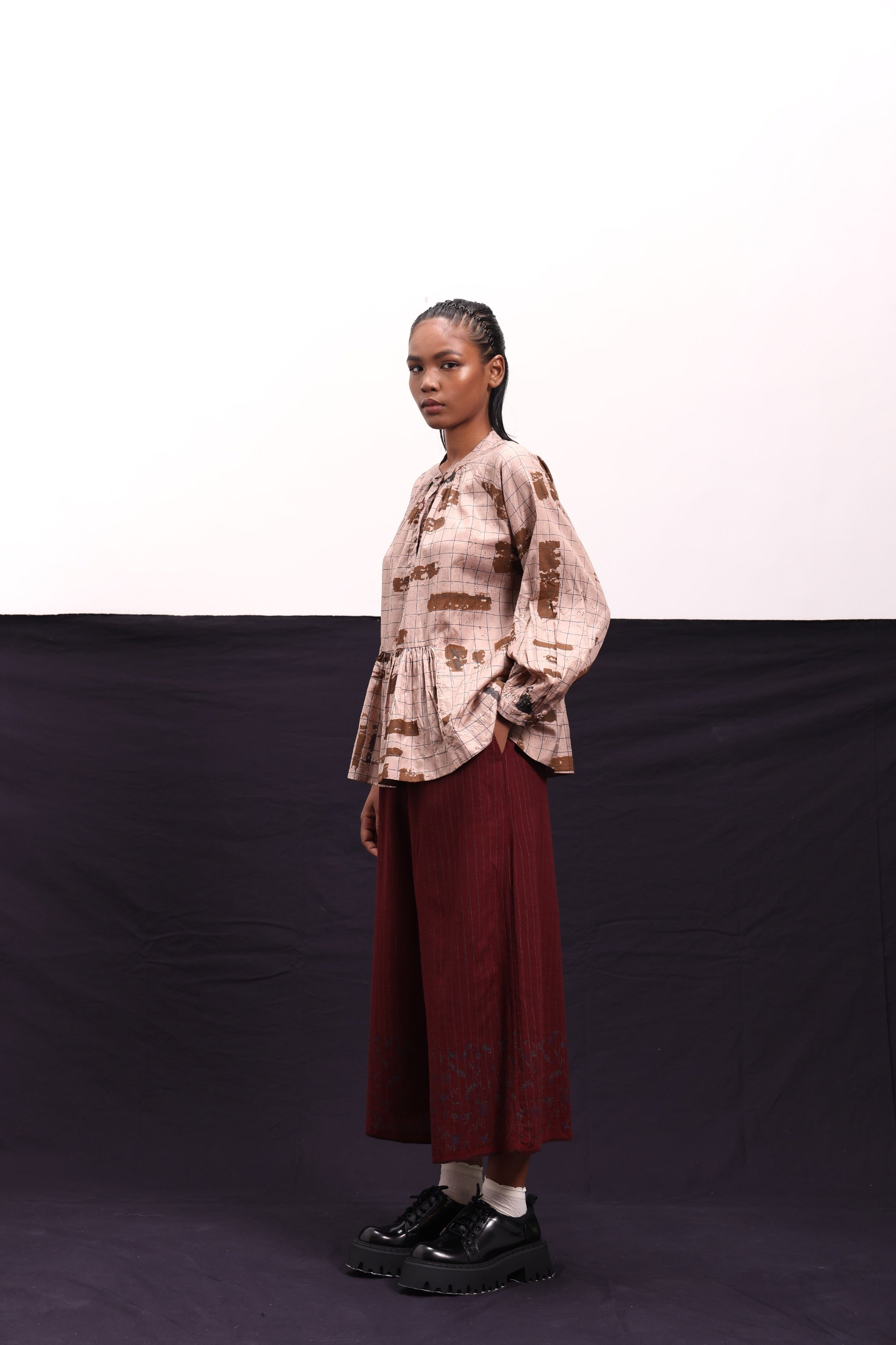 Wide - leg trouser constructed in hand block printed floral and striper mix.