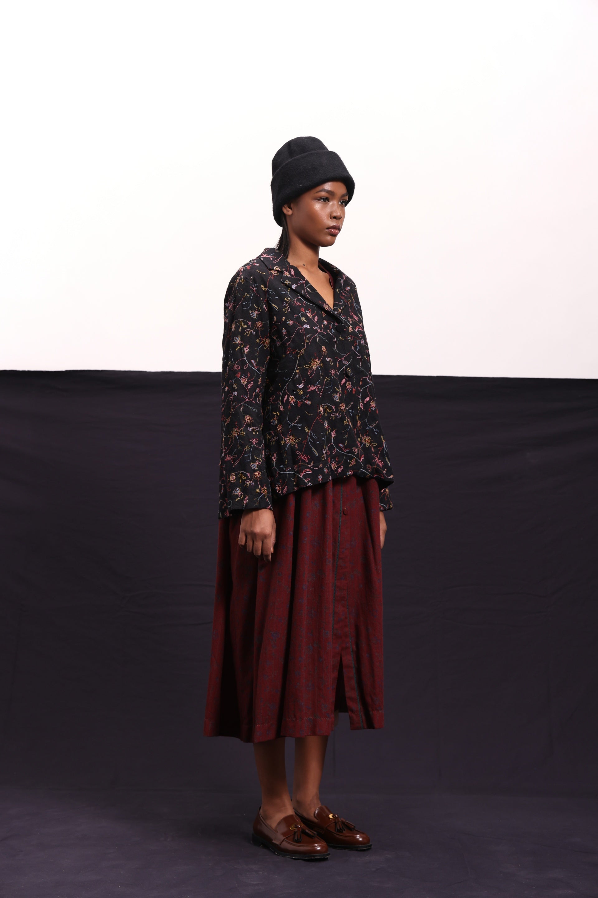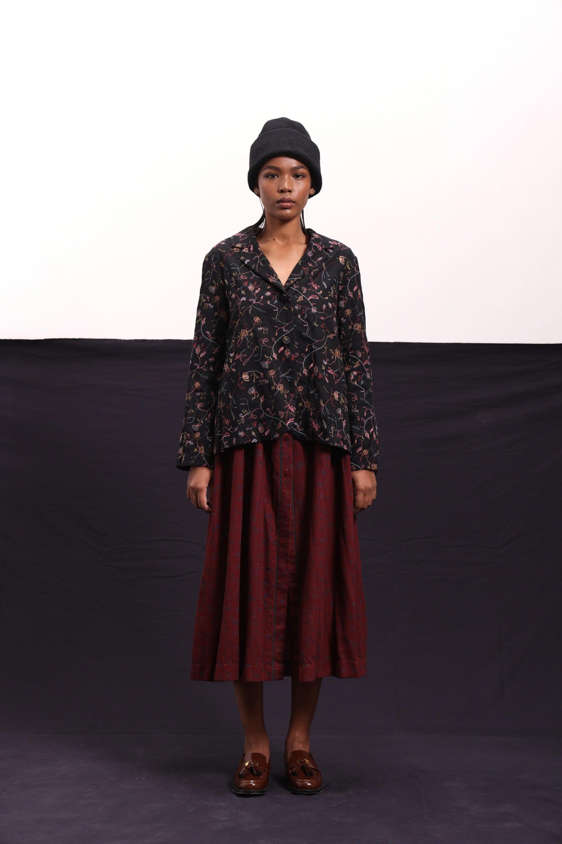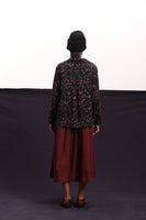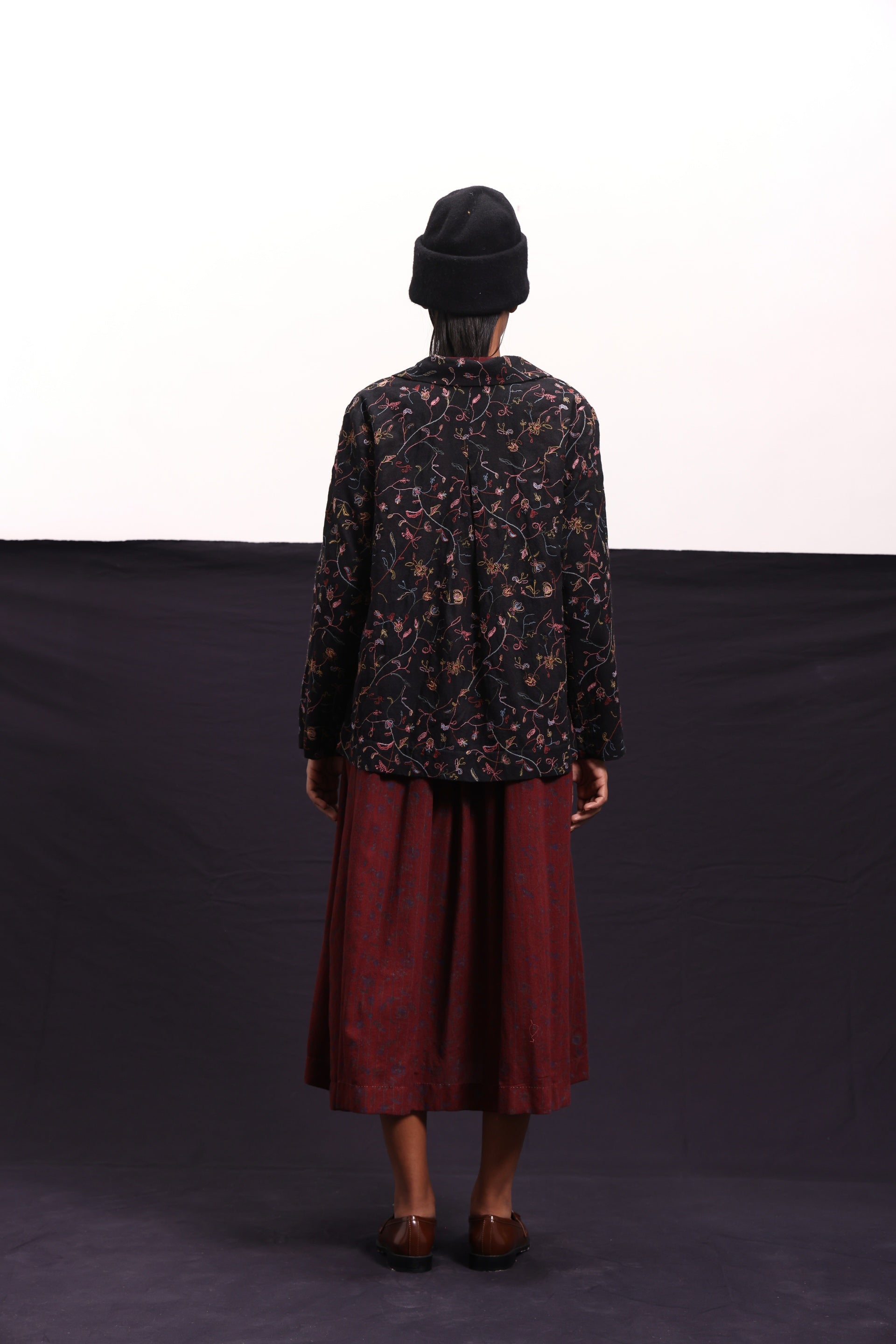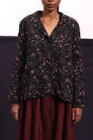 Short jacket constructed in all over floral embroidered wool with centre back pleat detail. Comes with an attached handblock printed silk lining.