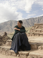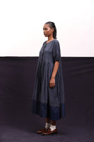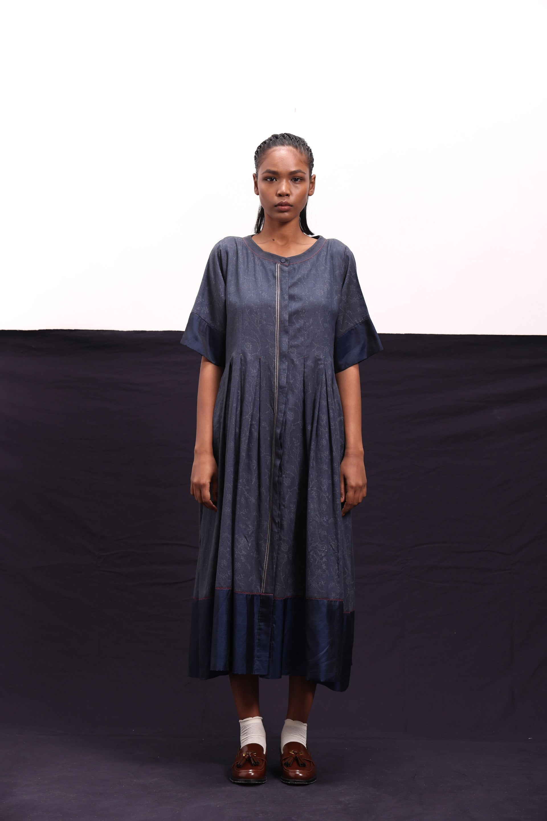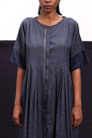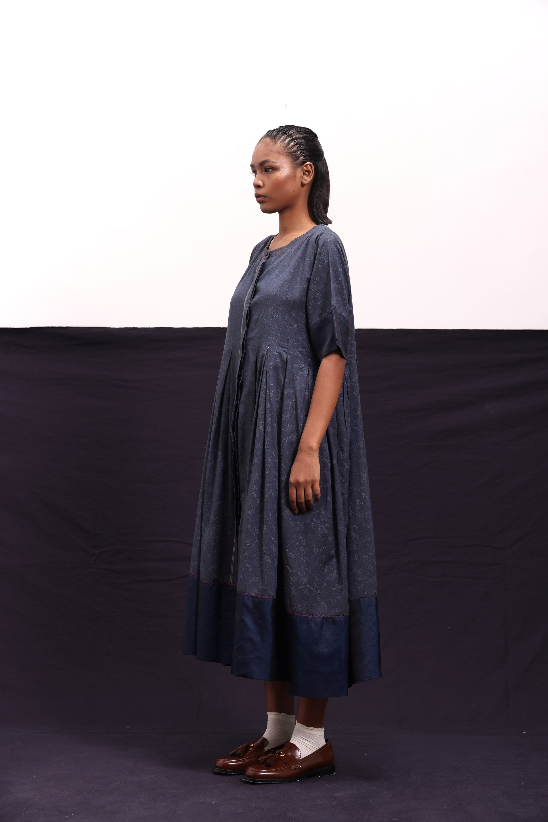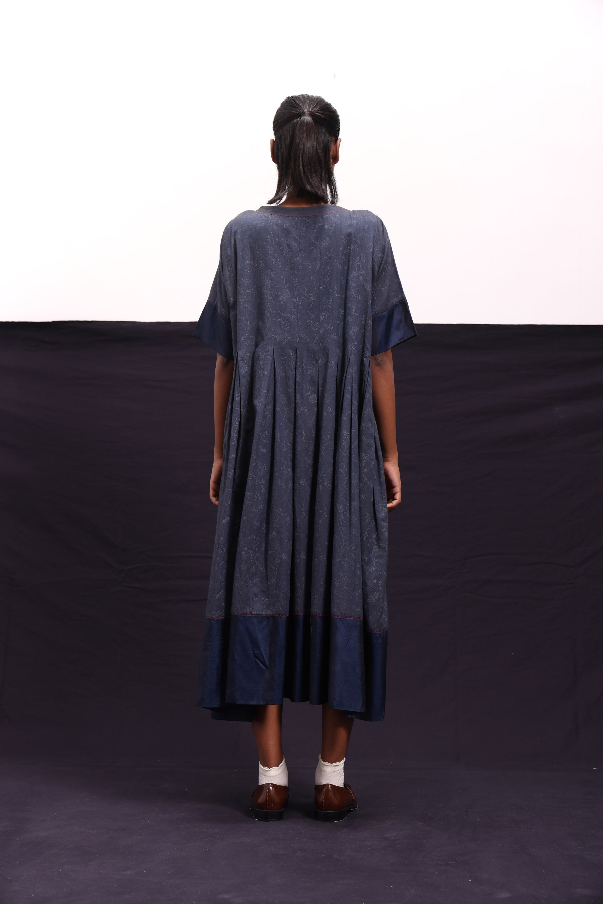 Midi dress with inverted box pleats with lace inserts and silk patches constructed in all over floral hand block print on wool.