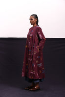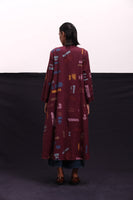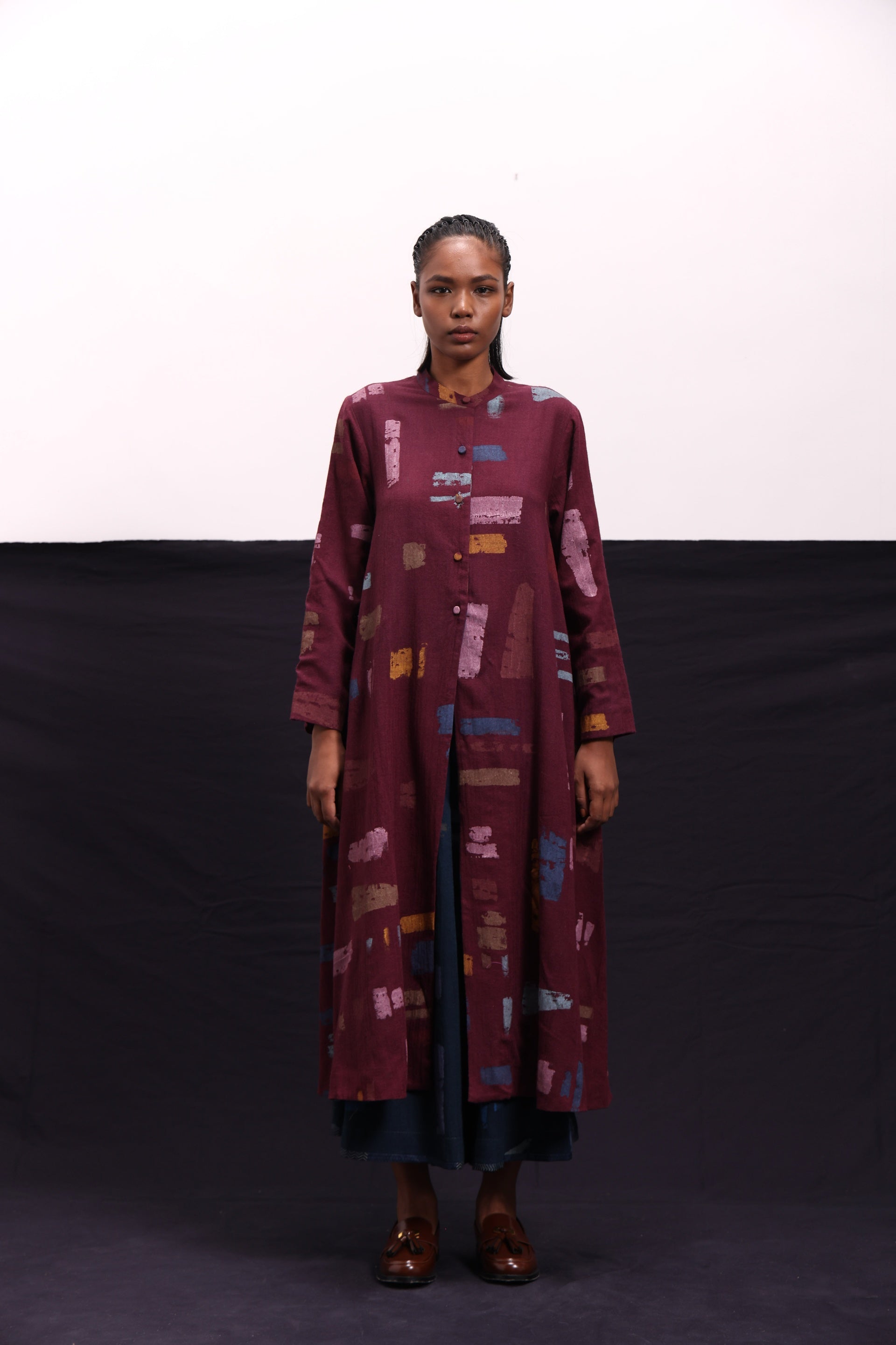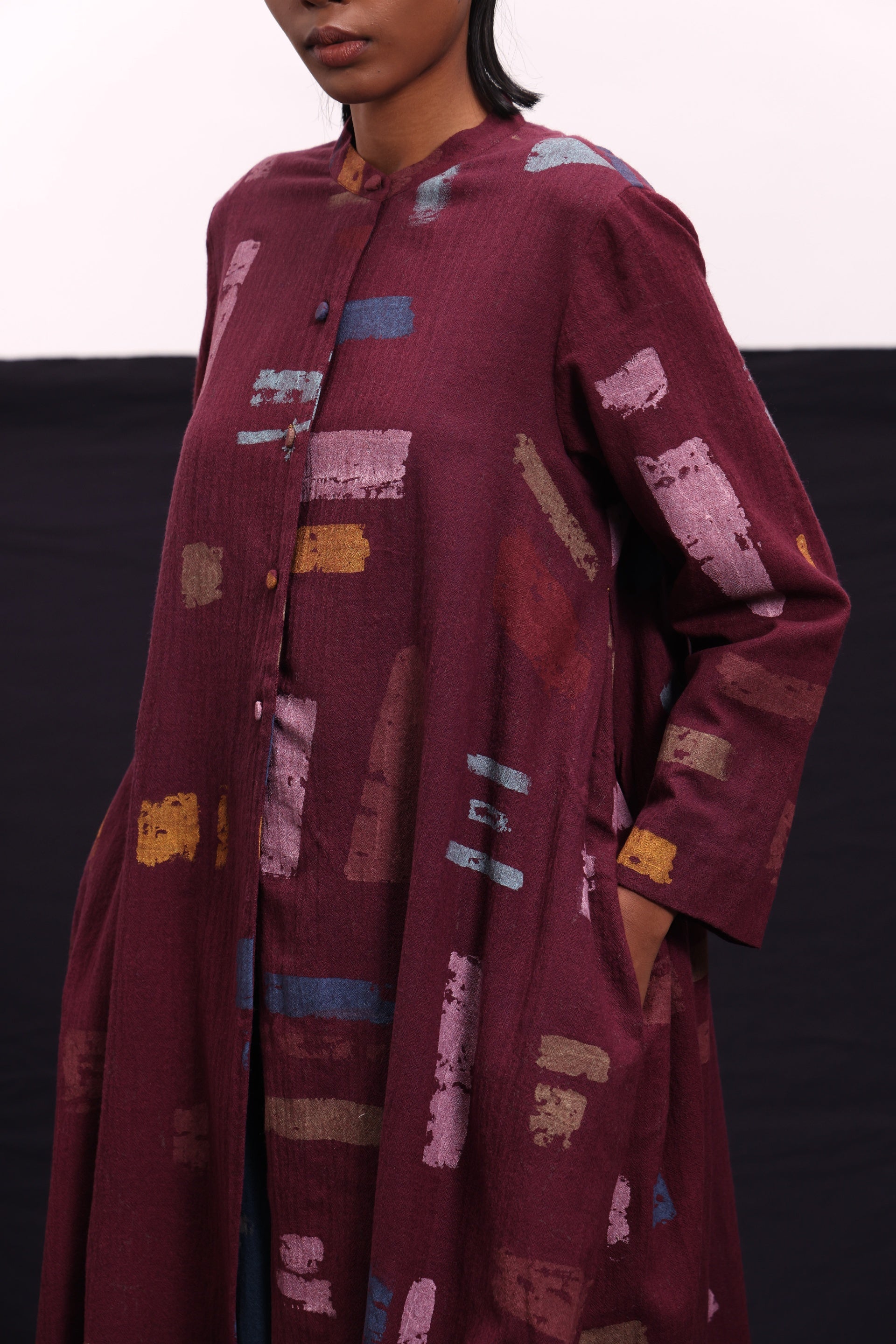 Front open jacket constructed in abstract blocks printed wool. Comes with an attached hand block printed silk lining.