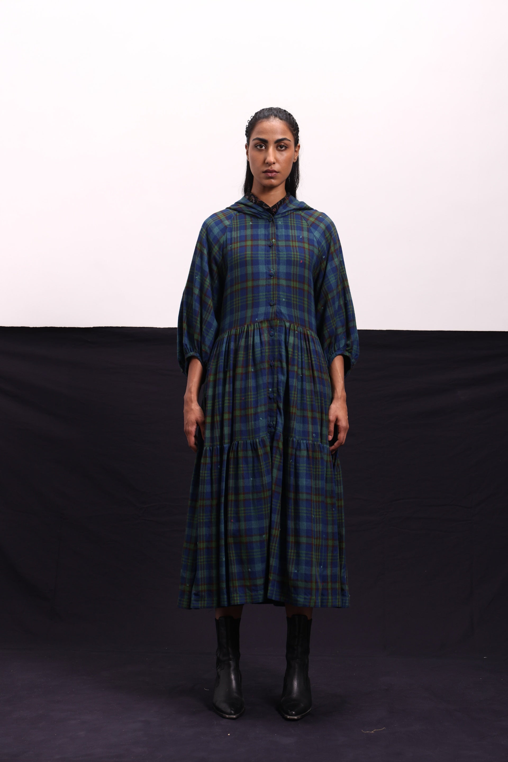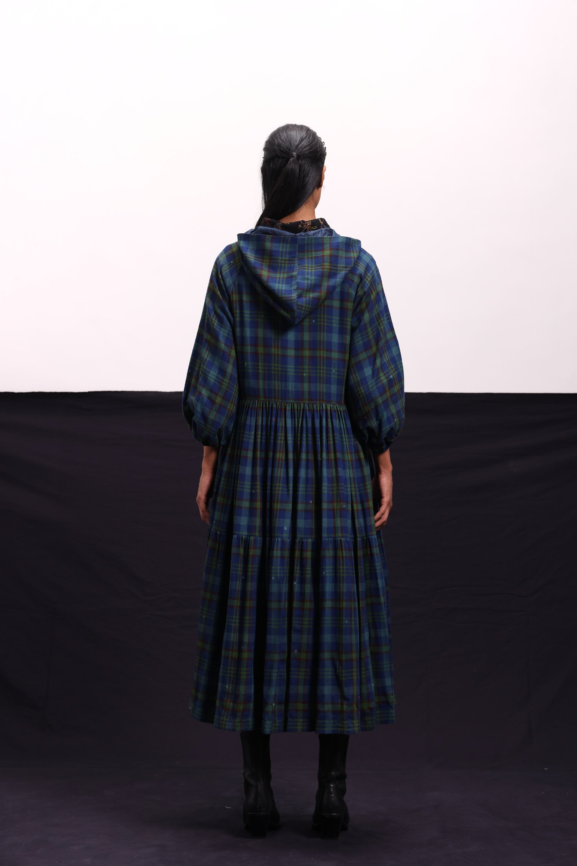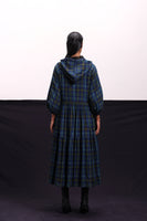 Front - open tiered dress with hoodie constructed in wool checks with hand embroidered kantha detail. Comes with an attached padded cotton gauze lining.