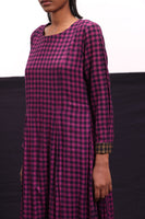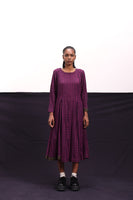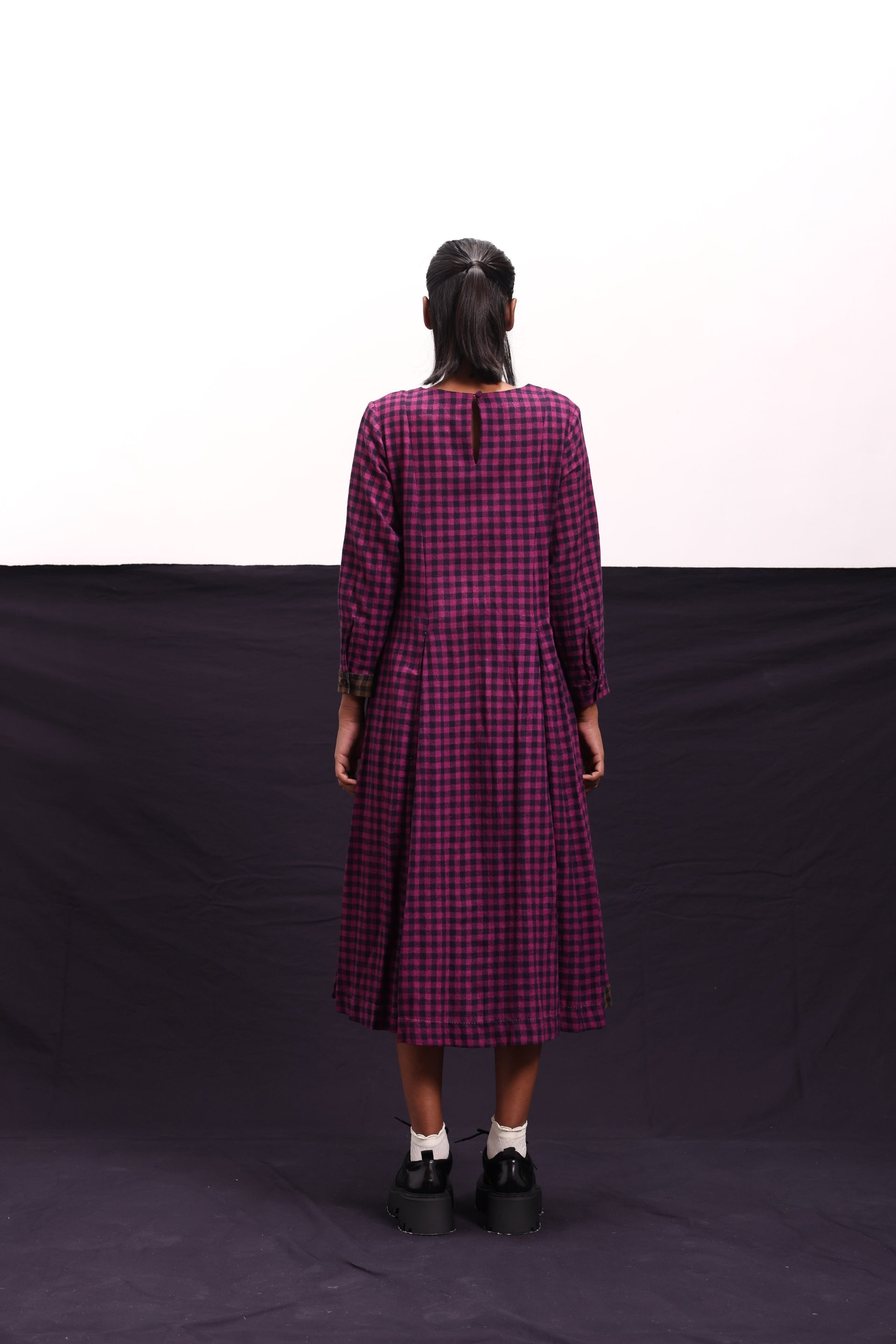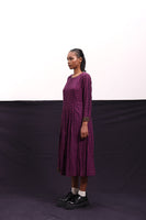 Midi dress with inverted box pleats constructed in abstract blocks printed wool