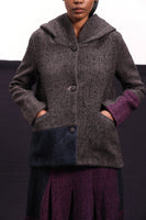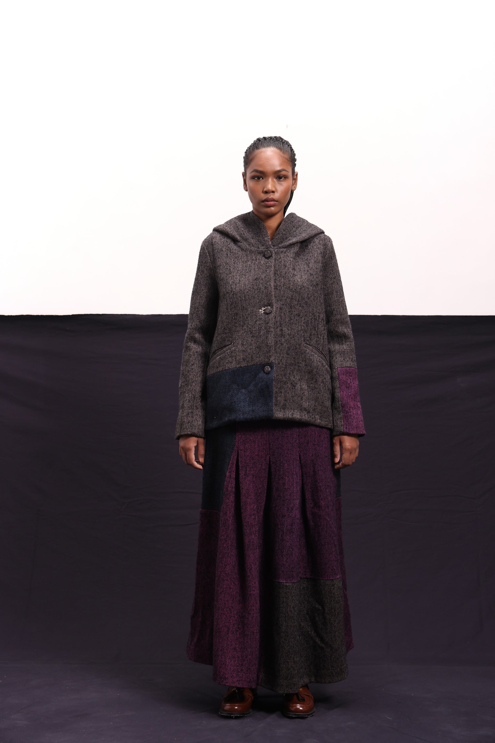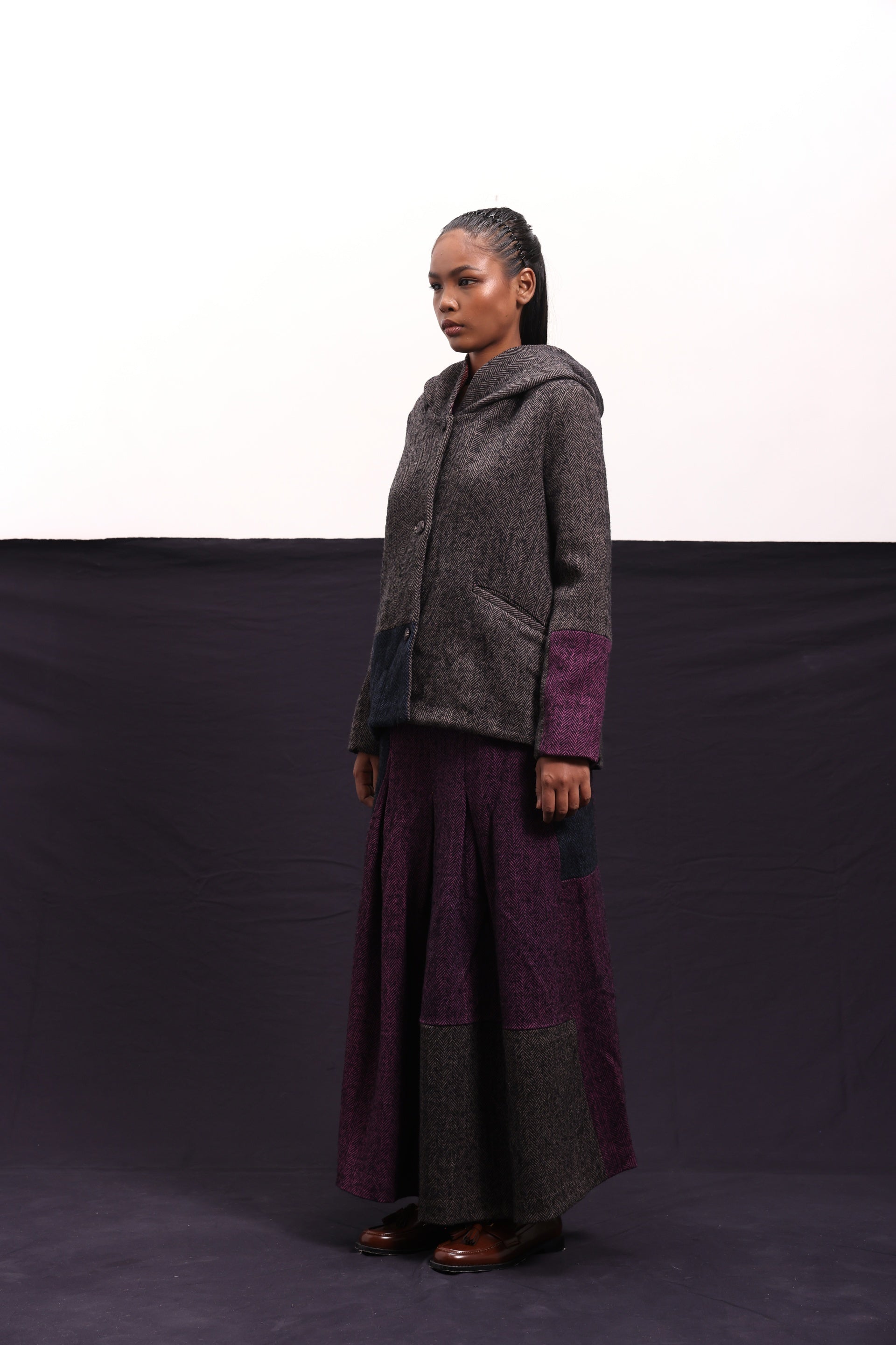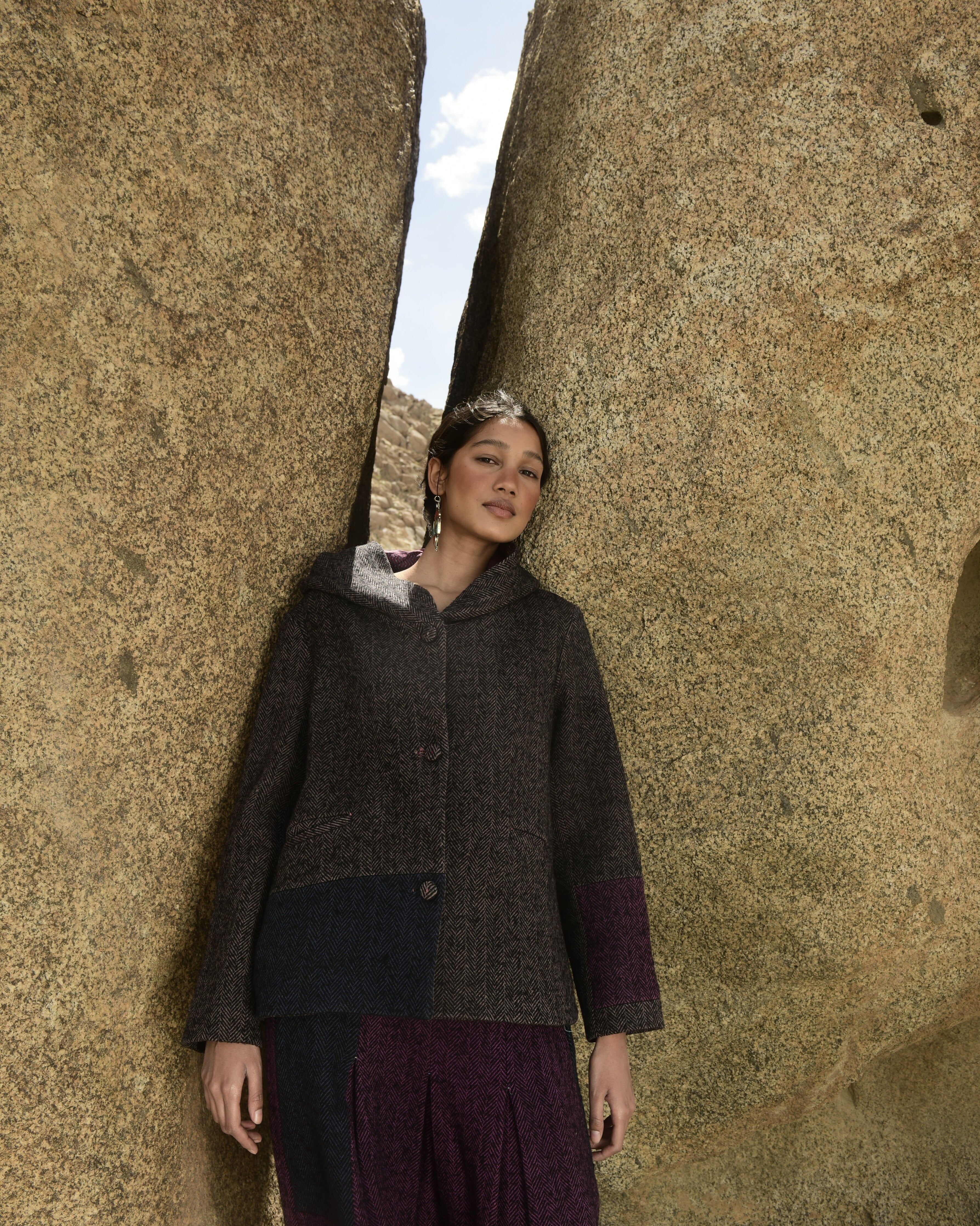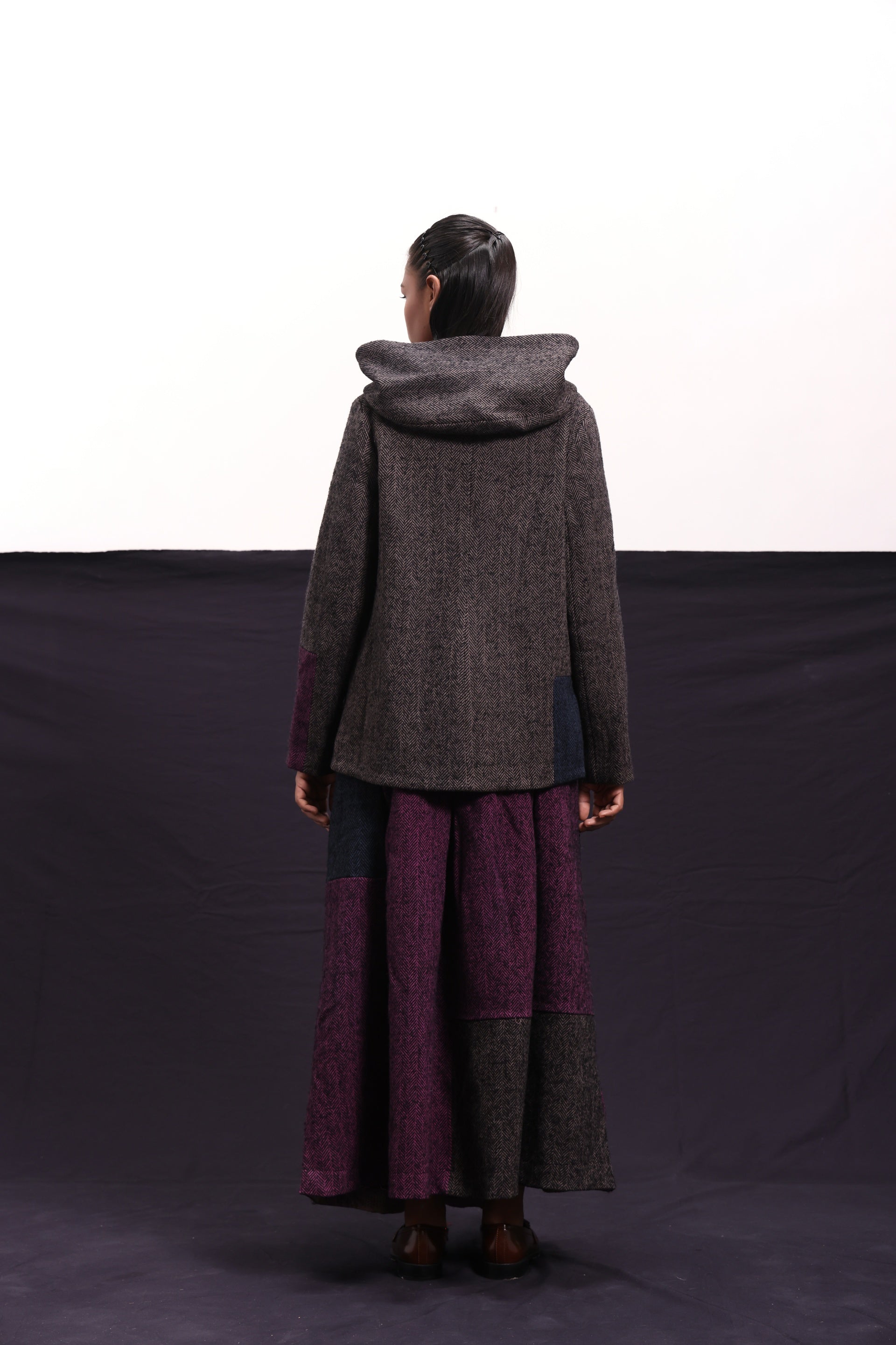 Short hoodie jacket with color block patch inserts constructed in broken twill weave heavy wool. Comes with an attached hand block printed silk lining.