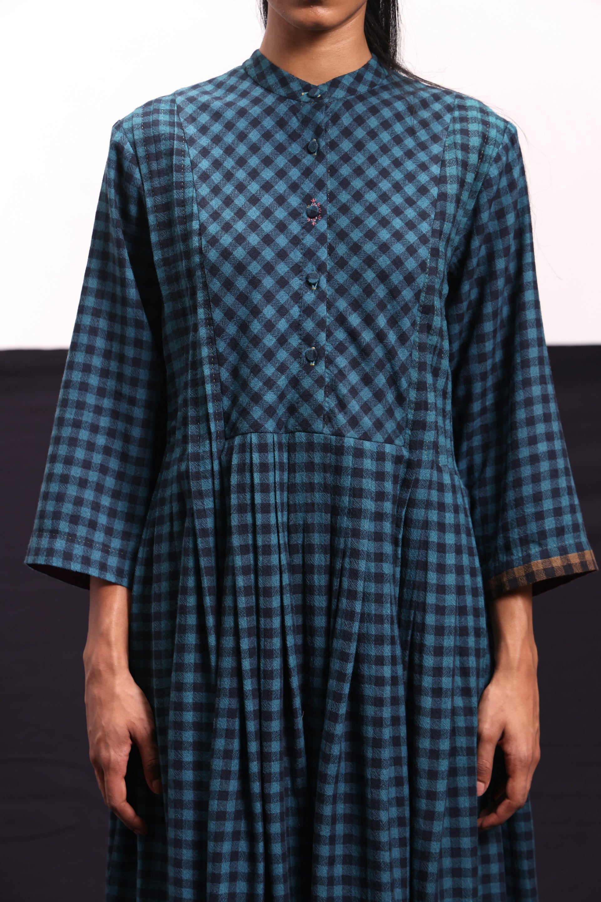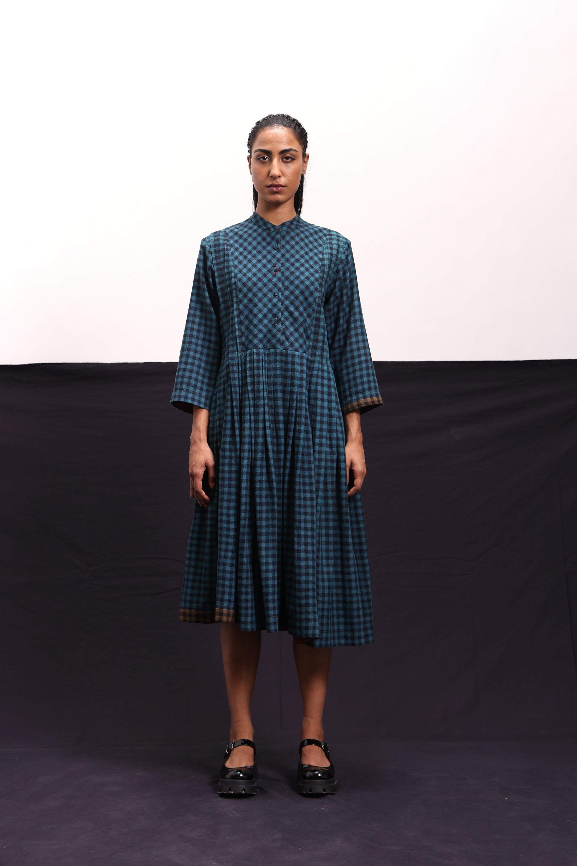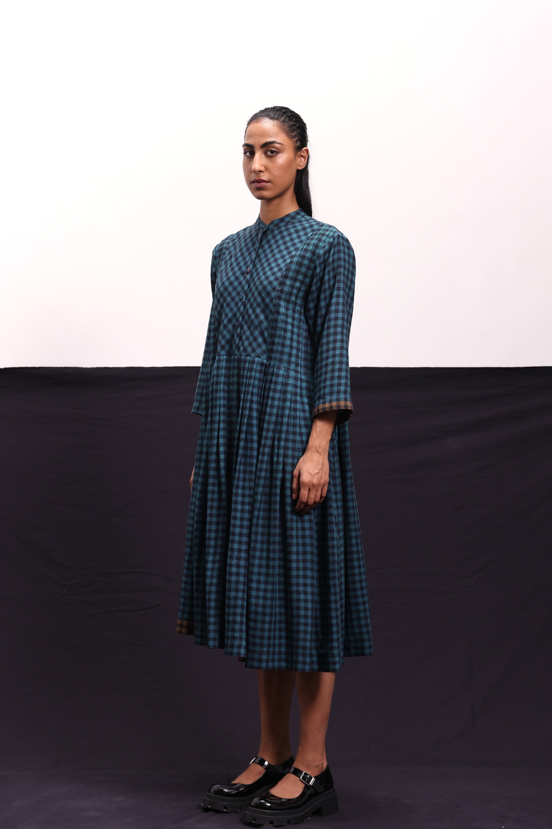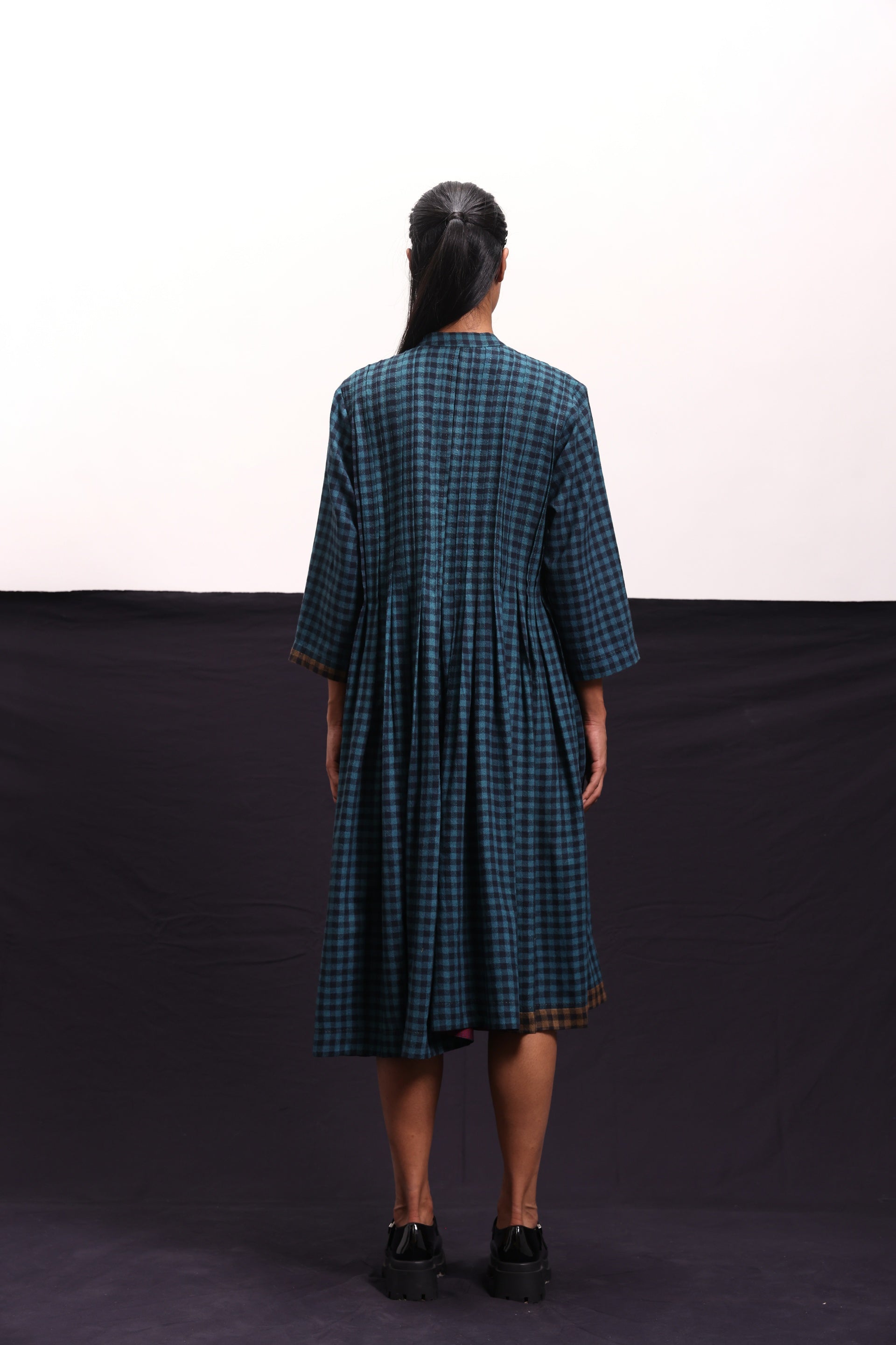 Midi dress with all over pleats constructed in gingham wool checks with color block patches.