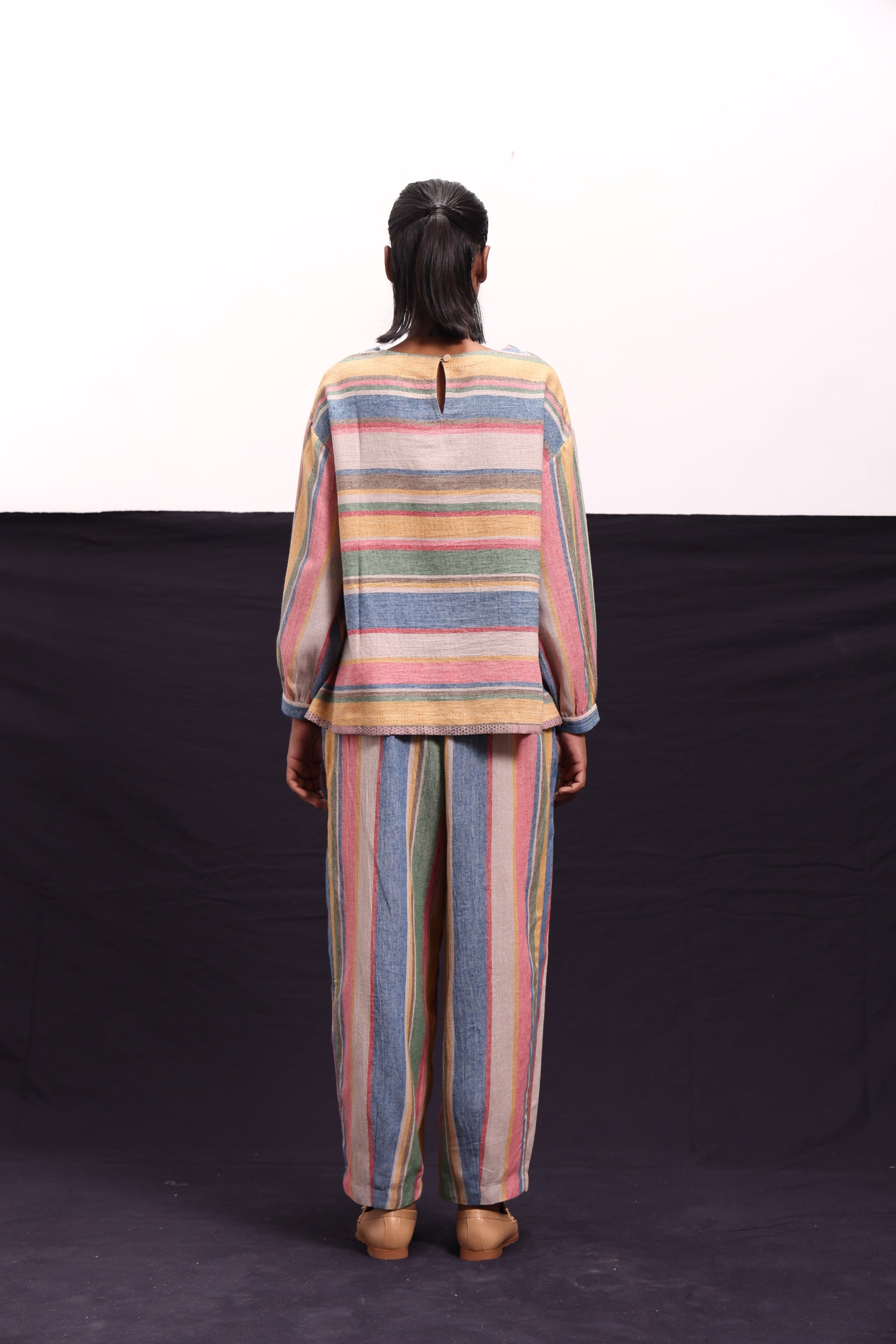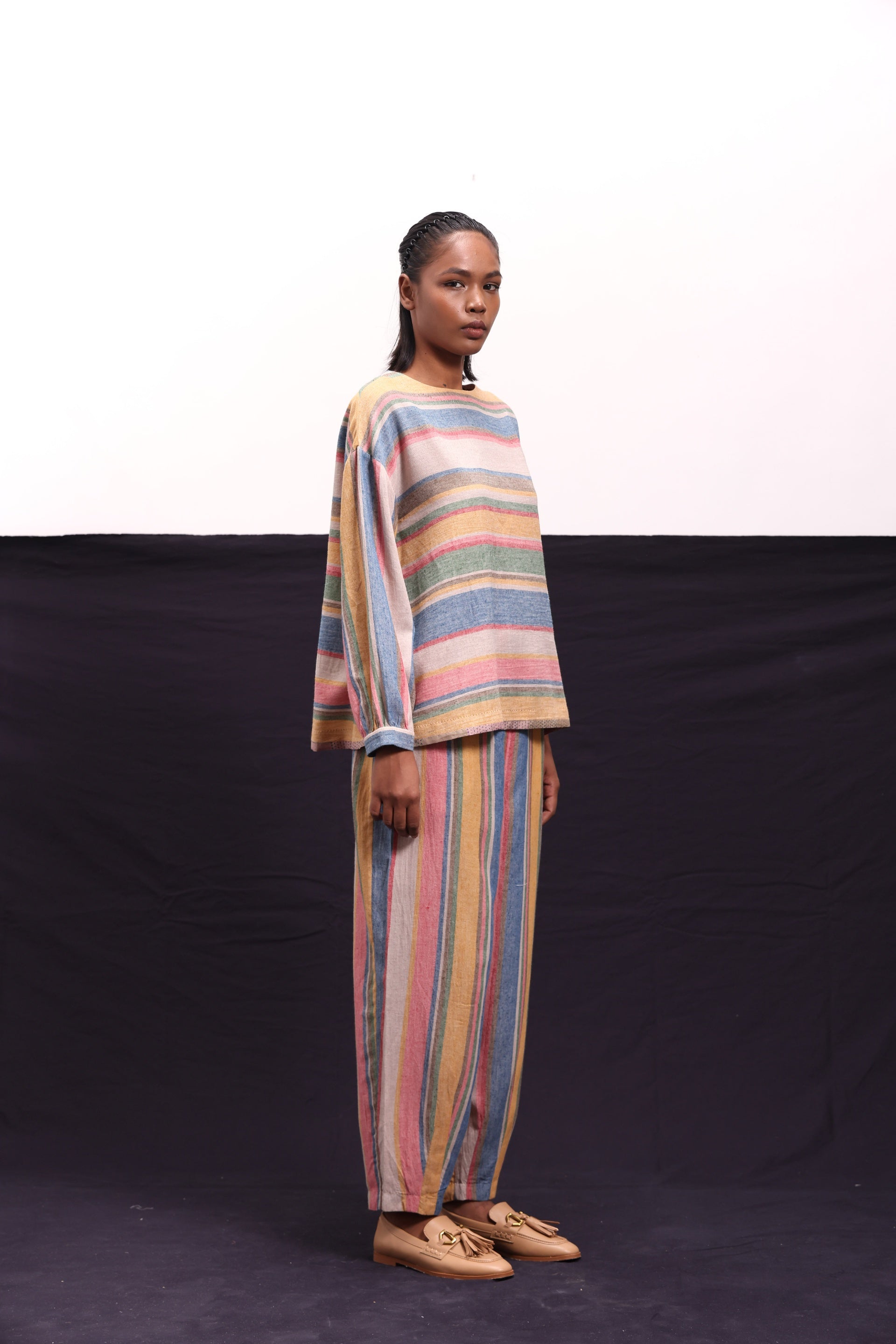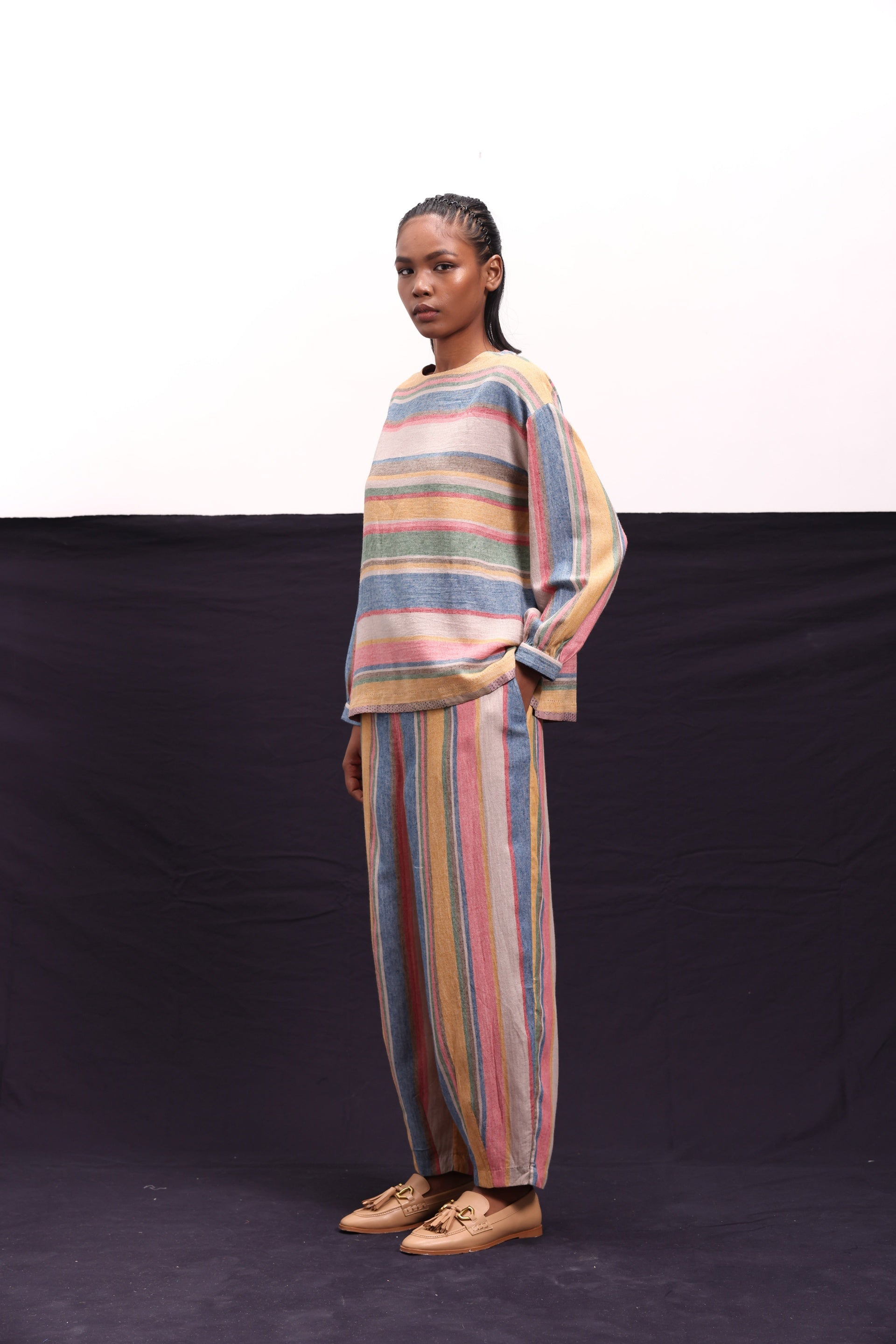 Tapered trouser constructed in all over multistriper wool.